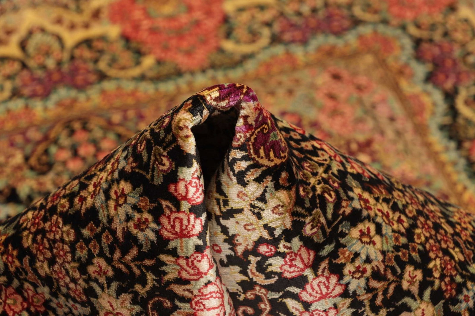 Der Ghom Teppich ist aus hochwertiger Seide gefertigt, einem Material, das für seine glänzende Oberfläche und seine luxuriöse Haptik bekannt ist. Seidenteppiche zeichnen sich durch ihre feine Textur und die lebendigen Farben aus, die durch die Stoffeigenschaften besonders zur Geltung kommen. Die handgeknüpfte Technik verleiht dem Teppich eine hohe Knotendichte, was nicht nur die Haltbarkeit erhöht, sondern auch die Detailgenauigkeit in den Mustern unterstreicht. Bei Ghom Teppichen wird oft eine Knotendichte von bis zu 1.000.000 Knoten pro Quadratmeter erreicht, was diese Teppiche zu einem der edelsten und präzisesten Darstellungen iranischer Handwerkskunst macht.