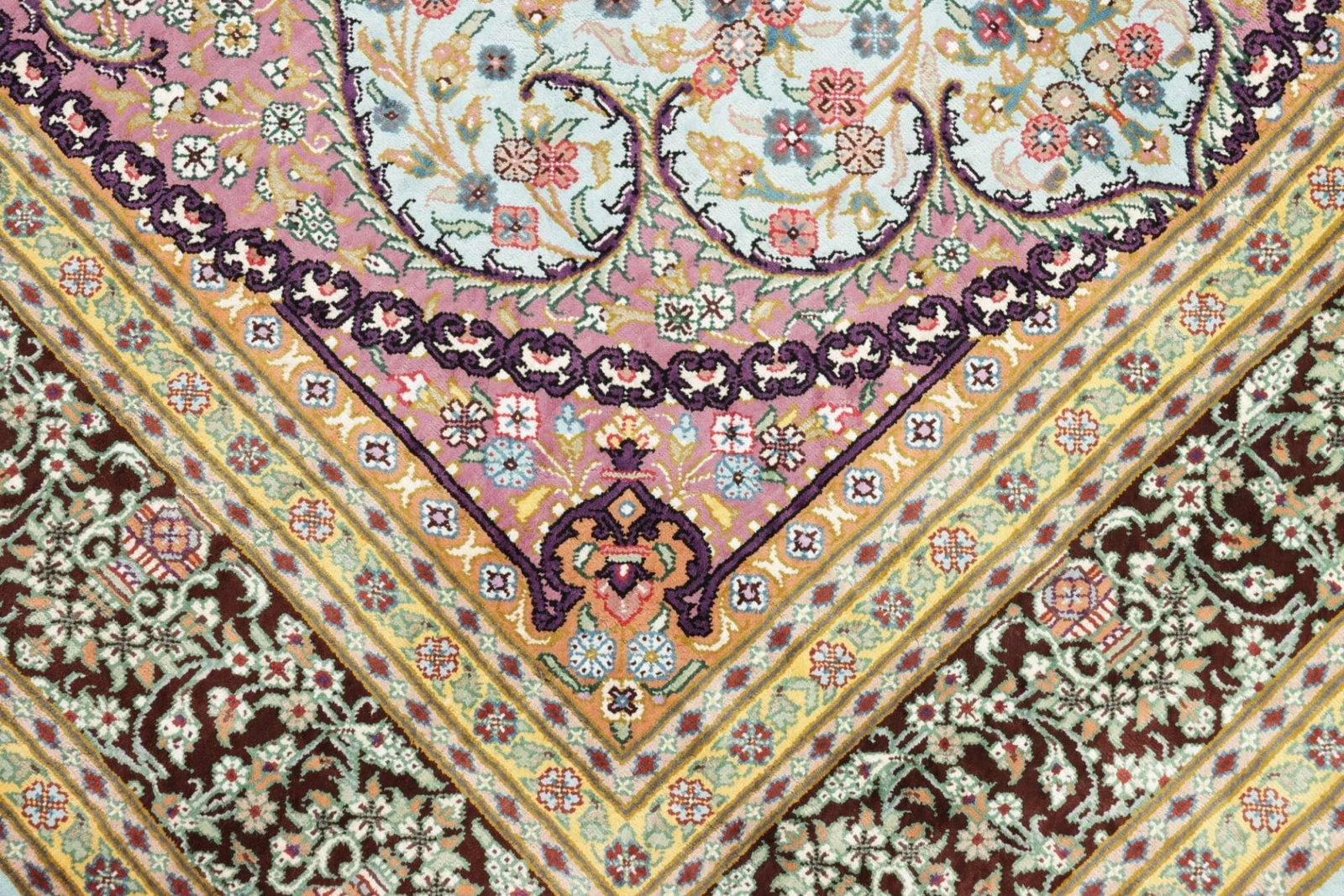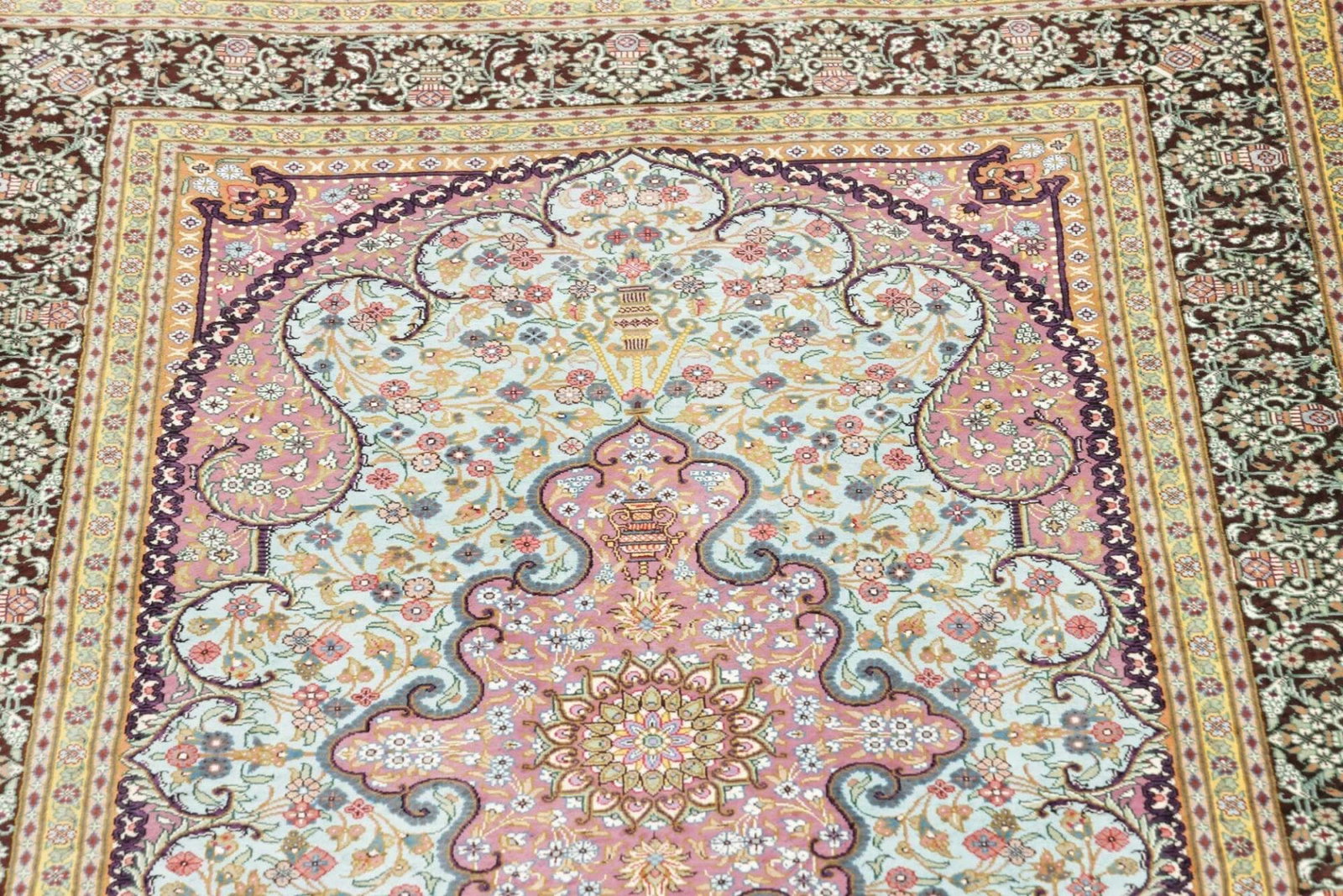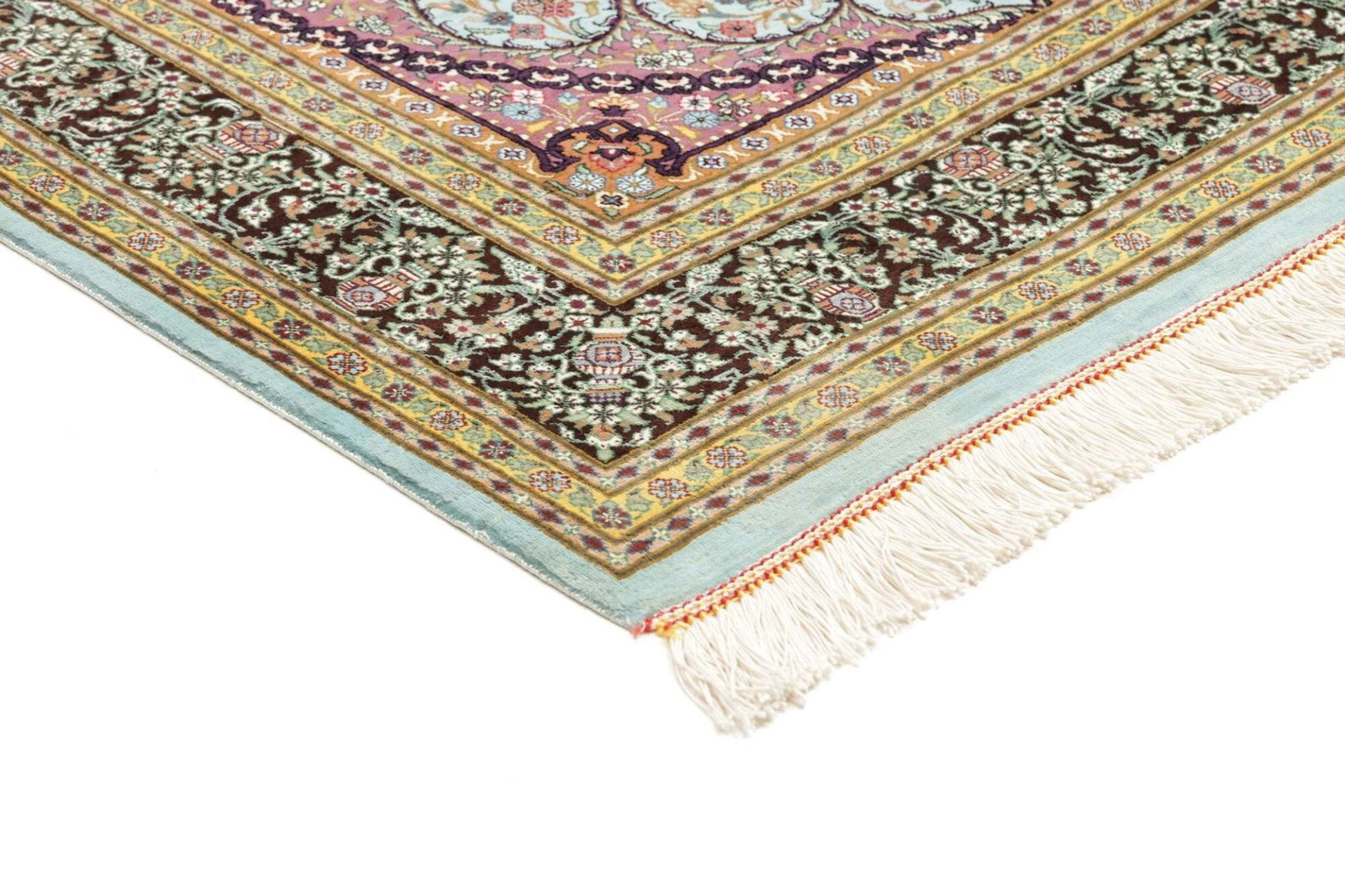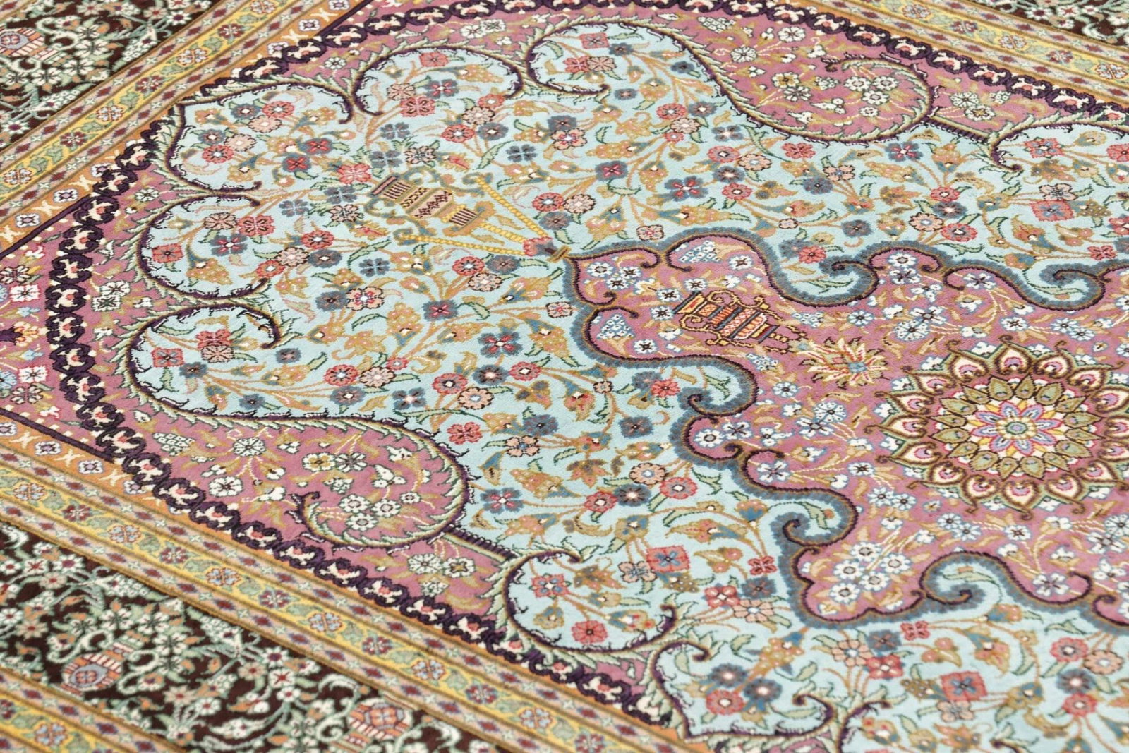 Der Ghom Teppich wird aus 100% hochwertiger Seide gefertigt. Seide ist bekannt für Ihre außergewöhnliche Weichheit und ihren besonderen Glanz, der jedem Raum Eleganz verleiht. Teppiche aus Seide sind besonders geschätzt, da sie mit der Zeit an Charakter und Schönheit gewinnen. Die Knotendichte eines handgeknüpften Teppichs wirkt sich direkt auf die Qualität und Langlebigkeit des Teppichs aus. Bei diesem Ghom Teppich ist die Knotendichte sehr hoch, was zu einem detailgetreuen und exquisit verarbeiteten floralen Muster führt, das in jeder Hinsicht beeindruckt.