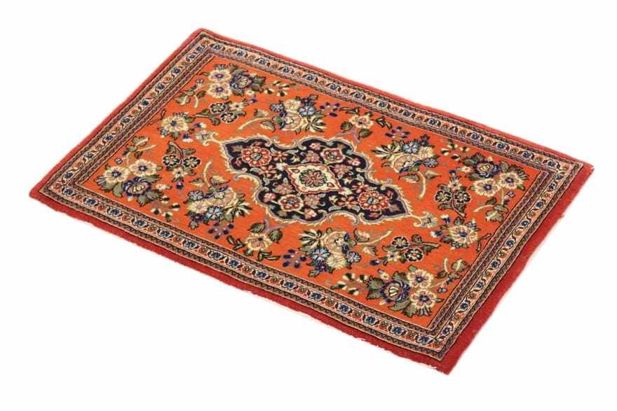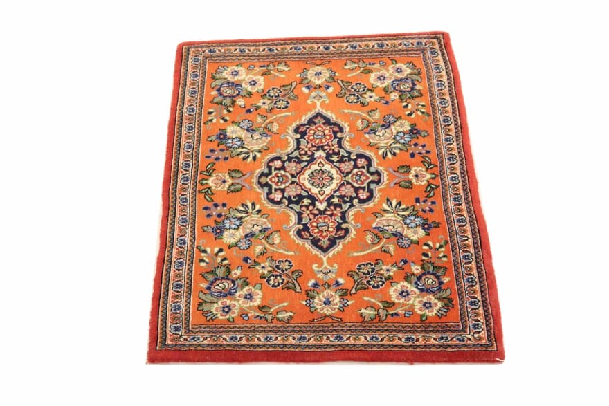 | Ghom-Teppich | Größe: 87×61 cm | Knotendichte: 200.000 – 250.000 Knoten/m² | Material: Handgesponnene Wolle und Baumwolle | Farbe: Rot/Orange | Zustand: Neu | Verarbeitung: Handgeknüpft | Herkunft: Iran/Persien | Dicke: ca. 10 mm | Gewicht: ca. 2 kg