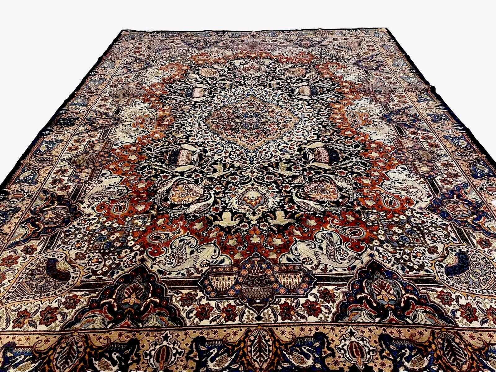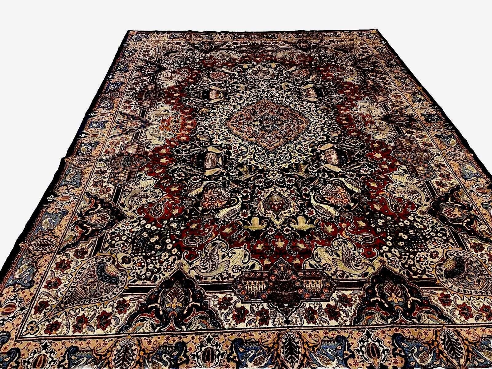 Die Knotendichte dieses dekorativen Teppichs ist besonders hoch, was für seine Langlebigkeit und Widerstandsfähigkeit spricht. Ein hoher Knotenschwund sorgt dafür, dass die feinen Muster und die lebendigen Farben auch nach vielen Jahren noch erstrahlen wie am ersten Tag. Die Herkunft des Teppichs aus dem Iran, einer der bekanntesten Regionen für die Teppichherstellung, verleiht ihm zudem einen besonderen kulturellen Wert.