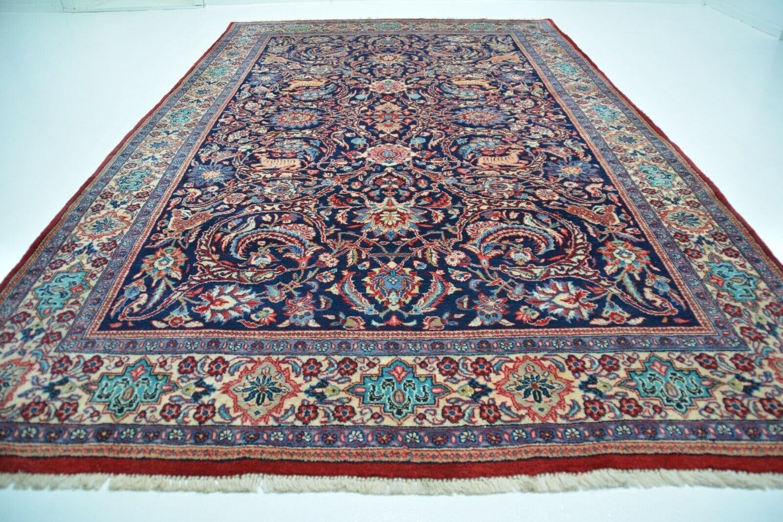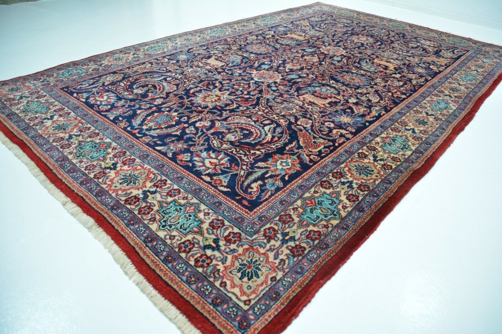 Handgeknüpfter antiker Sarugh Teppich | Größe: ca. 302 x 187 cm | Material: 90% Wolle, 10% Baumwolle | Zustand: Gut, professionell gereinigt | Knotendichte: Hochwertige Verarbeitung | Muster: Orientalisch, seltene Designs | Farbe: Mehrfarbig, schöne Farbgebung | Für Fußbodenheizung geeignet | Stil: Antik, rechteckig