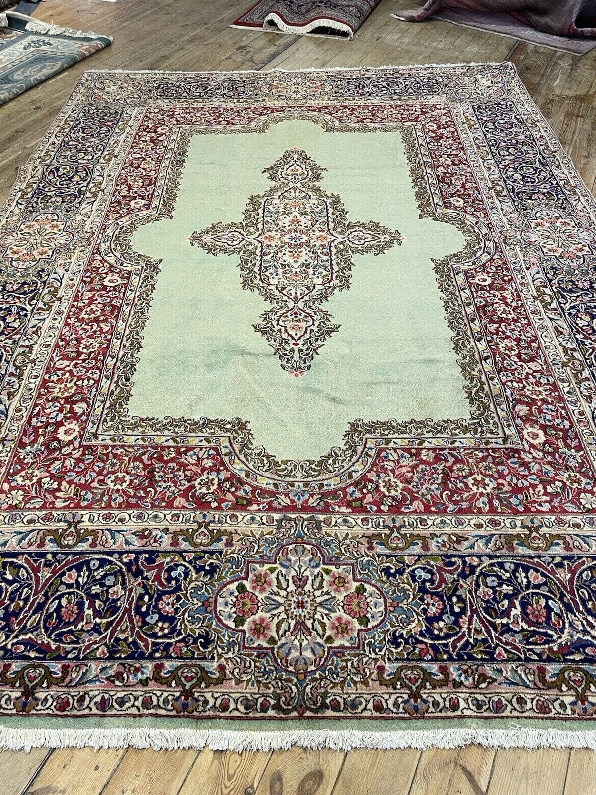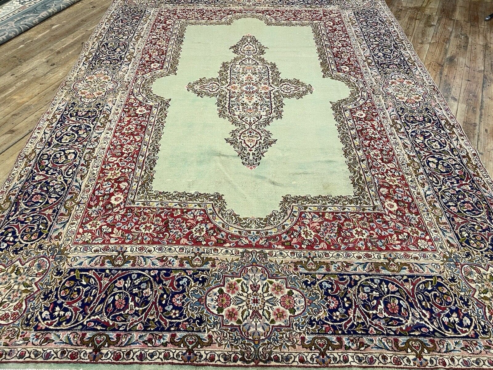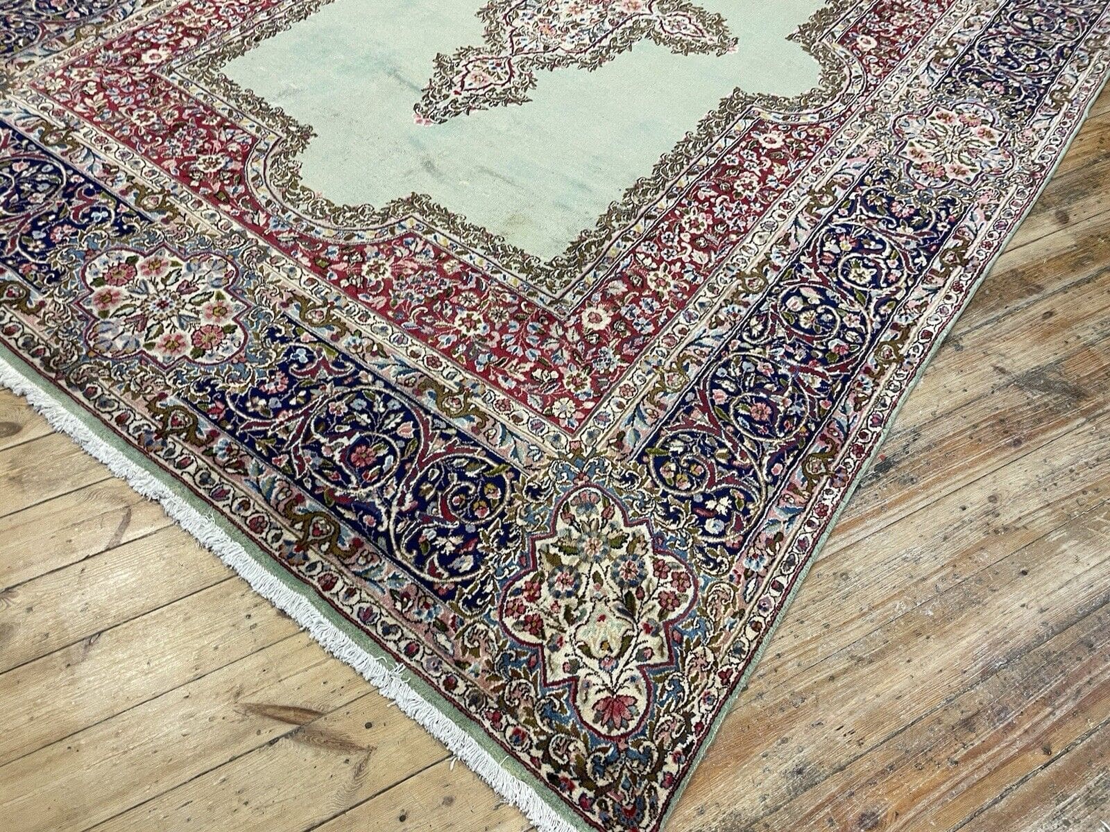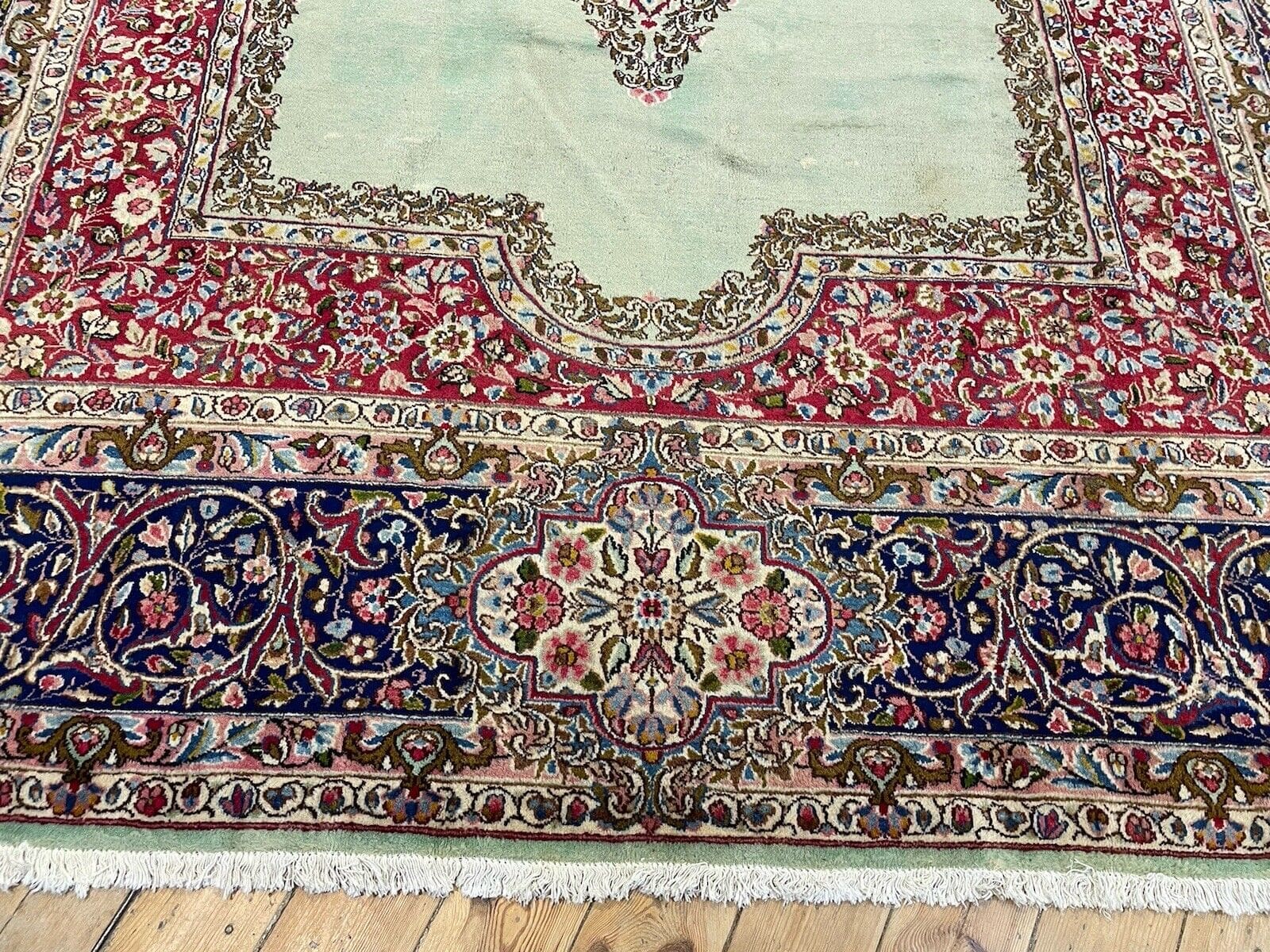 Antiker Kerman Perserteppich | Handgeknüpft aus 100% reiner Schurwolle | Florhöhe: 4mm | Größe: 350×250 cm | Muster: Persisches Blumen Garten und Spiegel Muster | Zustand: Gebraucht, sehr gut erhalten | Epoche: Frühes 20. Jahrhundert (1911-1940) | Stil: Klassisch, orientalisch | Farbe: Grün | Ideal für Wohnzimmer, Schlafzimmer und Esszimmer