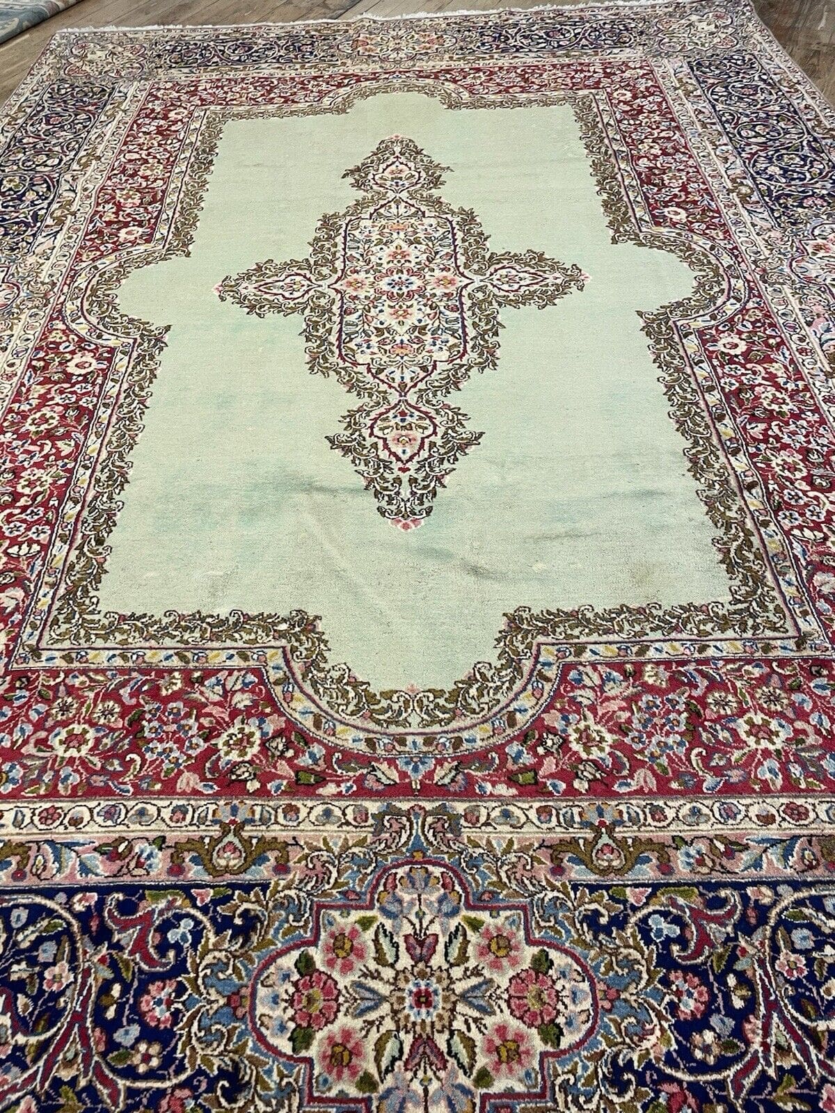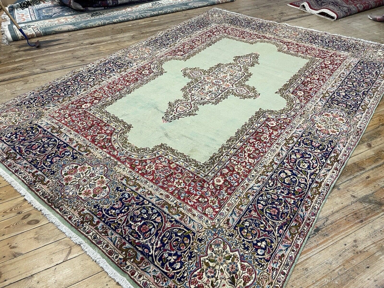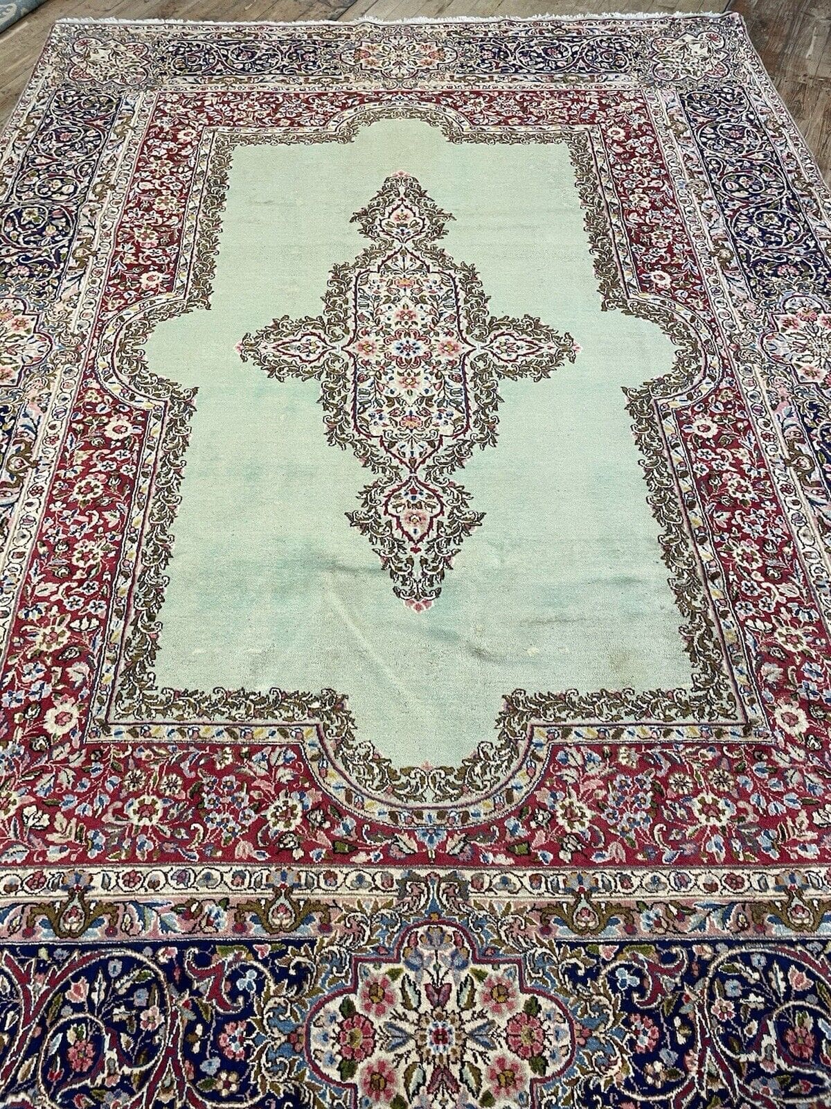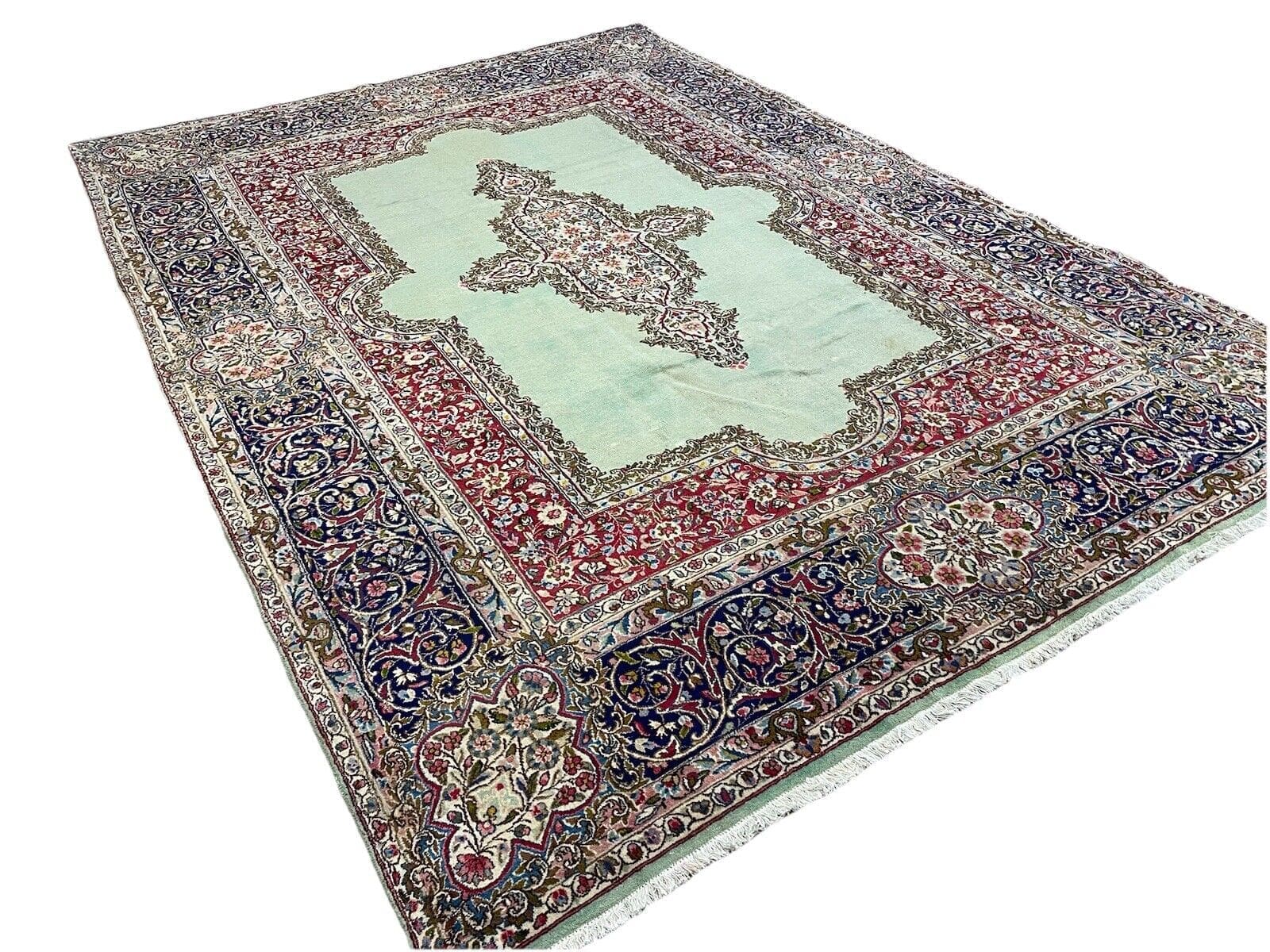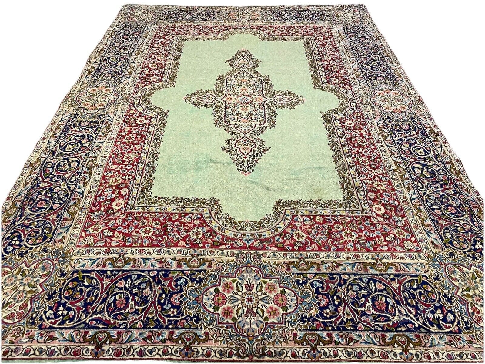 Antiker Kerman Perserteppich | Handgeknüpft aus 100% reiner Schurwolle | Florhöhe: 4mm | Größe: 350×250 cm | Muster: Persisches Blumen Garten und Spiegel Muster | Zustand: Gebraucht, sehr gut erhalten | Epoche: Frühes 20. Jahrhundert (1911-1940) | Stil: Klassisch, orientalisch | Farbe: Grün | Ideal für Wohnzimmer, Schlafzimmer und Esszimmer