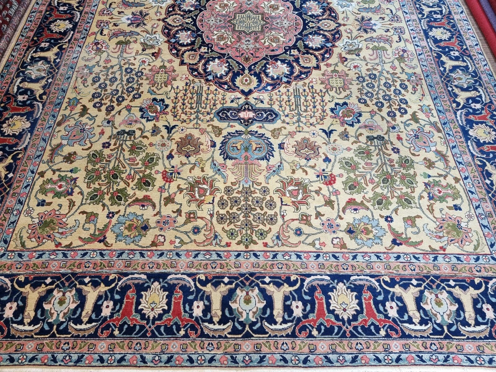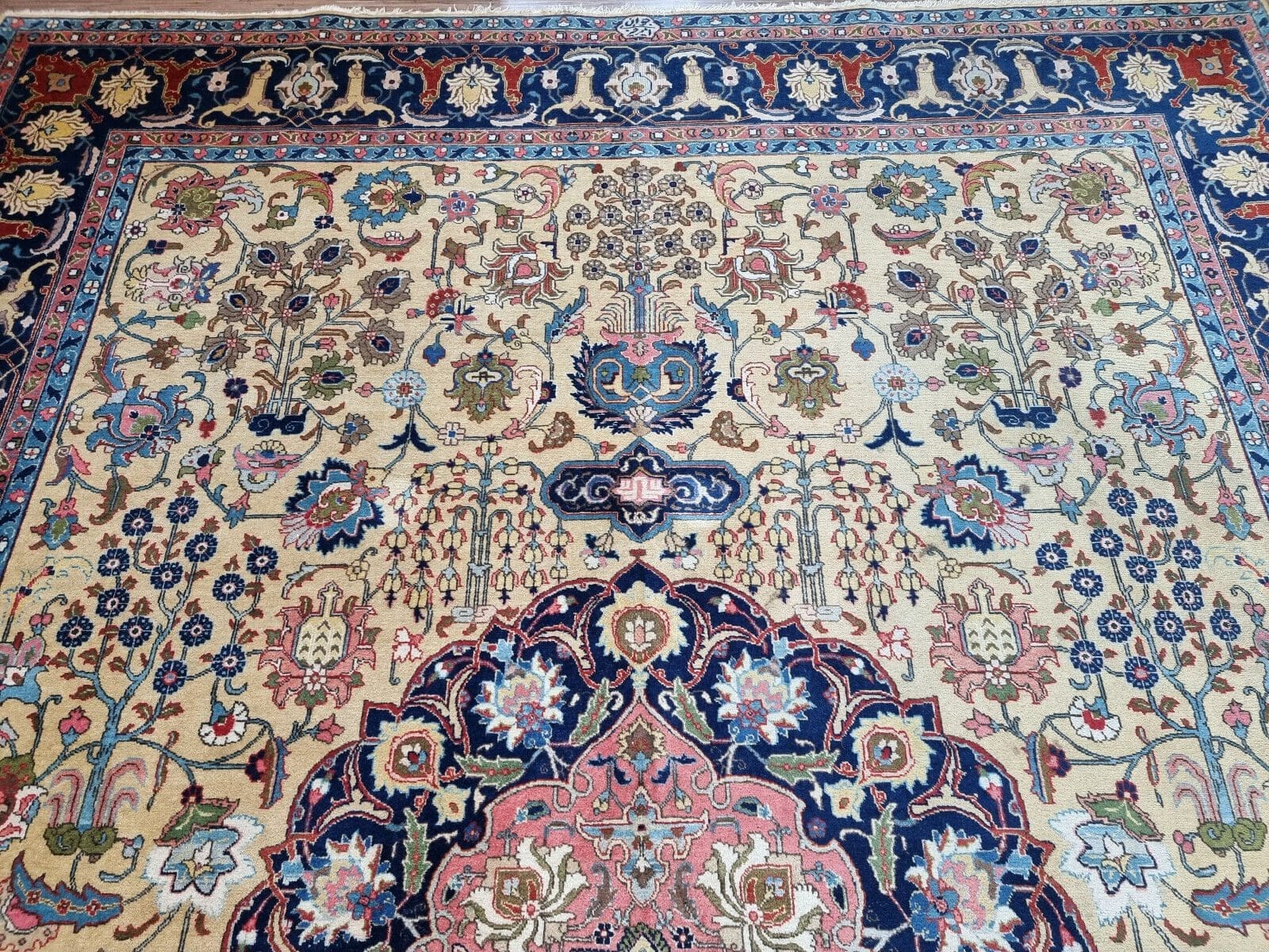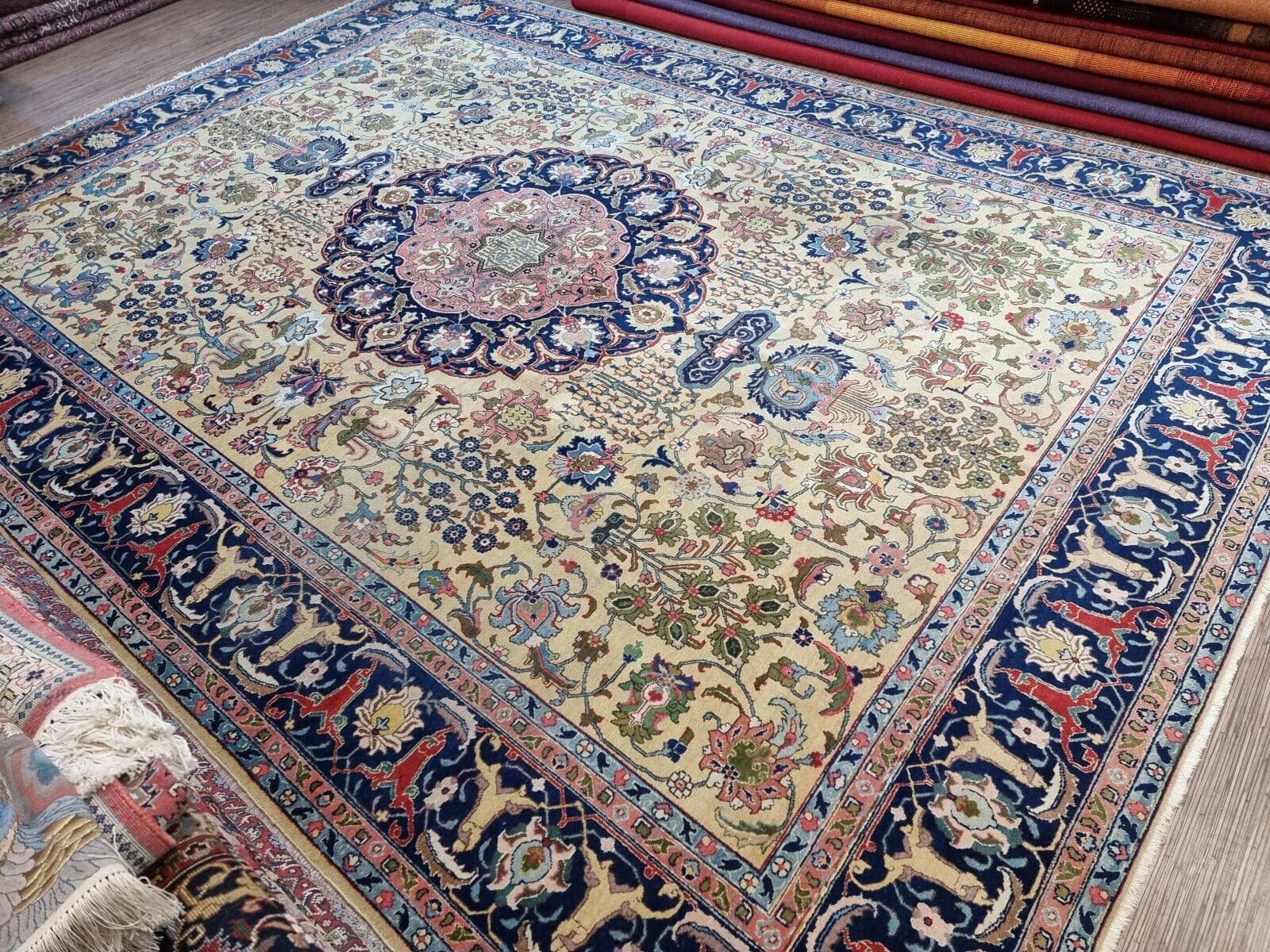 Wunderschöner Original Persischer Täbriz | Größe: 412×301 cm | Knotendichte: Handgeknüpft | Material: Schurwolle auf Baumwolle | Zustand: 80 Jahre alt mit leichten Abnutzungen | Muster: Floral | Herkunft: Persien | Stil: Orientalisch | Signiert von „Javan Amirkhiz“