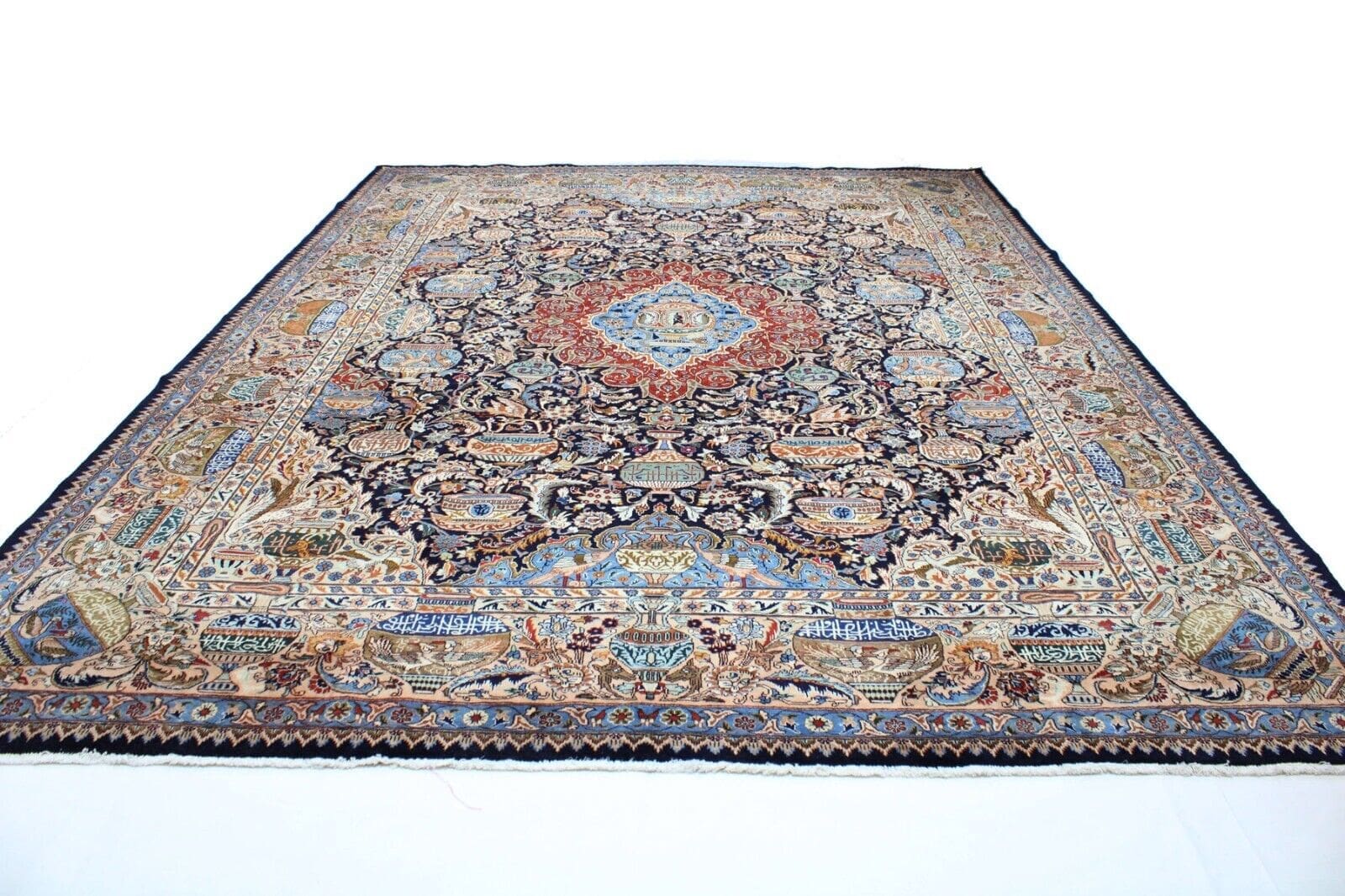 Die Knotendichte ist ein entscheidendes Merkmal, das die Qualität und Haltbarkeit des Teppichs bestimmt. Ein Teppich mit einer höheren Knotendichte, oft über 1 Million Knoten pro Quadratmeter, zeigt die außergewöhnliche Geschicklichkeit der Weber und ist in der Regel langlebiger. Das Material, meist aus reiner Wolle oder Seide, trägt zur Weichheit und zum Komfort des Teppichs bei und gewährleistet eine lange Lebensdauer.