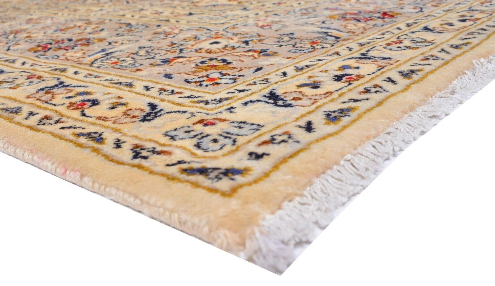 Der Orientteppich Perser Kashan in Beige präsentiert sich in einem harmonischen Farbspiel aus zarten Beige- und Erdtönen, die eine gemütliche und einladende Atmosphäre schaffen. Die Muster sind kunstvoll gestaltet und kombinieren florale Elemente mit geometrischen Formen, die typisch für persische Teppiche sind. Diese kombinierte Ästhetik verleiht dem Teppich seinen einzigartigen Charakter und lässt ihn elegant und zeitlos erscheinen.