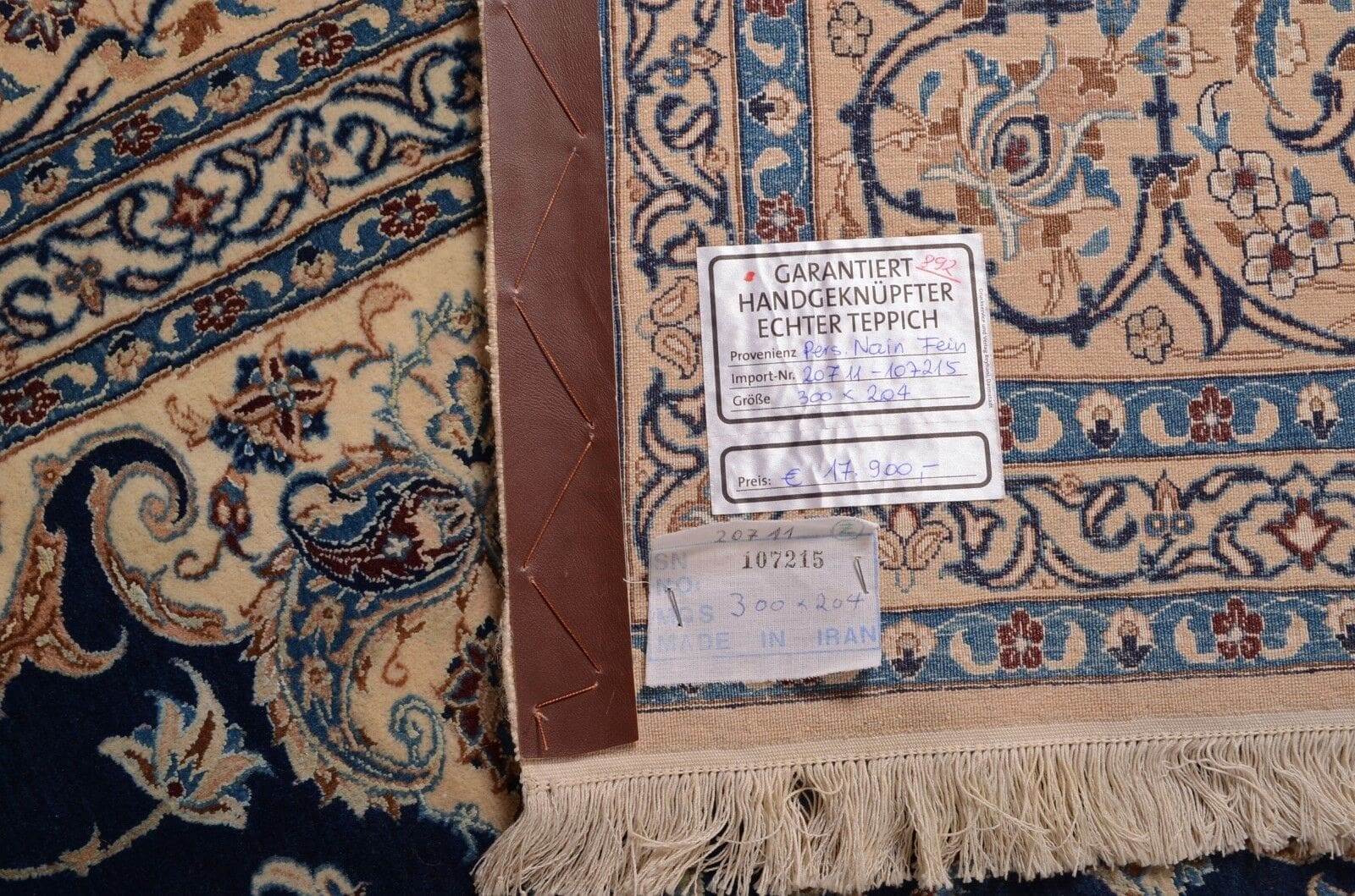 Handgeknüpfter Orientteppich Nain 6 La | Größe: 300×204 cm | Knotendichte: 900.000 Knoten/m² | Material: 95% Schurwolle, 5% Seide | Zustand: Perfekt, unbenutzt | Herkunft: Persien | Dicke: ca. 8 mm | Für Fußbodenheizung geeignet | Stil: Traditionell Orientalisch/Persisch | Alter: 10-15 Jahre