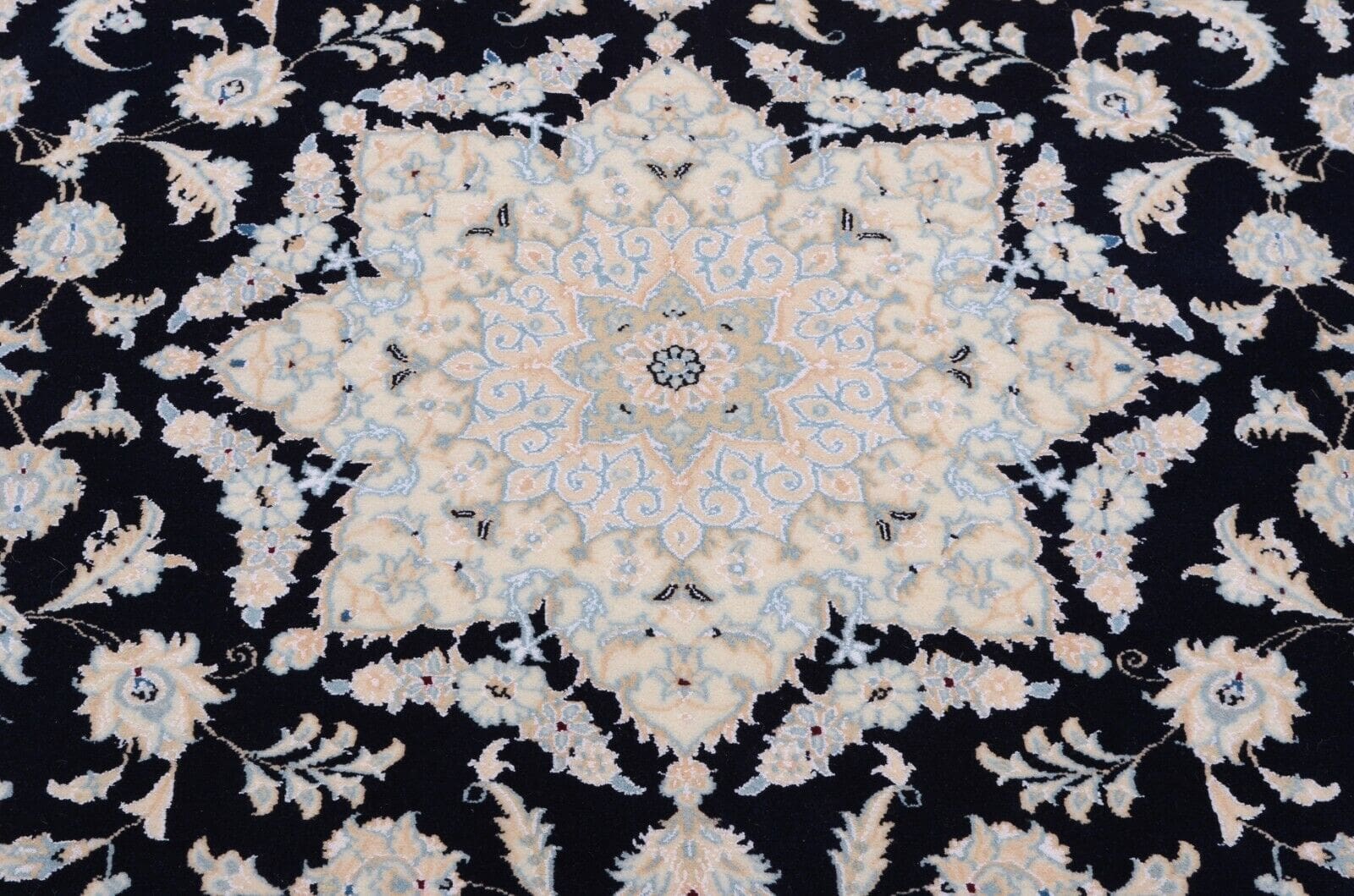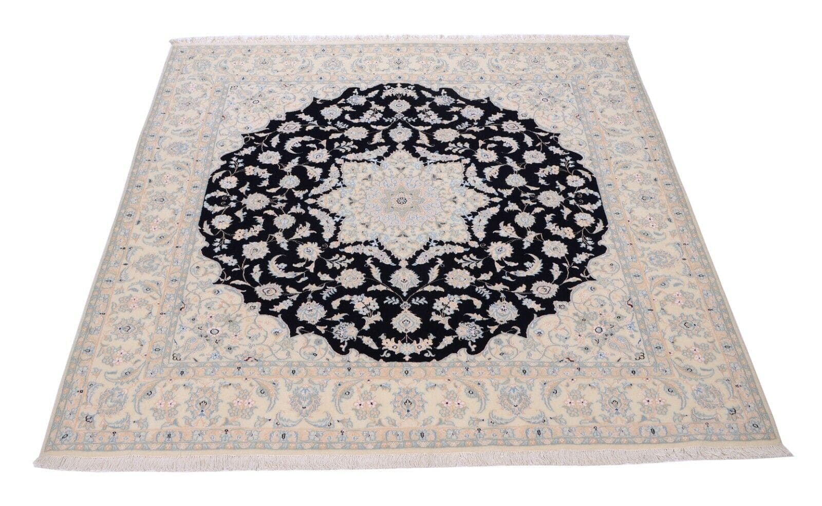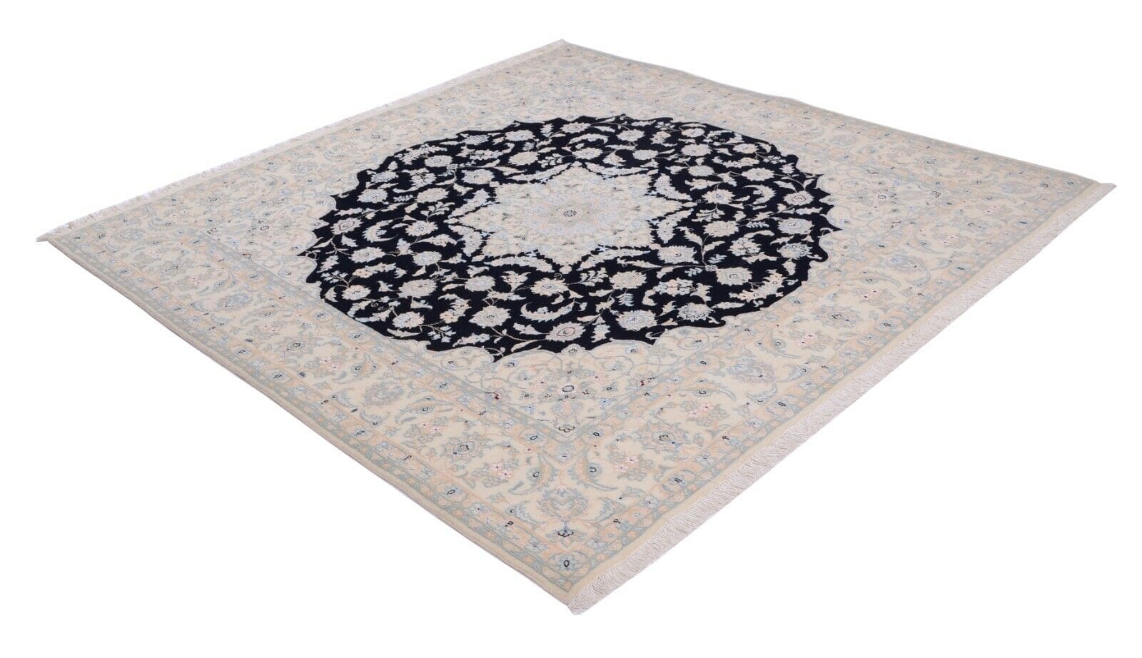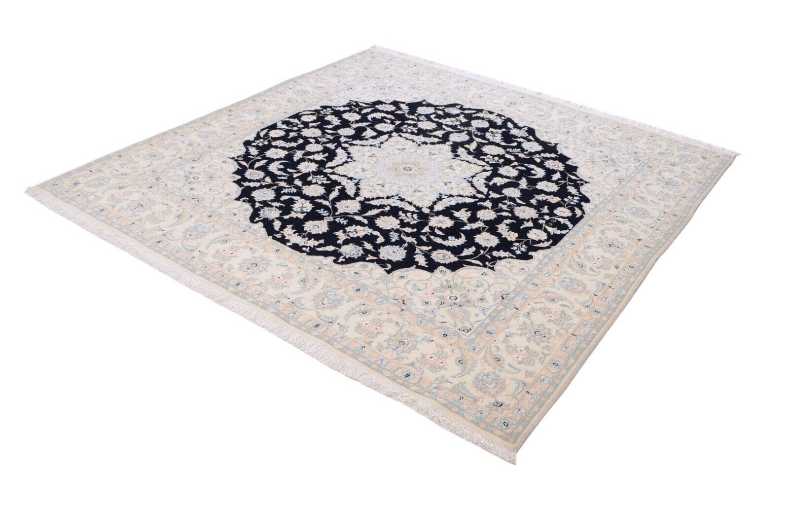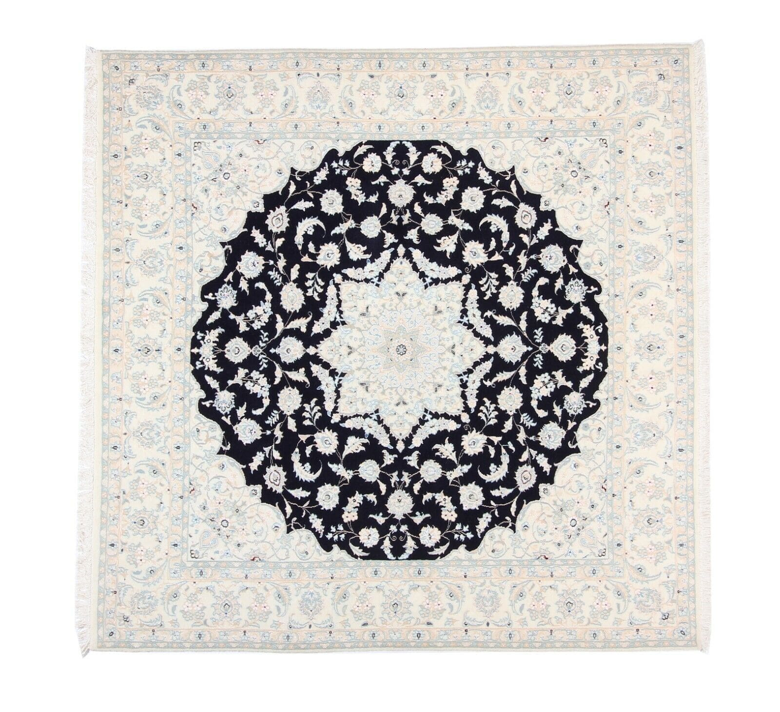 Handgeknüpfter Nain 9 La Teppich | Größe: 202 x 200 cm | Knotendichte: 450.000 Knoten/m² | Material: 95% Schurwolle, 5% Seide | Zustand: Neu, perfekt | Herkunft: Persien | Muster: Floralmotiv mit Medaillon | Dicke: ca. 10 mm | Gewicht: 3 kg/m² | Geeignet für Fußbodenheizung | Stil: Traditionell orientalisch/persisch