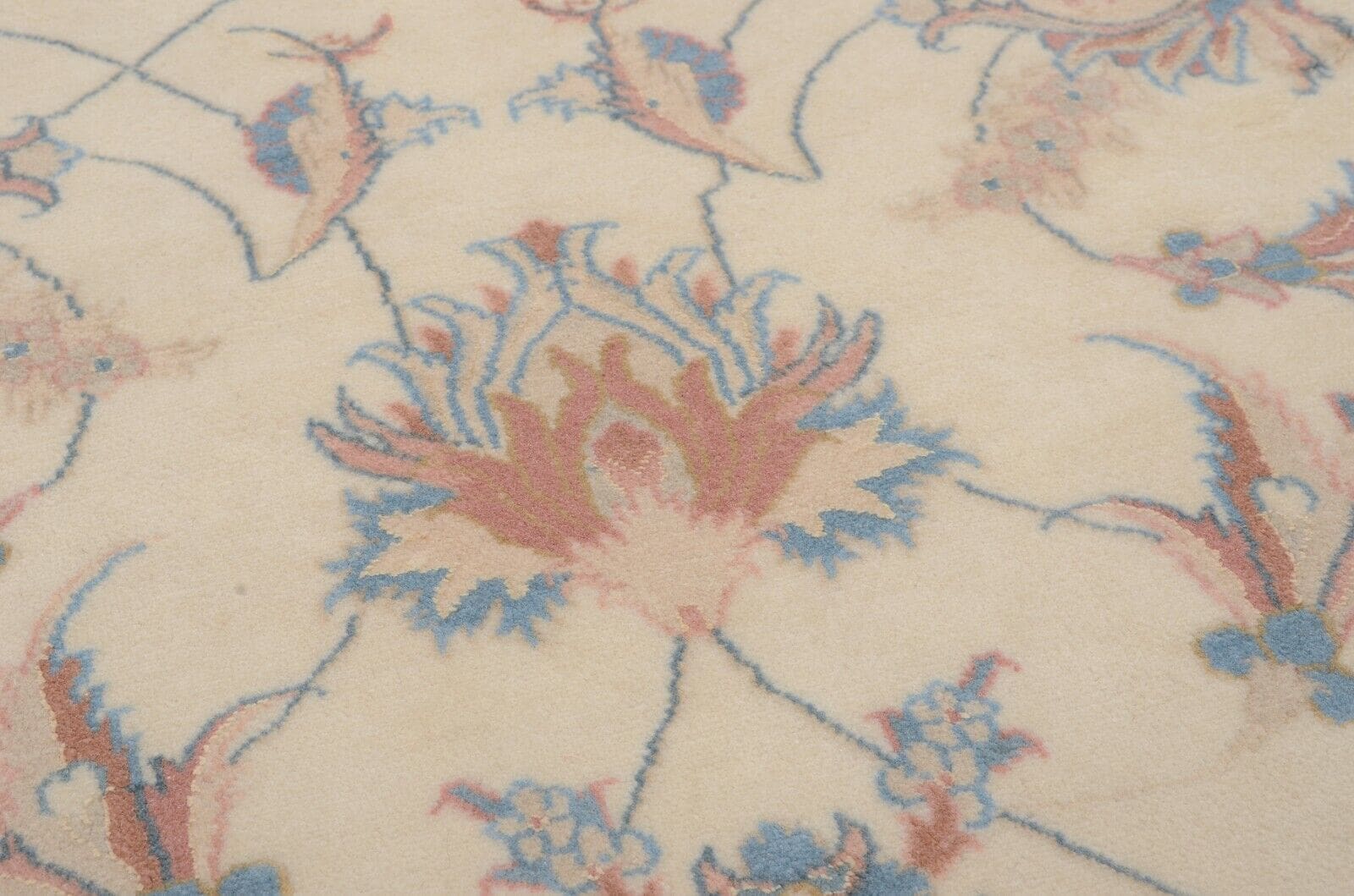 Der florale Designstil dieses Tabriz-Teppichs ist ein schönes Beispiel für die stilistische Vielfalt persischer Teppiche. Die sanften Beigetöne harmonieren perfekt mit den farbigen Akzenten und bringen eine ruhige, einladende Atmosphäre in jeden Raum. Florale Muster sind nicht nur ästhetisch ansprechend, sondern symbolisieren auch die Verbindung zur Natur und das Streben nach Schönheit und Harmonie. In der persischen Kultur stehen Blumen häufig für Wachstum, Überfluss und die Schöpfung.