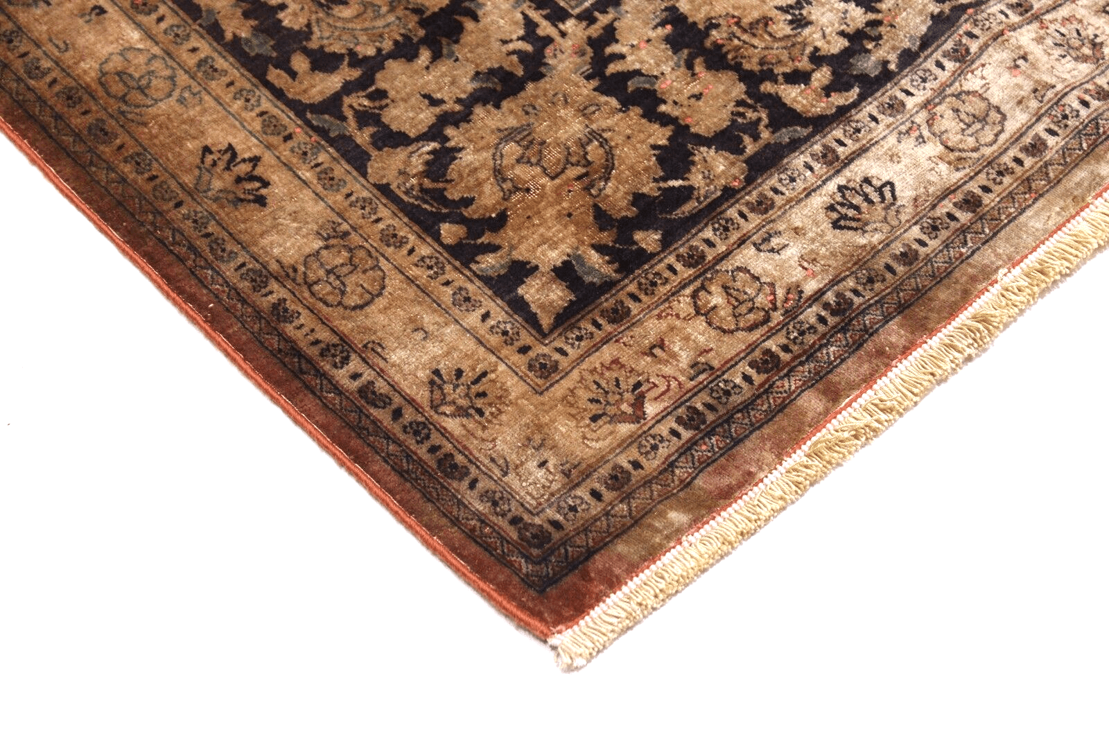 Der Vintage Perserteppich Ghom wird ausschließlich aus reiner Seide gefertigt. Seide ist nicht nur extrem langlebig, sondern ermöglicht auch wunderschöne Farbnuancen und -verläufe, die in diesem Teppich meisterhaft zur Geltung kommen. Die hohe Knotenzahl sorgt für eine detailreiche Darstellung der Muster, die auf den ersten Blick faszinierend wirkt. Jeder Knoten wird sorgfältig von Hand geknüpft, was den Teppich zu einem Unikat macht und die hochwertige Handwerkskunst widerspiegelt.