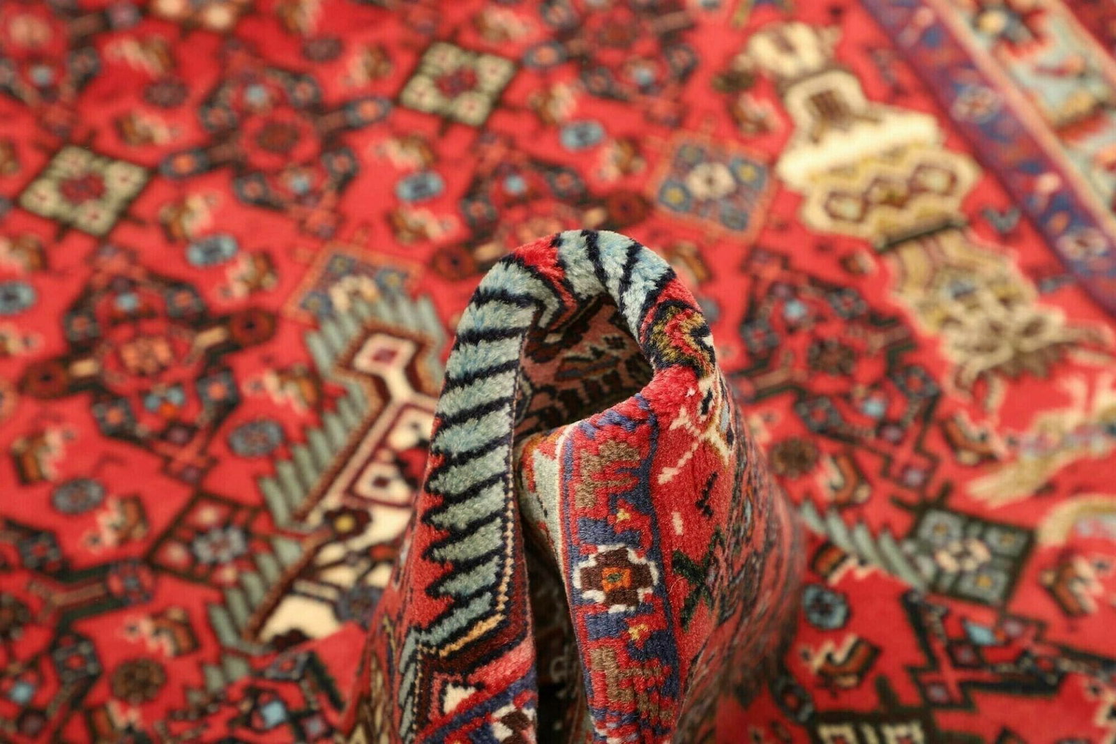 Die Farbpalette reicht von tiefen Rottönen über sanfte Blautöne bis hin zu erdigen, warmen Nuancen, die perfekt aufeinander abgestimmt sind. Diese Farben sind nicht nur ästhetisch ansprechend, sondern auch das Resultat einer natürlichen Färbung, was den Teppich noch umweltfreundlicher macht.