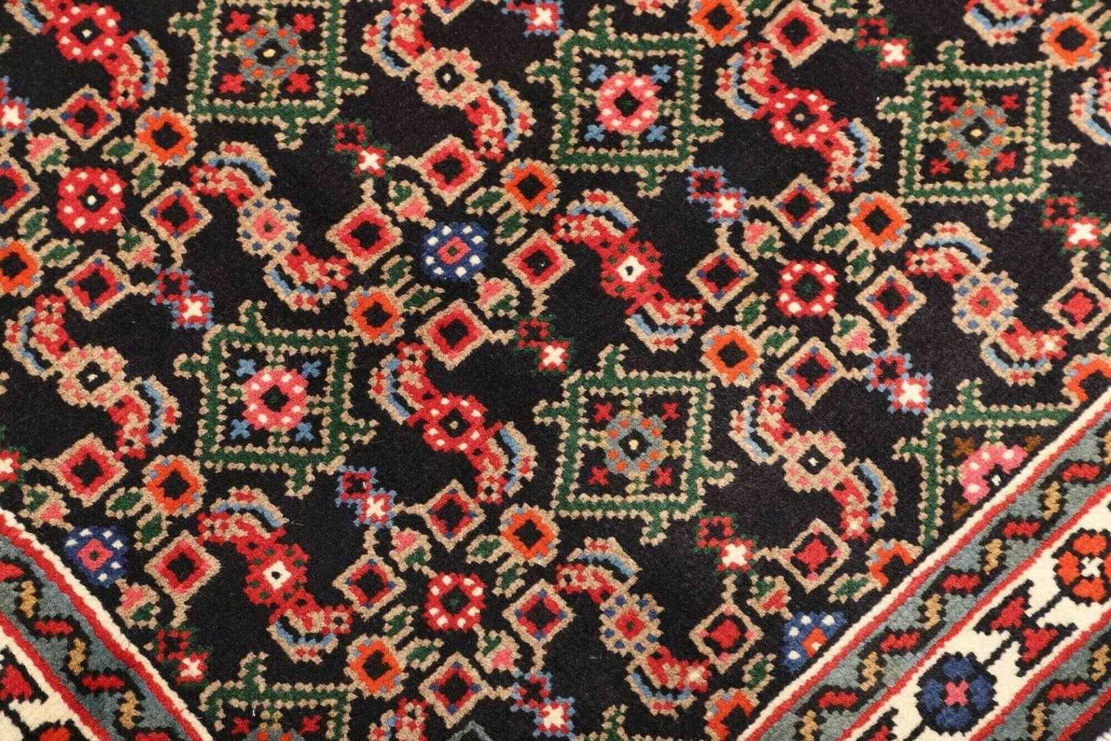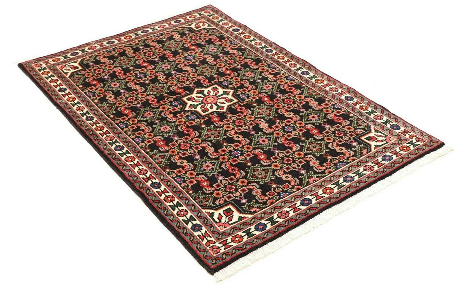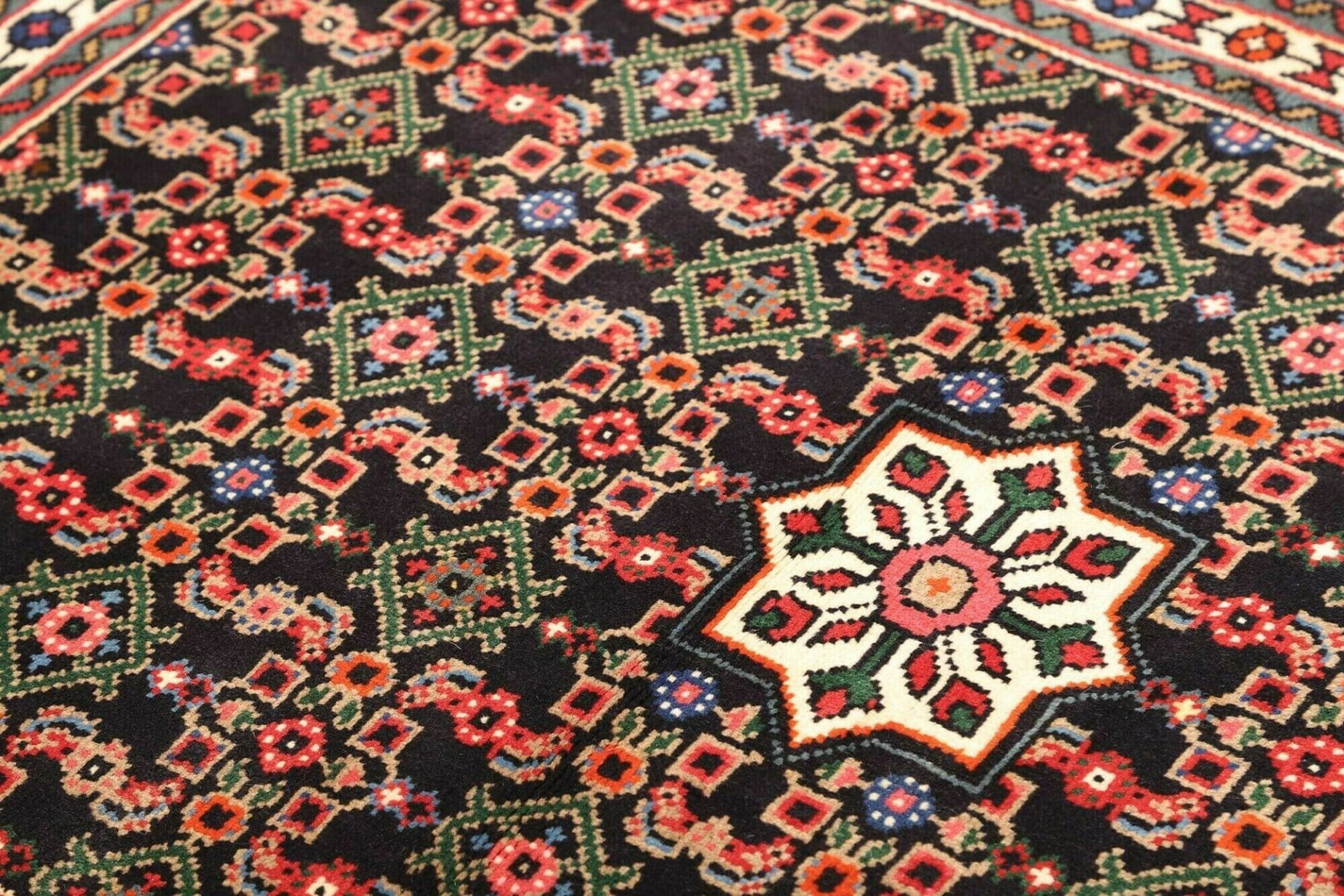 Hamadan Teppich | Knotendichte: ca. 200.000 Knoten/m² | Material: 100% Schurwolle | Größe: 103 x 144 cm | Herkunft: Iran | Zustand: Handgeknüpft | Muster: Herati und geometrische Designs