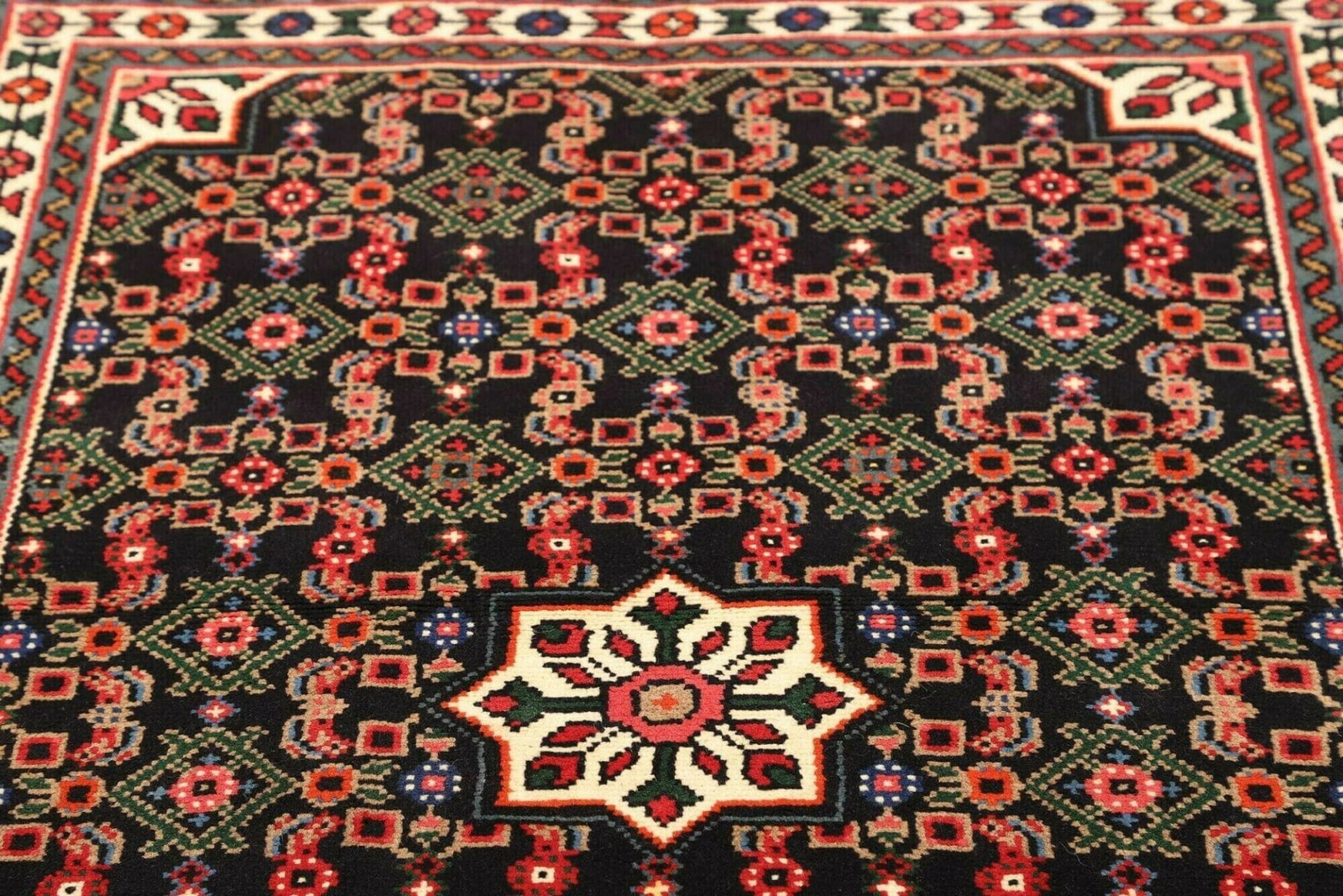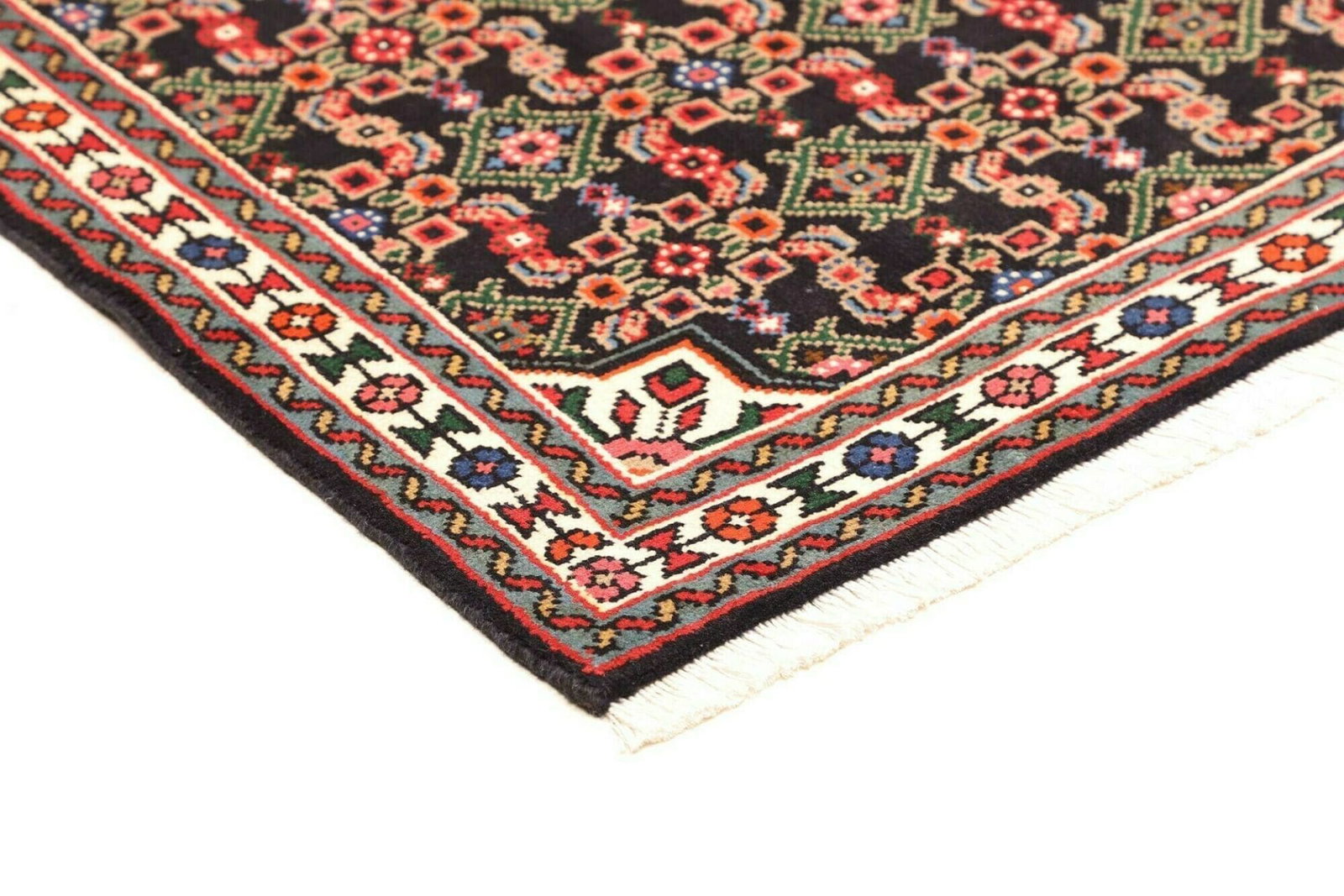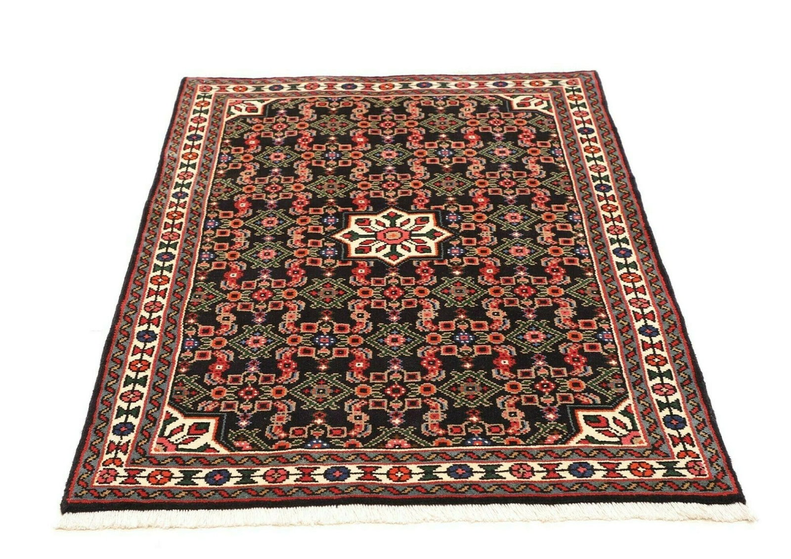 Hamadan Teppich | Knotendichte: ca. 200.000 Knoten/m² | Material: 100% Schurwolle | Größe: 103 x 144 cm | Herkunft: Iran | Zustand: Handgeknüpft | Muster: Herati und geometrische Designs