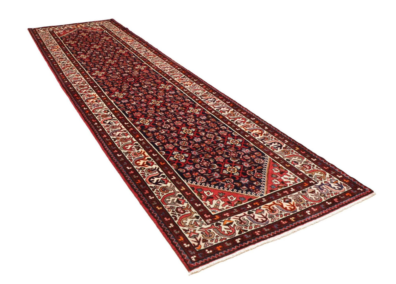 904$Ursprünglicher Preis war: 904$616$Aktueller Preis ist: 616$Hamadan Teppich | Größe: 113 x 400 cm | Knotendichte: ca. 200.000 Knoten/m² | Flor: 100% Schurwolle | Kette: 100% Baumwolle | Verarbeitung: Handgeknüpft | Herkunft: Iran | Muster: Herati und geometrische Designs | Zustand: Sehr gut