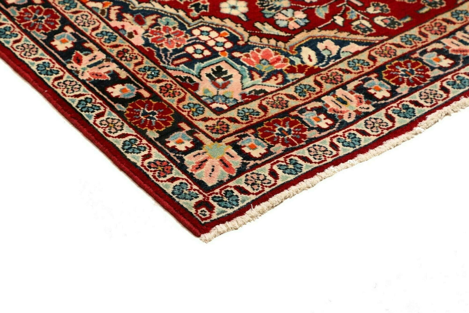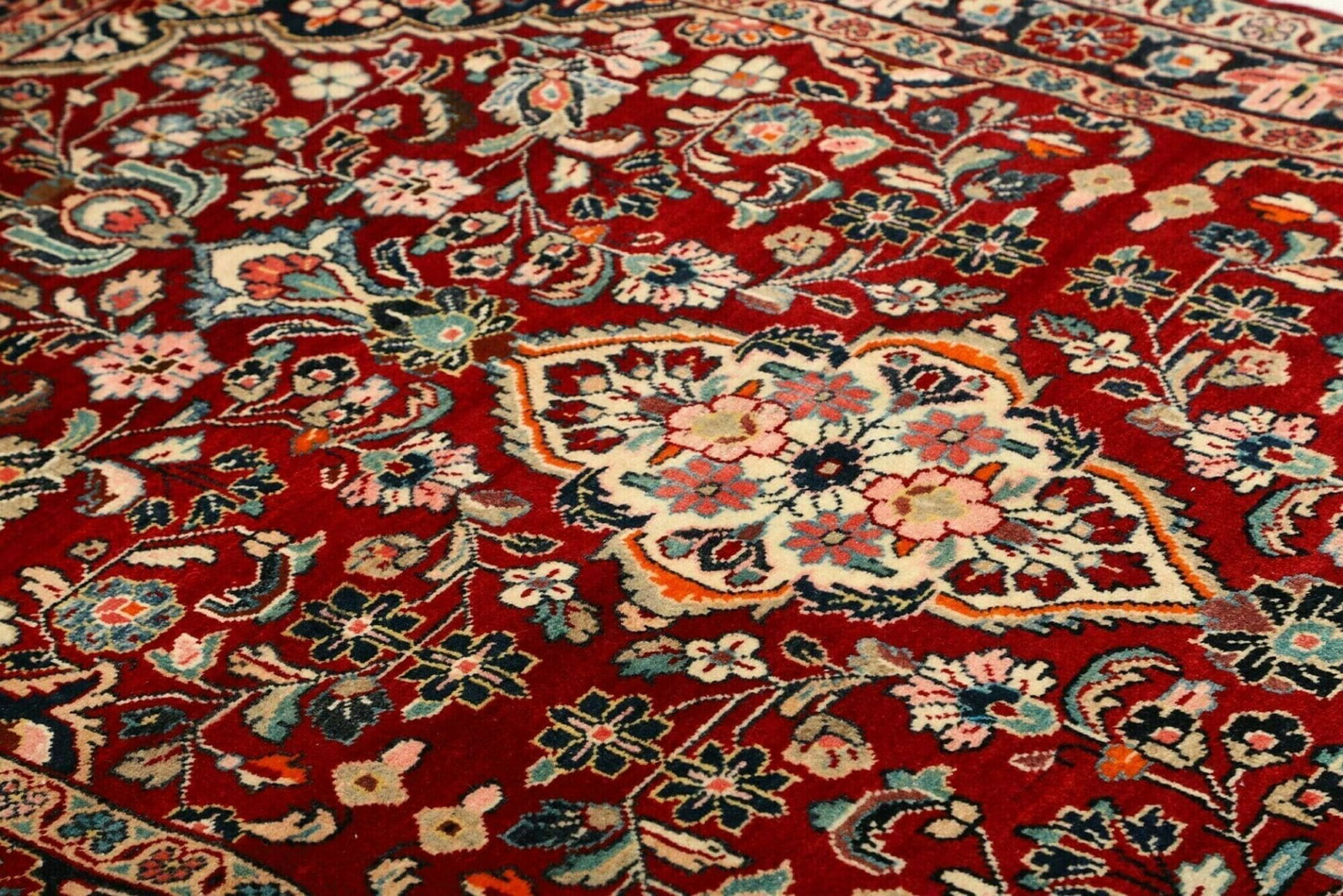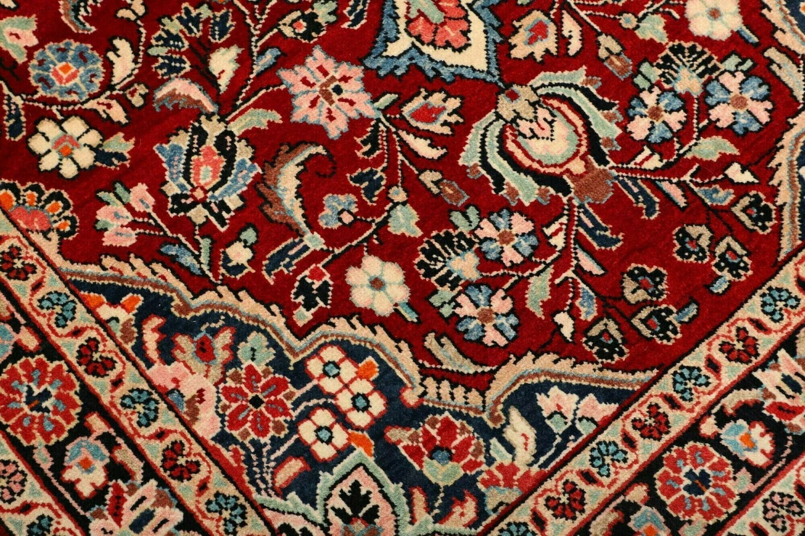 Die Kombination aus kräftigen und warmen Farben verleiht dem Teppich eine lebendige Ausstrahlung, während die feine Verarbeitung und das hochwertige Material dafür sorgen, dass der Teppich auch nach vielen Jahren noch in bestem Zustand bleibt. Die Farbauswahl und die Abfolge der Muster machen ihn zu einem perfekten Beispiel für das, was einen echten persischen Teppich ausmacht.