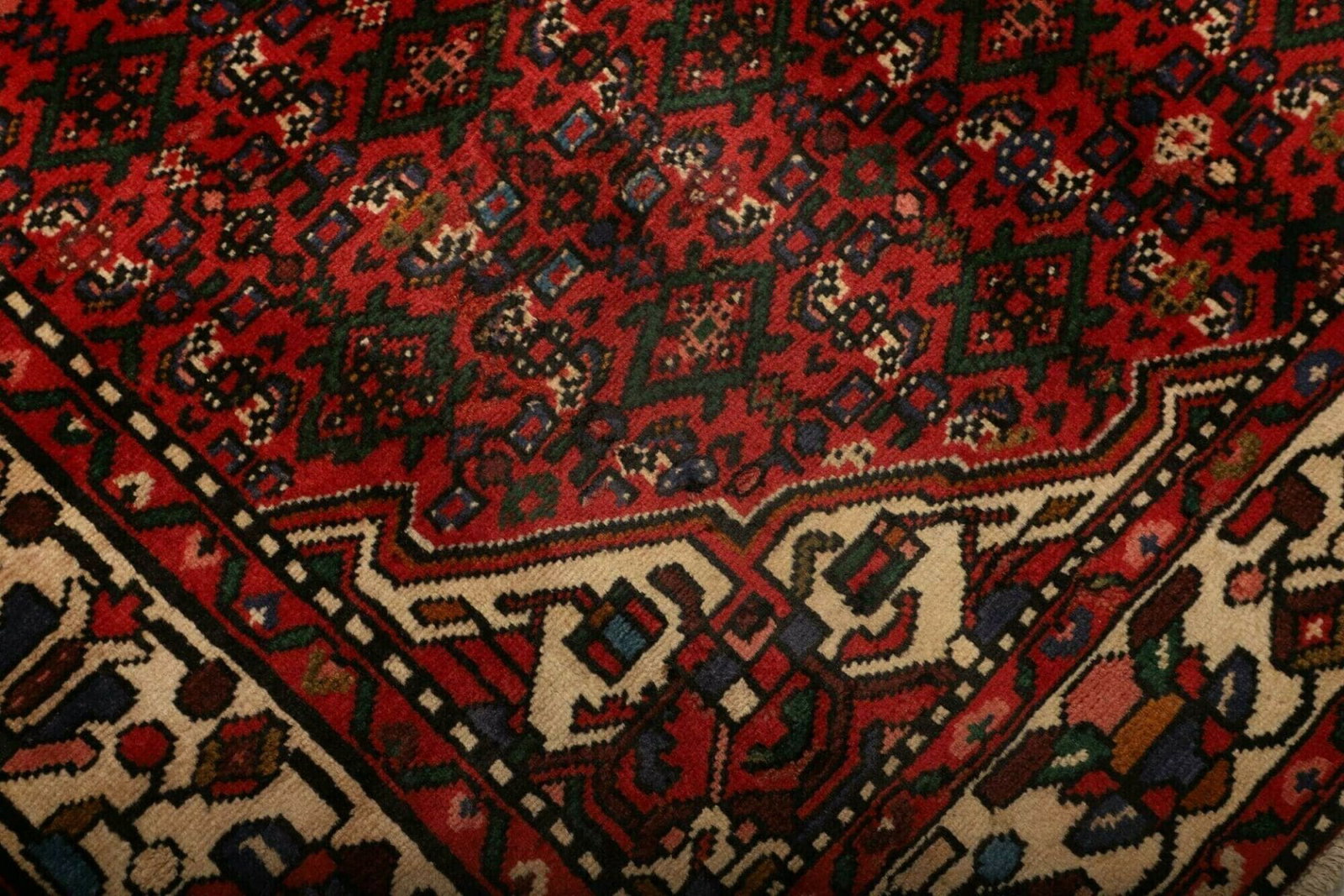Das charakteristische Herati-Muster des Hamadan Teppichs ist ein wunderschönes Beispiel für die traditionellen Ornamentik der iranischen Teppichkunst. Es besteht aus stilisierten floralen und geometrischen Formen, die harmonisch zusammenspielen und dem Teppich eine beruhigende, natürliche Ausstrahlung verleihen. Die Farbgebung umfasst unter anderem warme Rottöne, tiefes Blau und erdige Töne, die den Teppich sowohl zeitlos als auch dennoch modern erscheinen lassen. Ein solcher Teppich bringt nicht nur ein Stück Kultur in Ihr Zuhause, sondern sorgt auch für eine warme und einladende Atmosphäre.