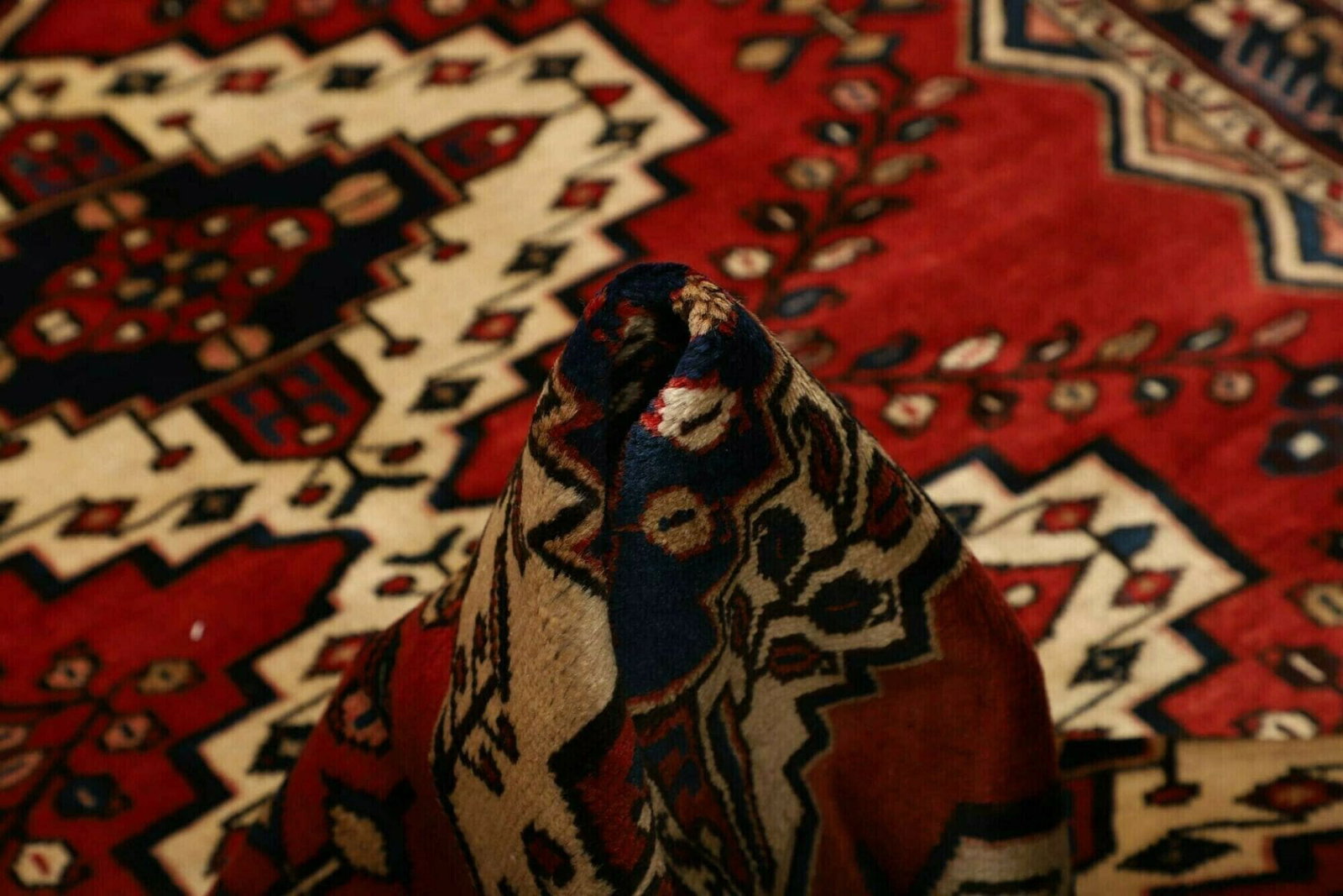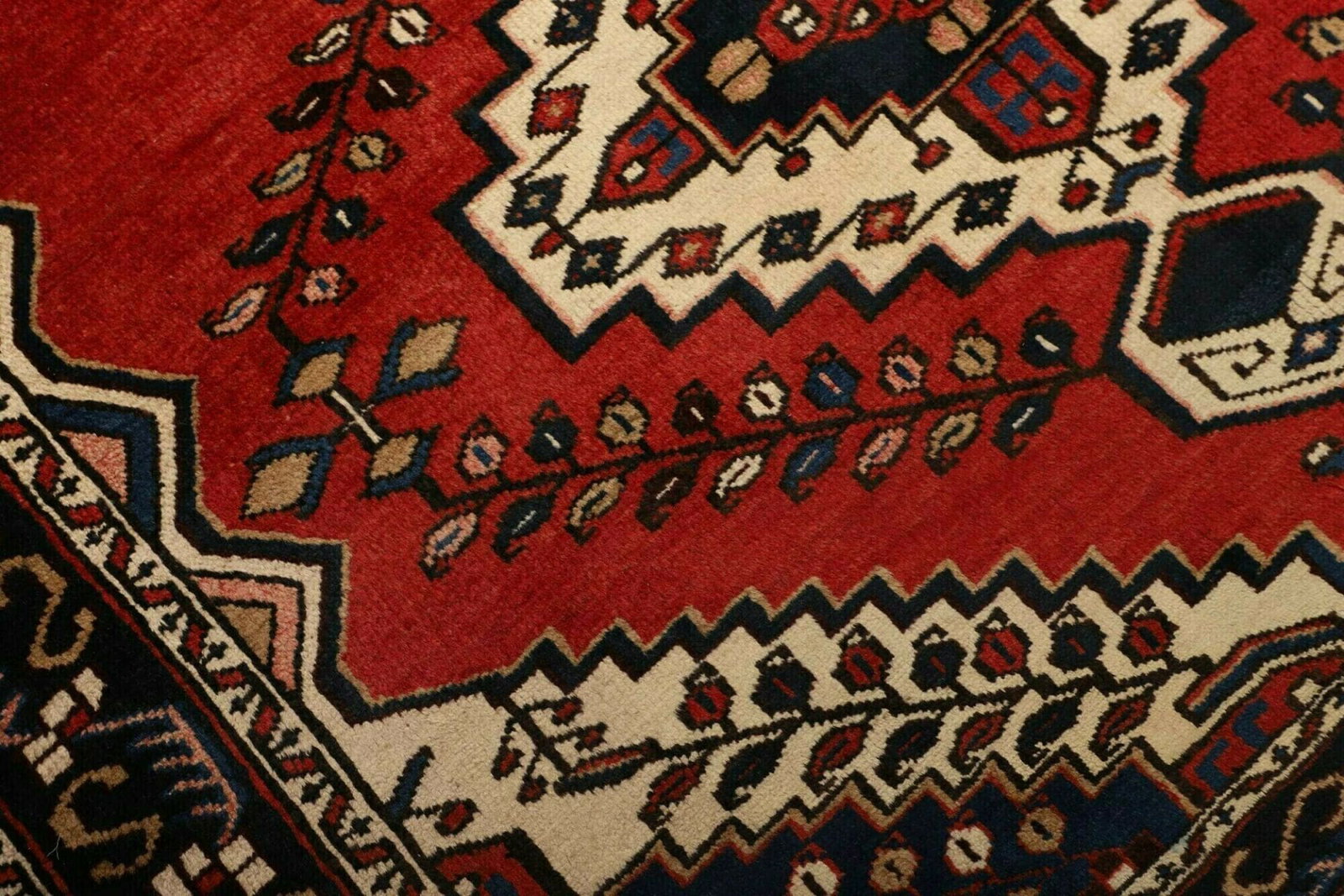 Das geometrische Muster des Hamadan Teppichs ist nicht nur dekorativ, sondern auch symbolisch. Solche Muster werden häufig verwendet, um Lebenszyklen, Fruchtbarkeit und Wohlstand darzustellen. Die Kombination aus hochkontrastierenden Farben und klaren Linien verleiht dem Teppich eine moderne Ästhetik, die sich mühelos in verschiedene Einrichtungsstile integrieren lässt. Dieses Design ist sowohl klassisch als auch zeitgenössisch, wodurch der Teppich in jedem Raum des Hauses als stilvolles Accesoire dient.