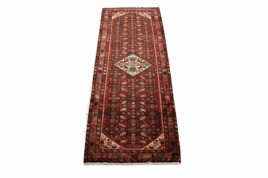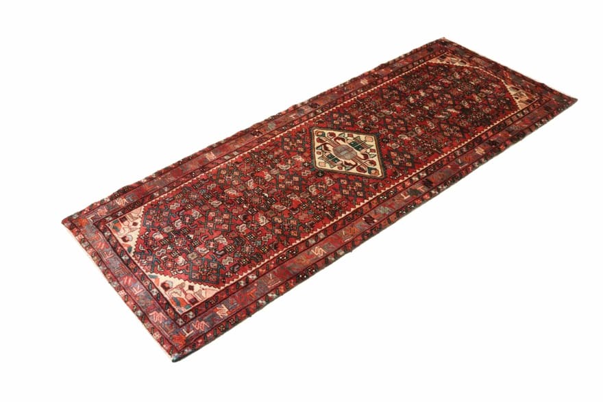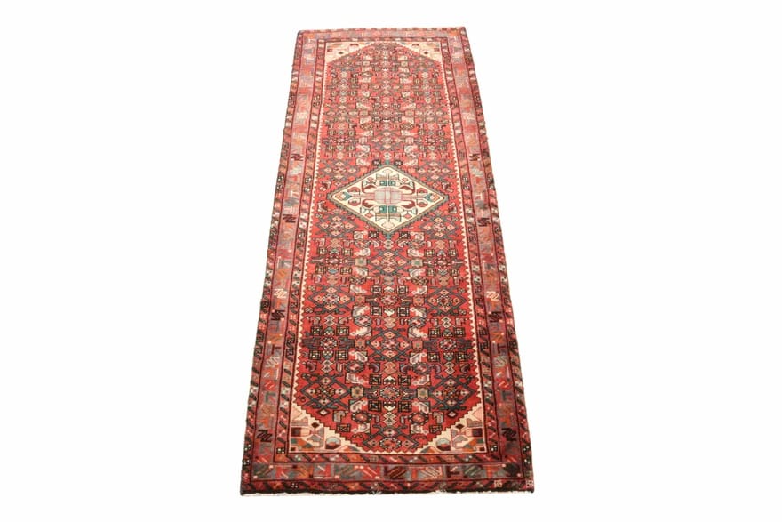 Handgeknüpfter Hamadan Teppich | Knotendichte: 160.000 – 200.000 Knoten/m² | Material: Wolle und Baumwolle | Farbe: Rot/Orange | Größe: 290×109 cm | Zustand: Neu | Ursprung: Iran / Persien | Dicke: ca. 10 mm | Gewicht: ca. 10 kg