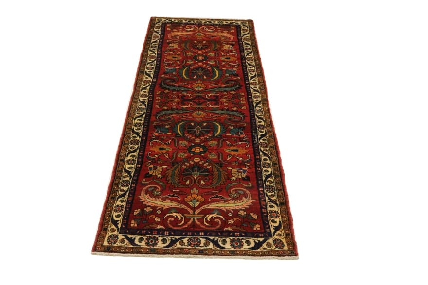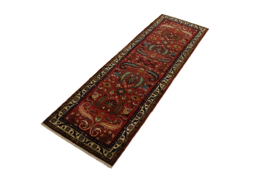 Handgeknüpfter Hamadan Teppich | Knotendichte: 160.000 – 200.000 Knoten/m² | Material: Wolle und Baumwolle | Größe: 291×90 cm | Zustand: Neuzeitlich (0-20 Jahre) | Farbe: Rot/Orange | Ursprung: Iran/Persien | Dicke: ca. 10 mm | Gewicht: ca. 9 kg