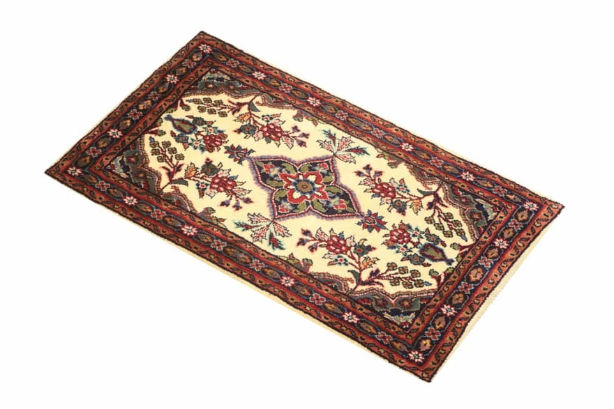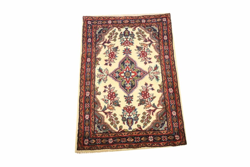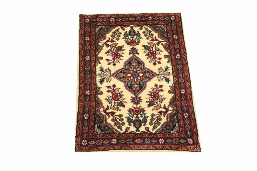 Handgeknüpfter Hamadan-Teppich | Knotendichte: 160.000 – 200.000 Knoten/m² | Material: Handgesponnene Wolle und Baumwollkette | Größe: 95×56 cm | Farbe: Weiß/Beige | Zustand: Neu | Ursprung: Iran / Persien