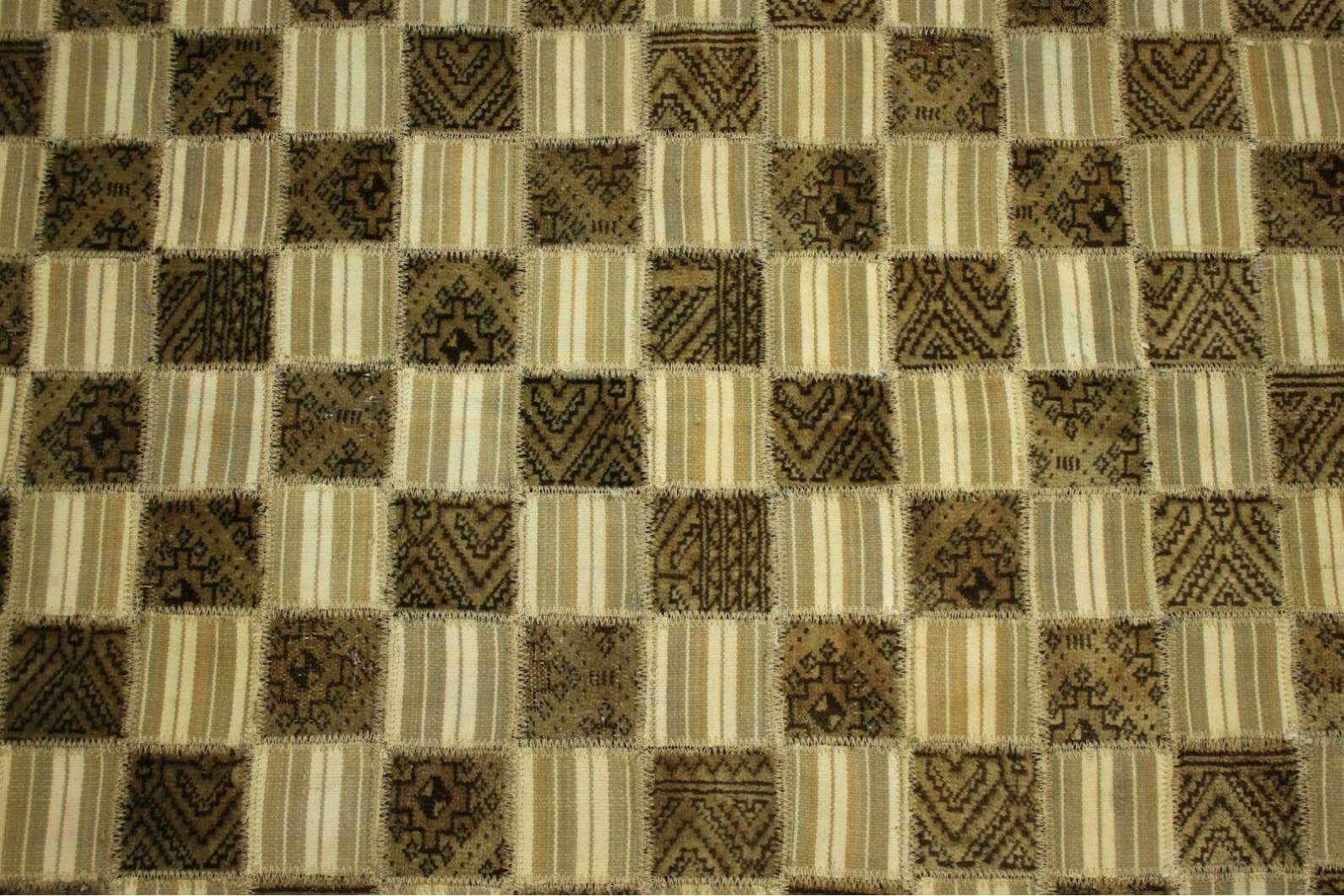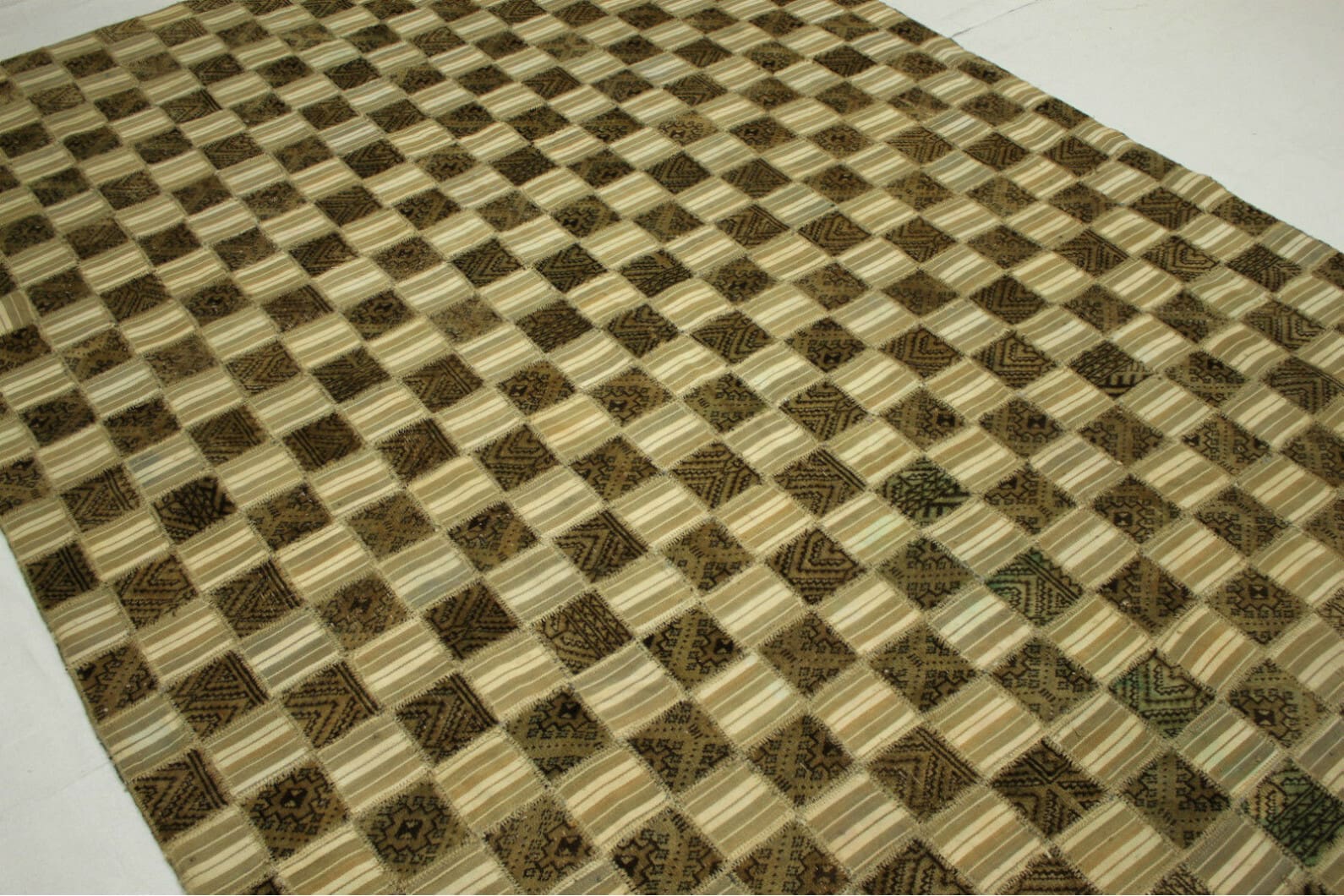 Handgearbeiteter Patchwork Teppich | Größe: 293×201 cm | Farben: Braun, Beige, Weiß | Material: Handgesponnene Wolle & Baumwolle | Zustand: Neu mit Etikett | Herkunft: Orient | Stil: Vintage Patchwork | Besonderheiten: Für Fußbodenheizung geeignet | Knotendichte: Hochwertige Verarbeitung