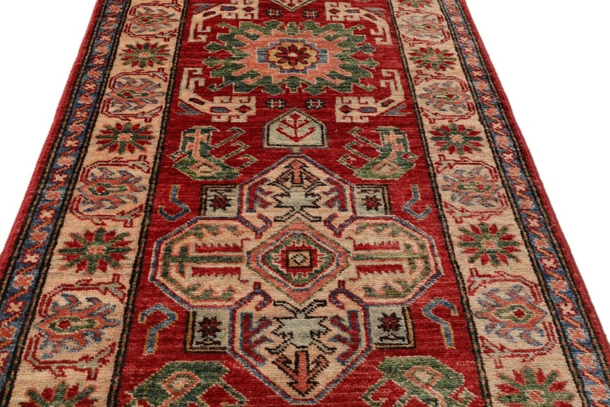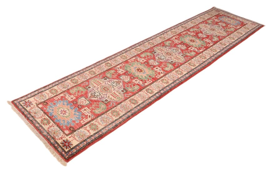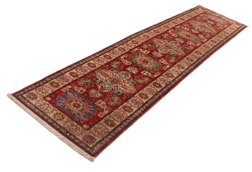 Handgefertigter Kazak Teppich | Knotendichte: 200.000 – 250.000 Knoten/m² | Material: Reine Wolle | Größe: 301×75 cm | Zustand: Neu | Ursprung: Iran/Persien | Design: Traditionell Kazak | Farben: Rot/Orange | Ideal für schmale Flure und Eingangsbereiche