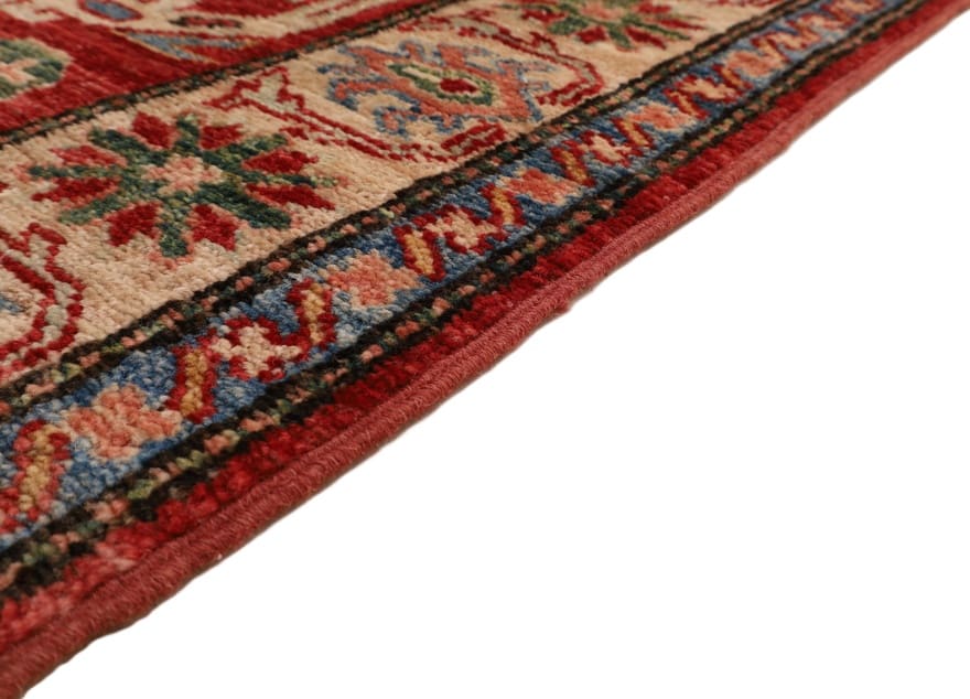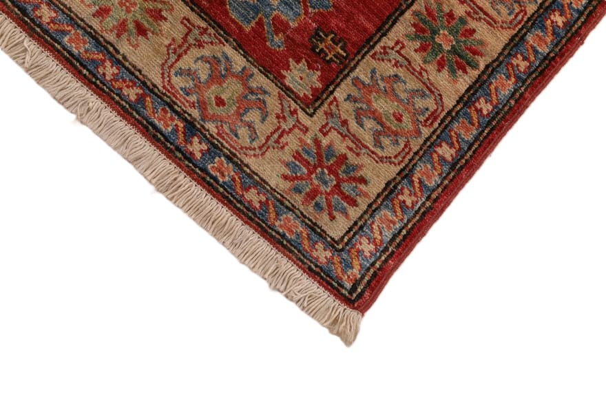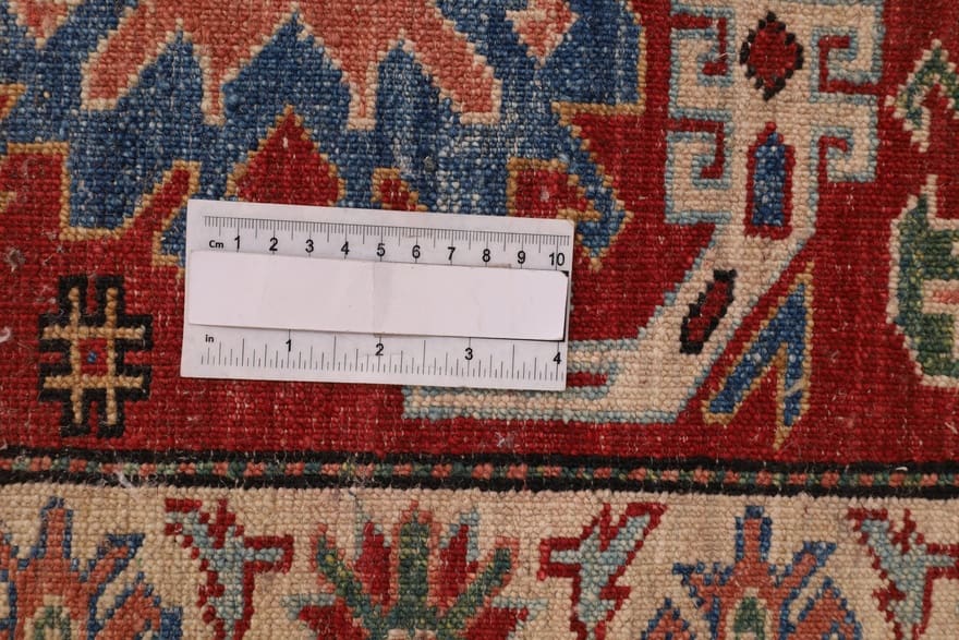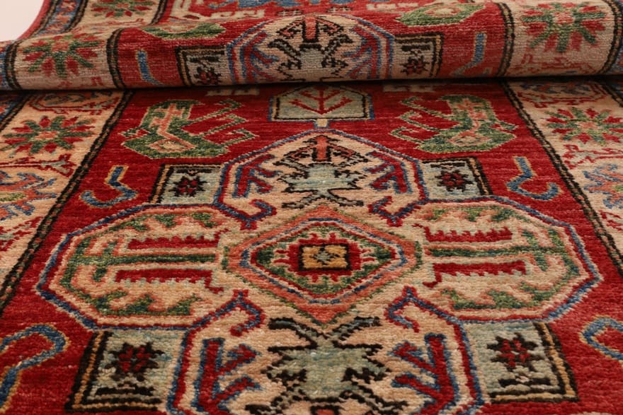 Der Kazak Teppich wird aus 100% reiner Wolle gefertigt, einem Material, das für seine Widerstandsfähigkeit und Pflegeleichtigkeit bekannt ist. Die Wolle wird sorgfältig ausgewählt, um sicherzustellen, dass der Teppich sowohl weich als auch langlebig ist. Die handgeknüpfte Technik, die bei der Herstellung verwendet wird, sorgt für eine hohe Knotendichte, was eine lange Lebensdauer und Intensität der Farben garantiert. Jeder Teppich wird mit den Händen geknüpft, was bedeutet, dass jede Kreation einzigartig ist und alle Merkmale traditioneller Teppichkunst aufweist.