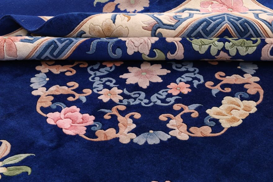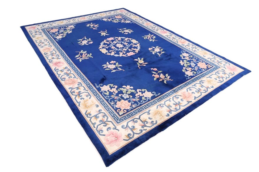 Handgefertigter China Teppich | Knotendichte: 200.000 – 250.000 Knoten/m² | Material: Hochwertige Wolle und Baumwolle | Größe: 368×272 cm | Design: Traditionelles chinesisches Muster | Zustand: Neu | Herkunft: China | Farbe: Blau/Türkis | Dicke: ca. 10 mm | Gewicht: ca. 45 kg