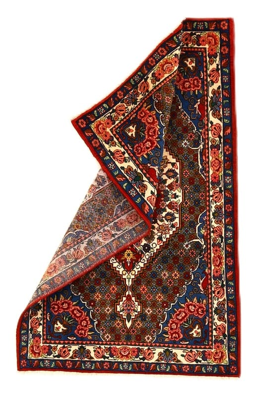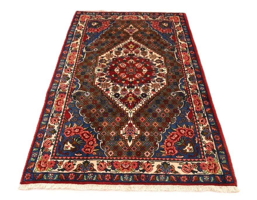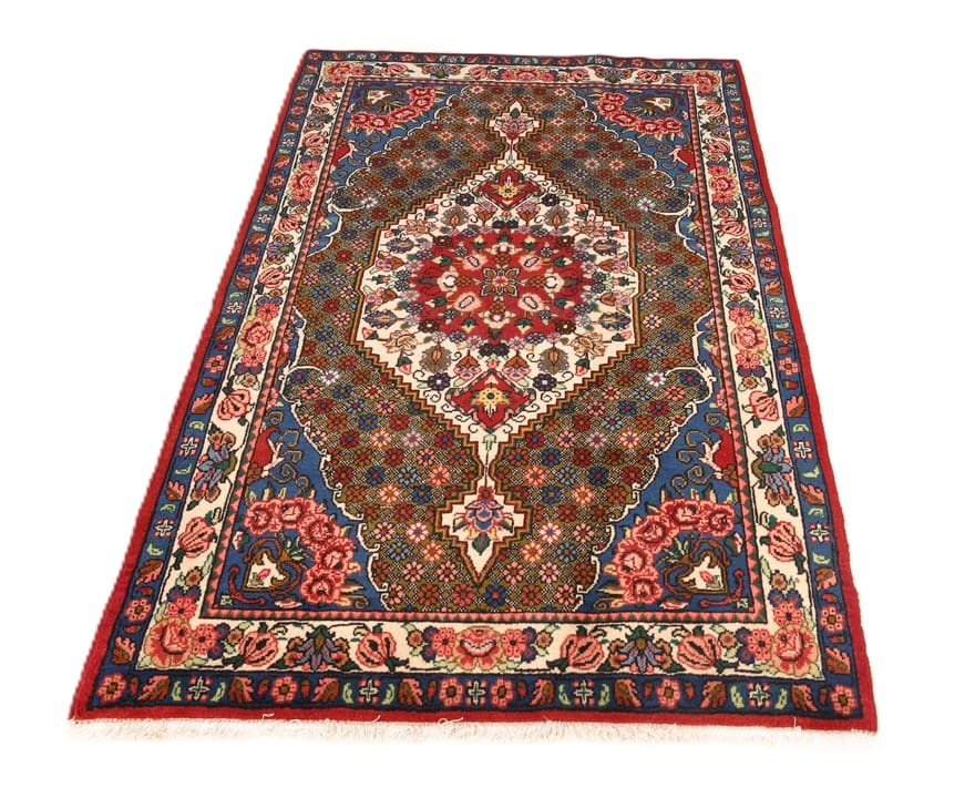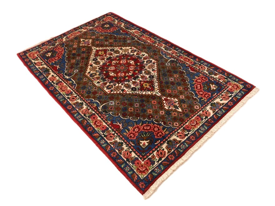 Handgeknüpfter Bakhtiar Teppich | Knotendichte: 128.000 – 160.000 Knoten/m² | Material: Hochwertige Schurwolle auf Baumwollgrund | Größe: 165×102 cm | Zustand: Neuzeitlich (0-20 Jahre) | Ursprung: Iran / Persien | Farben: Rot, Blau und Elfenbein | Design: Klassisches Medaillon mit floralen Motiven | Pflegeleicht: Regelmäßiges Absaugen genügt | Unikat: Jedes Stück ein handgefertigtes Einzelstück