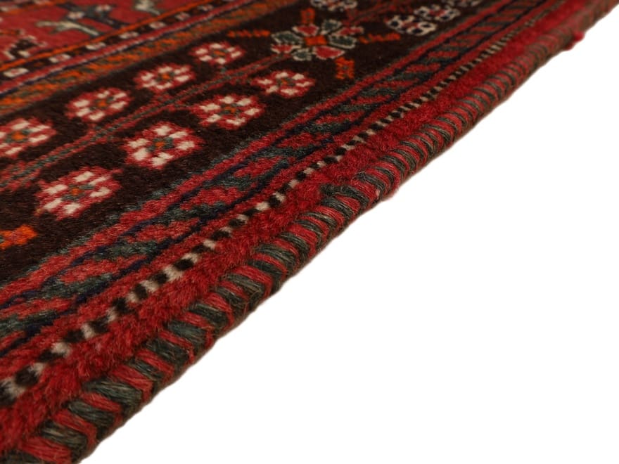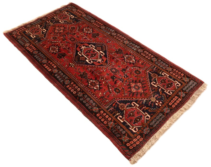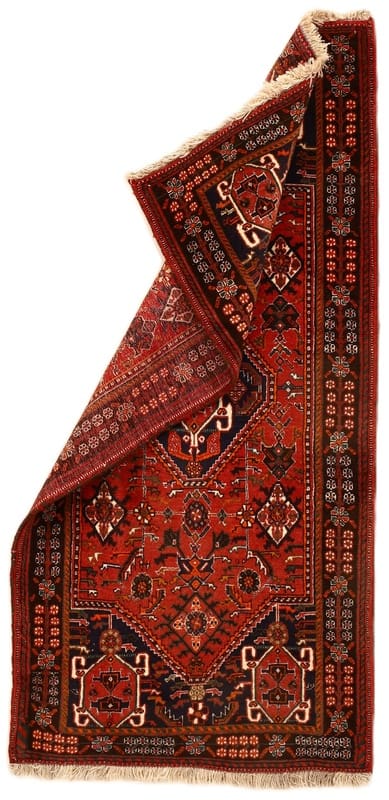 Handgeknüpfter Ghashghai Teppich | Knotendichte: 128.000 – 160.000 Knoten/m² | Material: Reine Schurwolle auf Baumwollgrund | Größe: 168×81 cm | Zustand: Neuzeitlich (0-20 Jahre) | Ursprung: Iran/Persien | Farben: Warmes Rot mit marineblauen und elfenbeinfarbenen Akzenten | Pflegeleicht: Regelmäßiges Absaugen genügt