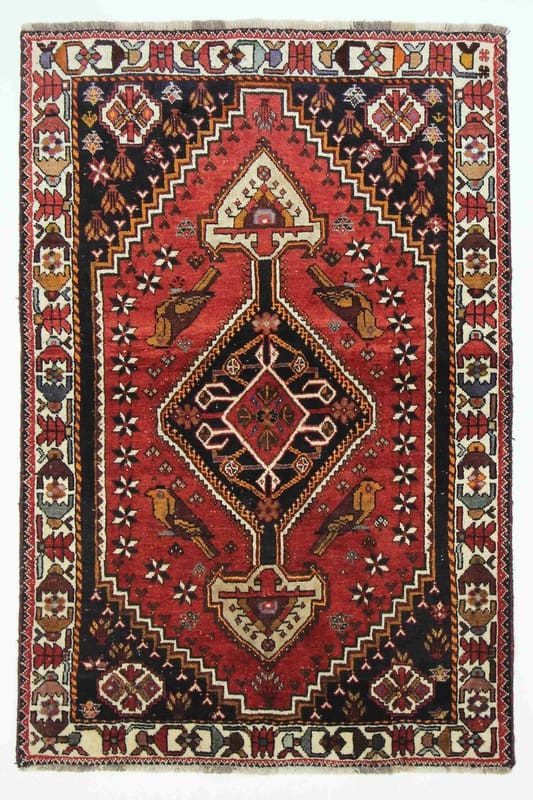 Handgeknüpfter Ghashghai-Teppich | Knotendichte: 90.000 Knoten/m² | Material: Hochwertige Wolle | Größe: 181×129 cm | Farben: Lebhaftes Rot und Orange | Herkunft: Iran/Persien | Zustand: Neu | Florhöhe: ca. 10 mm | Gewicht: ca. 7 kg