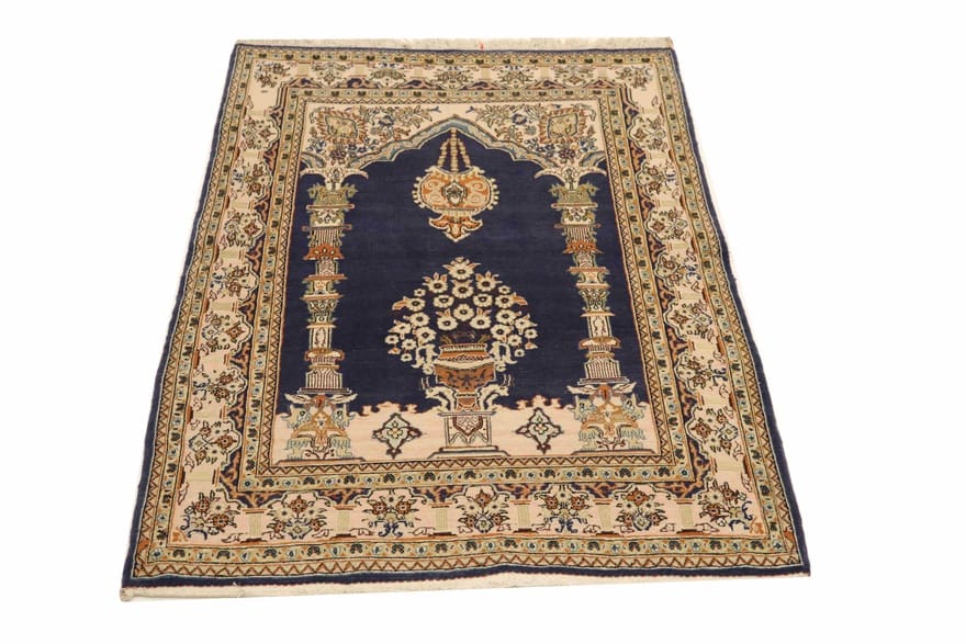 Handgeknüpfter Ghom Teppich | Knotendichte: 320.000 – 360.000 Knoten/m² | Material: Reine Schurwolle | Größe: 171×109 cm | Zustand: Neu | Ursprung: Iran/Persien | Farbe: Dunkelblau mit beigen und goldenen Akzenten | Form: Rechteckig | Dicke: ca. 8 mm | Gewicht: ca. 5 kg