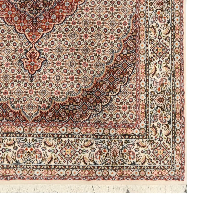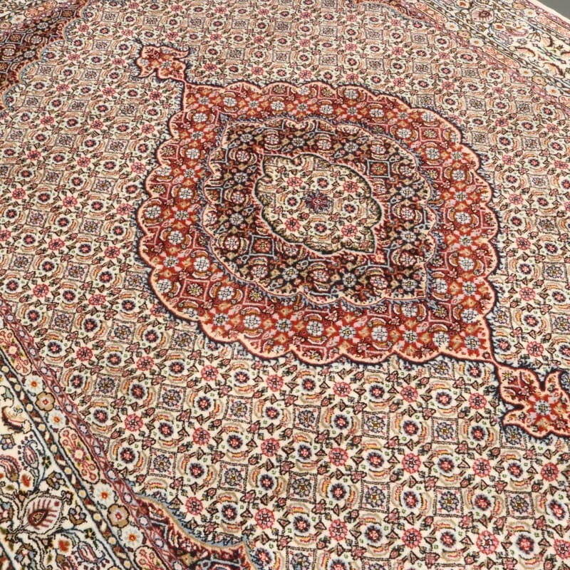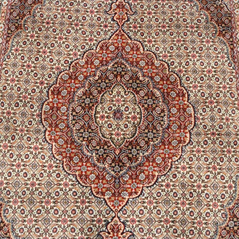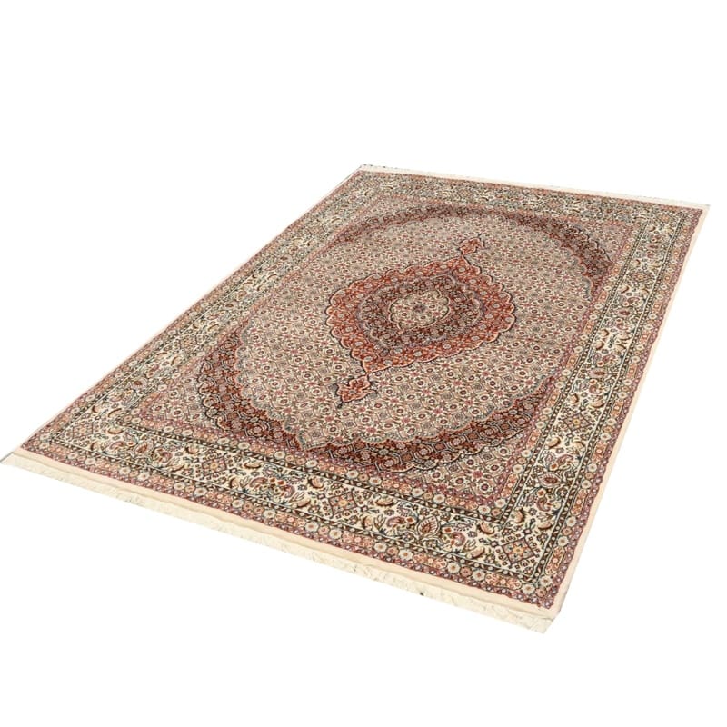 Handgewebter Moud-Teppich | Knotendichte: 320.000 – 360.000 Knoten/m² | Material: Wolle, Seide, Baumwolle | Größe: 235×167 cm | Zustand: Neu | Herkunft: Iran / Persien | Farben: Satte und dezente Töne | Dicke: ca. 18 mm | Gewicht: ca. 12 kg | Form: Rechteckig