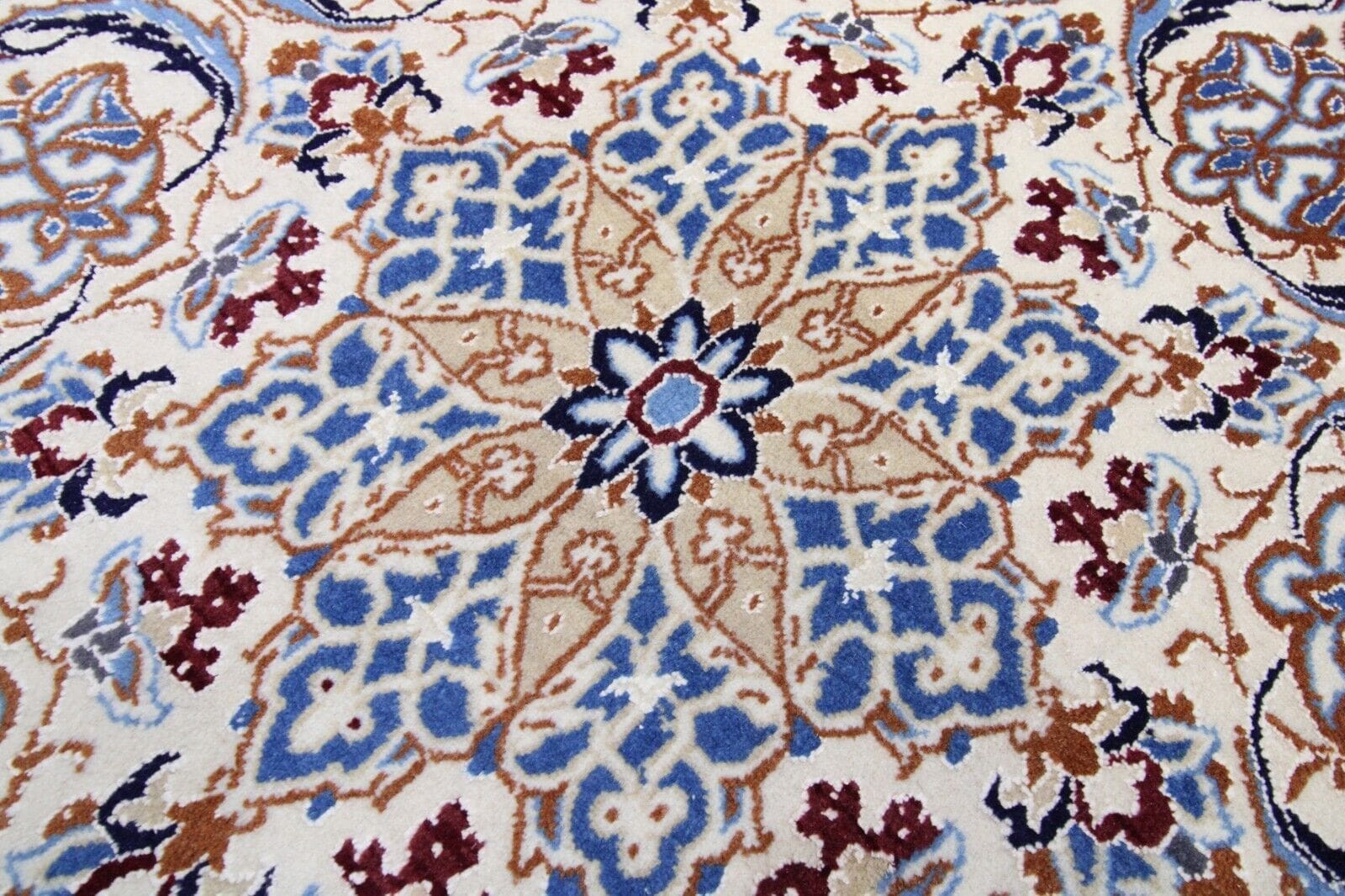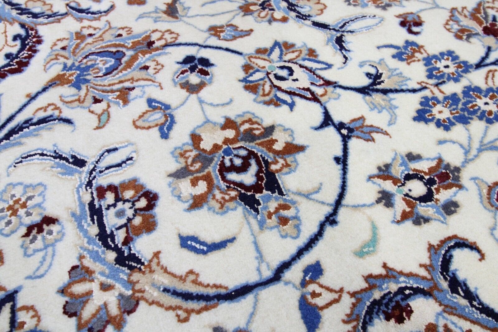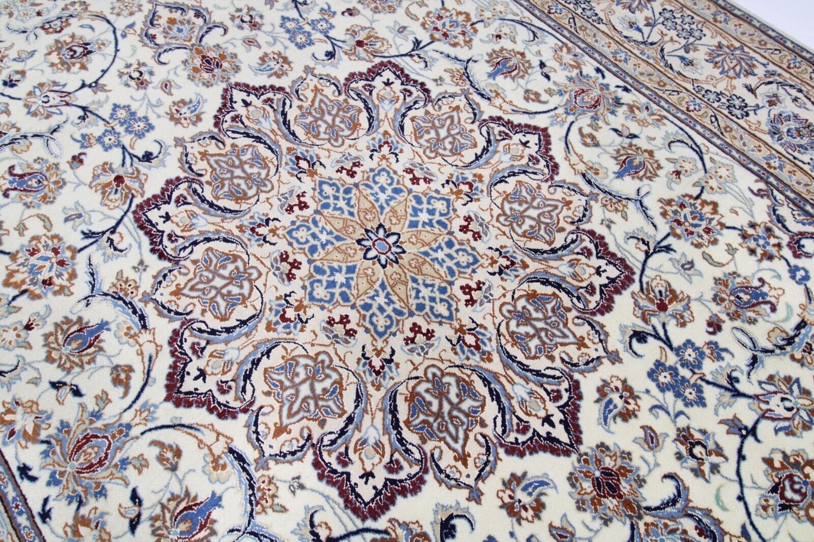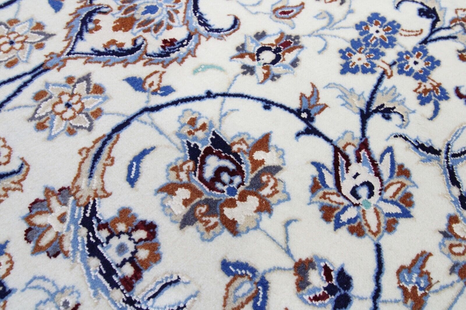 Der Nain 9La Orientteppich ist aus hochwertiger Seide gefertigt. Seide ist bekannt für ihre Langlebigkeit und ihre Fähigkeit, Licht auf eine Weise zu reflektieren, die anderen Materialien nicht gelingt. Der Teppich kombiniert Seide mit Wolle, was ihn sowohl robust als auch weich macht. Die Handknüpftechnik erfordert viel Zeit und Geschick, und jeder Teppich wird als Einzelstück mit individueller Knotendichte und -muster gefertigt. Diese Verarbeitung führt zu einem Teppich, der nicht nur schön, sondern auch dauerhaft ist und ein Leben lang Freude bereitet.