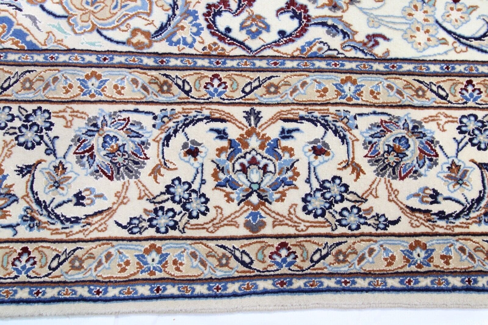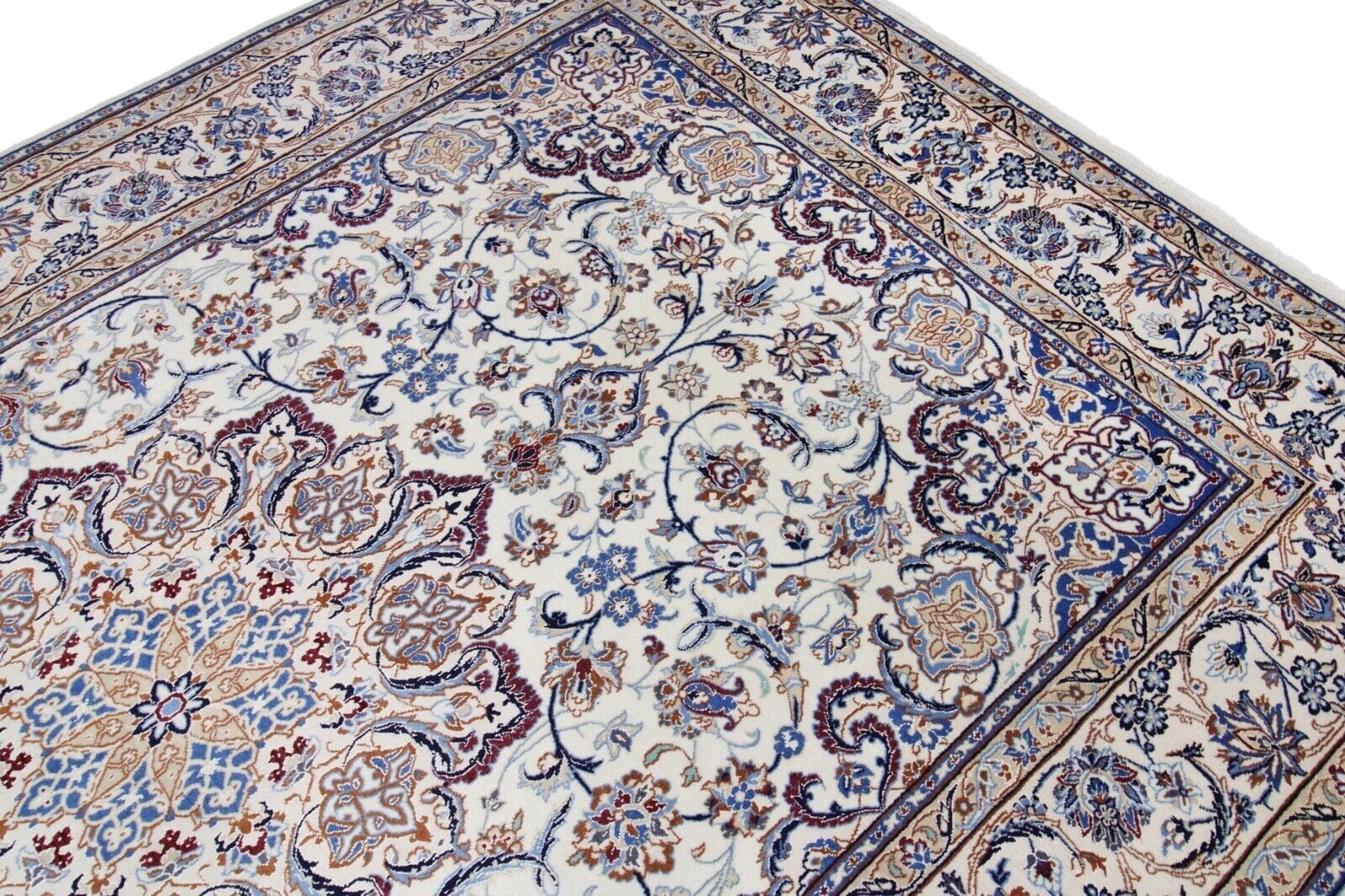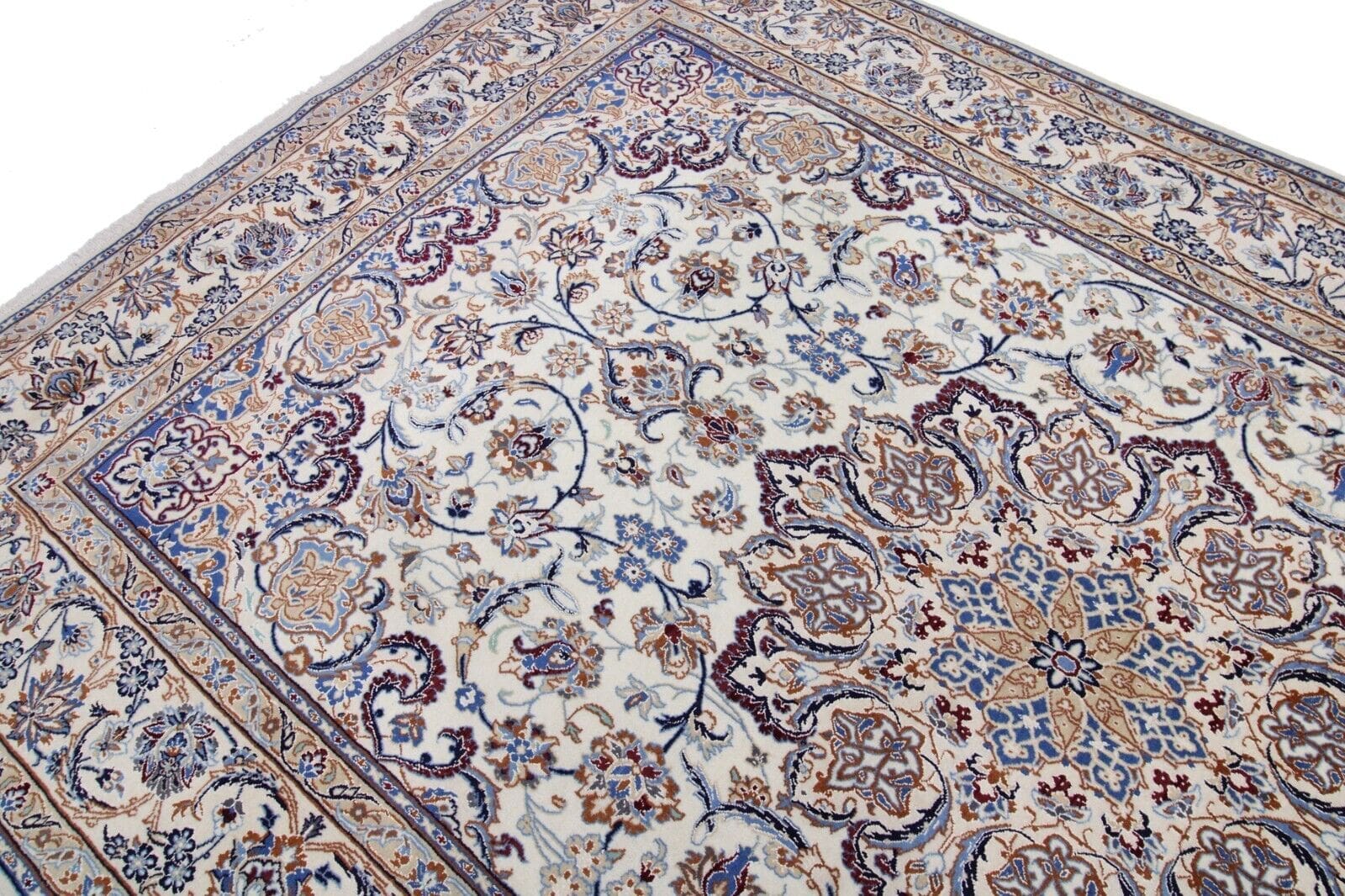 Nain, die Geburtsstätte dieses Teppichs, hat eine lange Geschichte in der Teppichherstellung, die bis ins 18. Jahrhundert zurückreicht. Die Stadt ist berühmt für ihre kunstvoll gestalteten Teppiche, die oft florale Muster und komplexe geometrische Designs enthalten. Nain-Teppiche sind für ihre exquisite Farbgebung bekannt, die in zahlreichen Schattierungen von Blau, Rot, Beige und Gold ausgeführt sein kann. Oft werden natürliche Farbstoffe verwendet, die die Schönheit des Materials bewahren und eine harmonische Gesamterscheinung schaffen. Die Teppichherstellung in Nain wird von Generation zu Generation weitergegeben, und jede Familie hat ihre eigenen Geheimnisse und Techniken, die sie in ihre Arbeiten einfließen lassen.