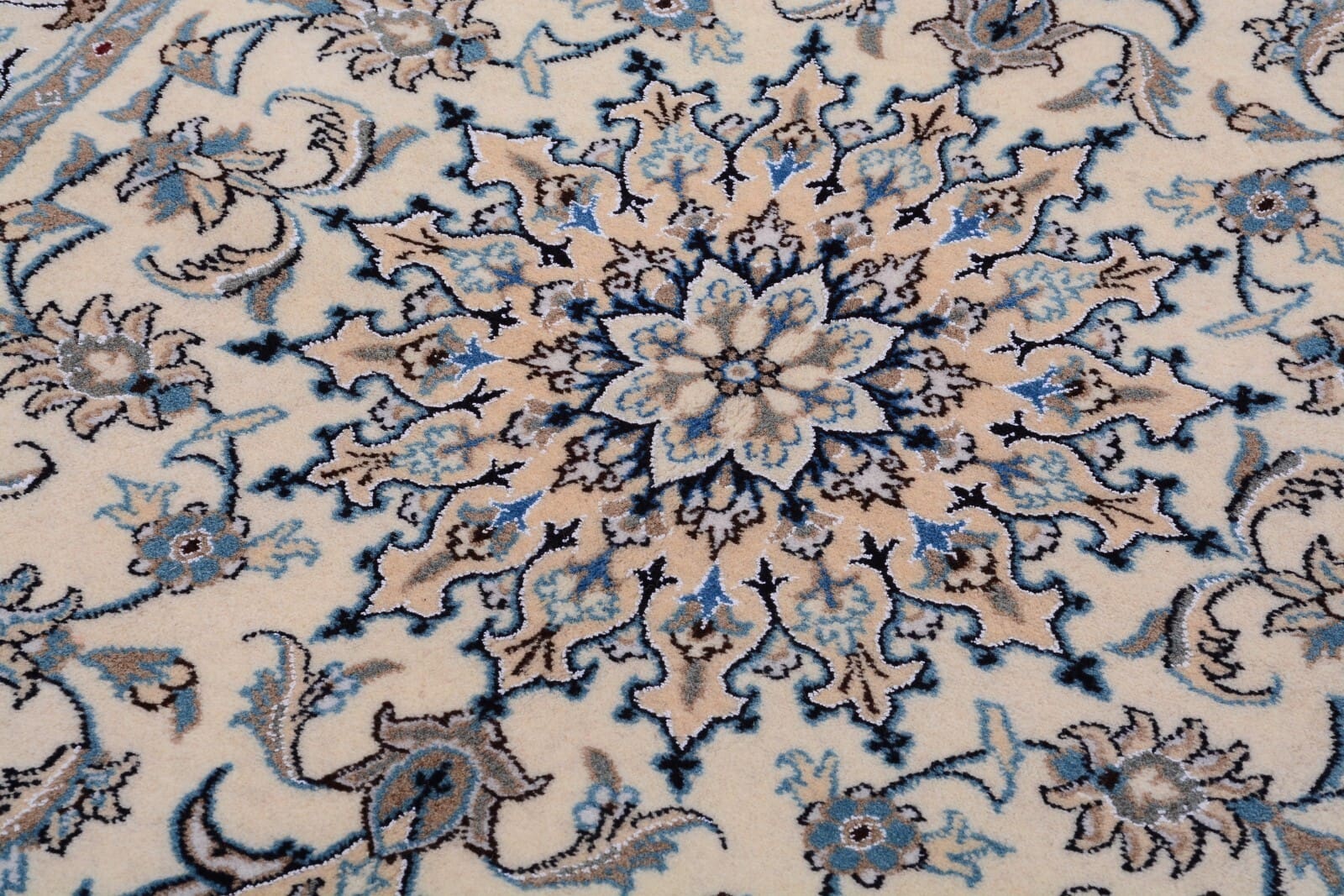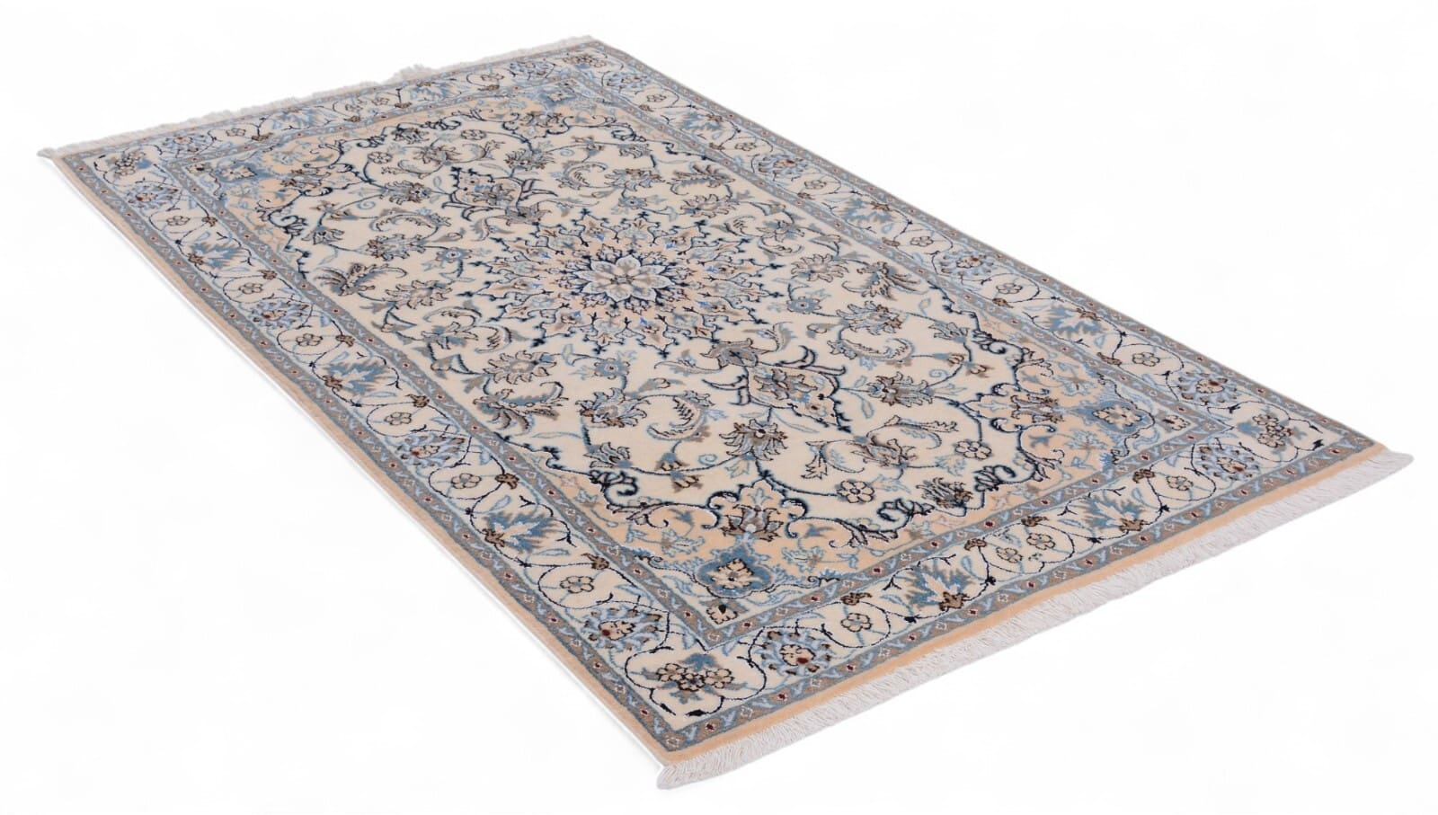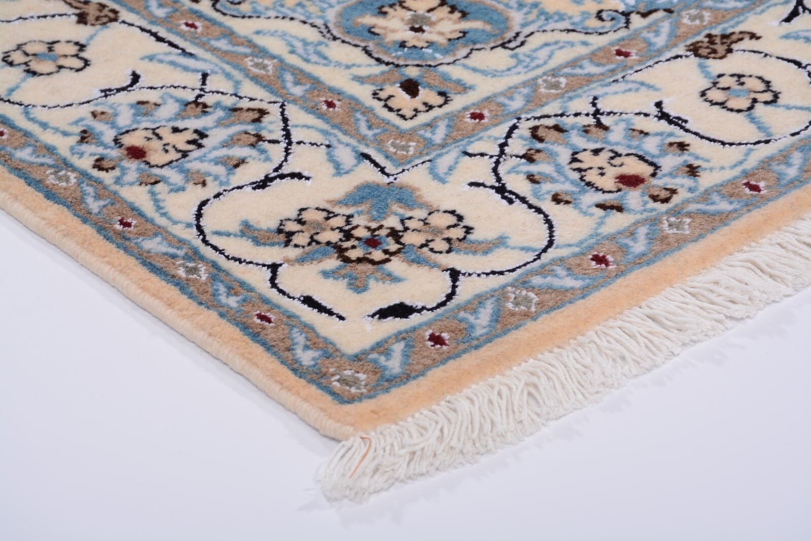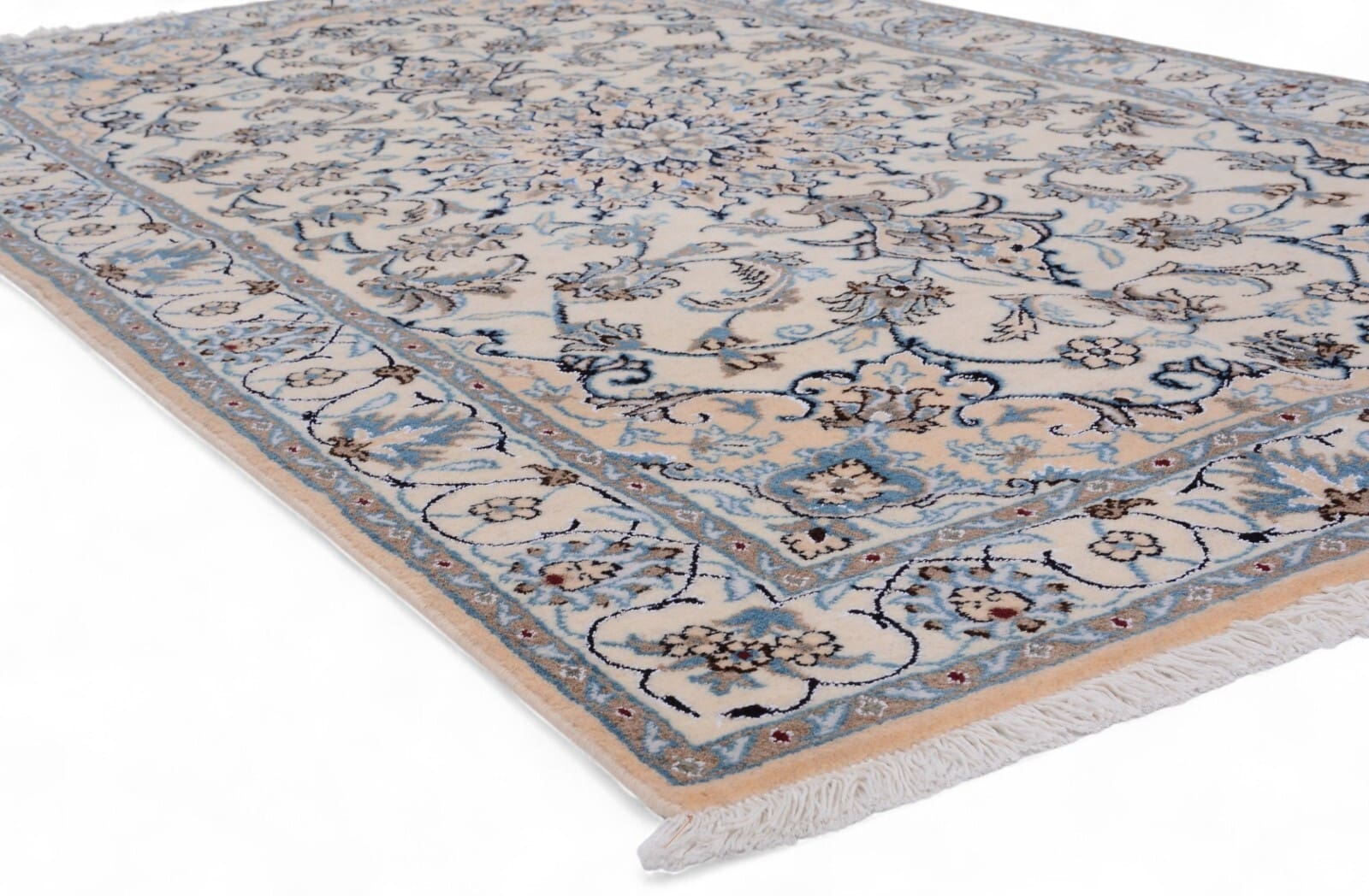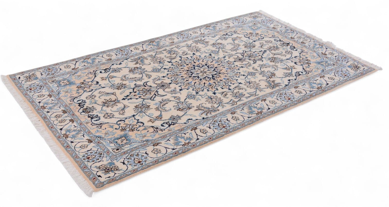 Handgeknüpfter Orientteppich Nain | Größe: 205 x 120 cm | Muster: Floralmotiv mit Medaillon | Material: 100% Schurwolle | Knoten: 300.000/m² | Dicke: ca. 10 mm | Zustand: Neu, perfekt | Herkunft: Persien | Für Fußbodenheizung geeignet | Hohe Farbbeständigkeit
