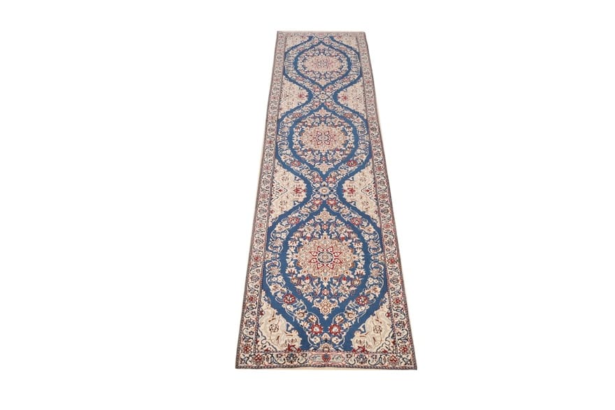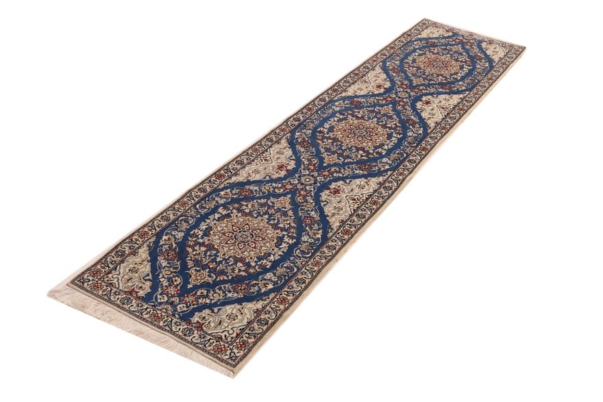 Handgewebter Nain-Teppich | Knotendichte: 450.000-500.000 Knoten/m² | Material: 100 % Wolle und Seide | Größe: 278×65 cm | Farbe: Blau/Türkis | Zustand: Neuzeitlich (0-20 Jahre) | Herkunft: Iran / Persien | Verarbeitung: Handgeknüpft | Dicke: ca. 6 mm | Kette: Baumwolle