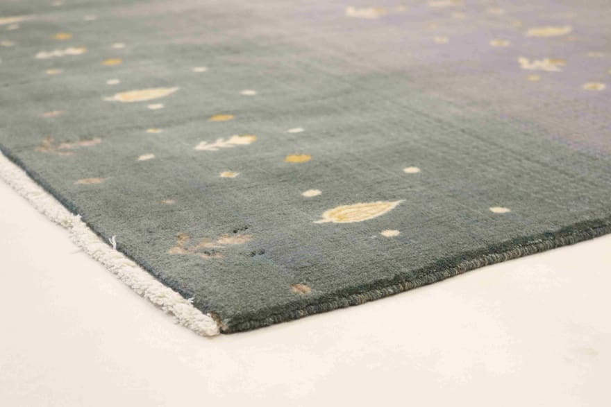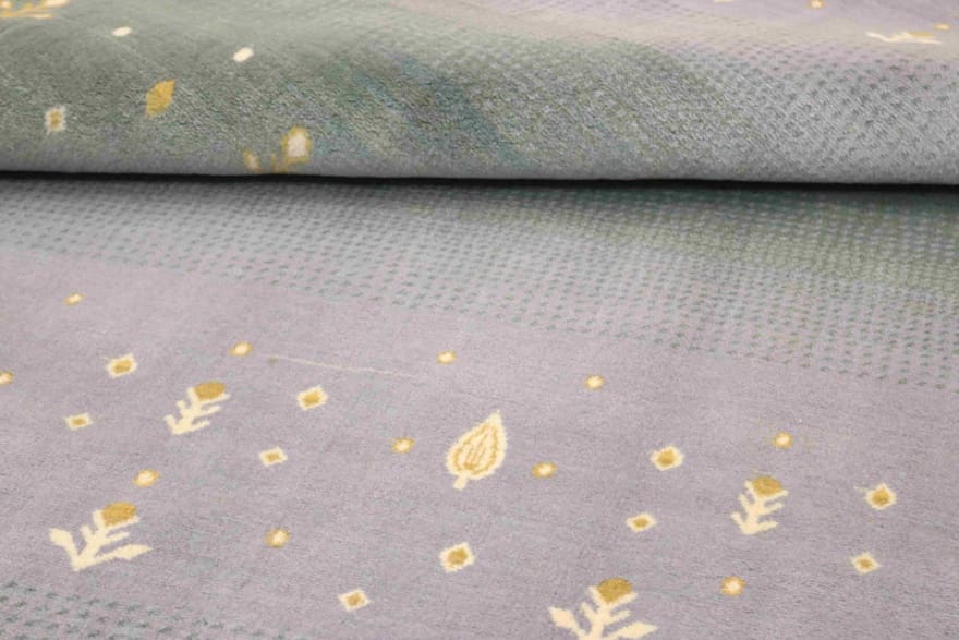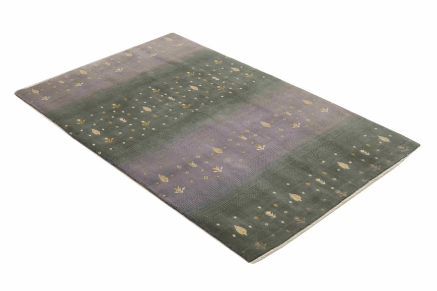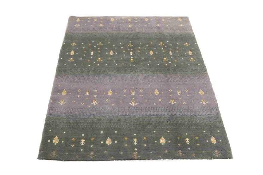 Handgeknüpfter Orientteppich | Knotendichte: 160.000 – 200.000 Knoten/m² | Material: 100 % hochwertige Wolle | Größe: 207×128 cm | Farbe: Flieder zu Grau-Grün mit goldenen und cremefarbenen Motiven | Zustand: Neu | Ursprung: Indien | Dicke: ca. 8 mm | Gewicht: ca. 8 kg