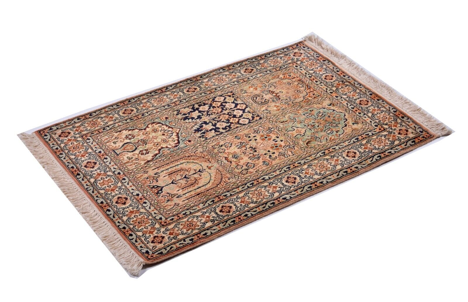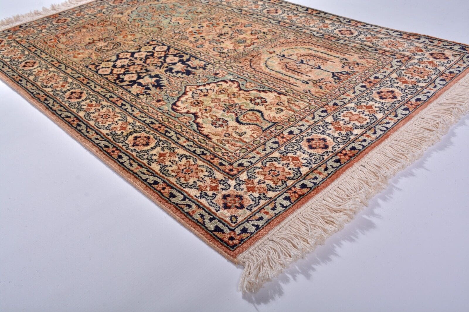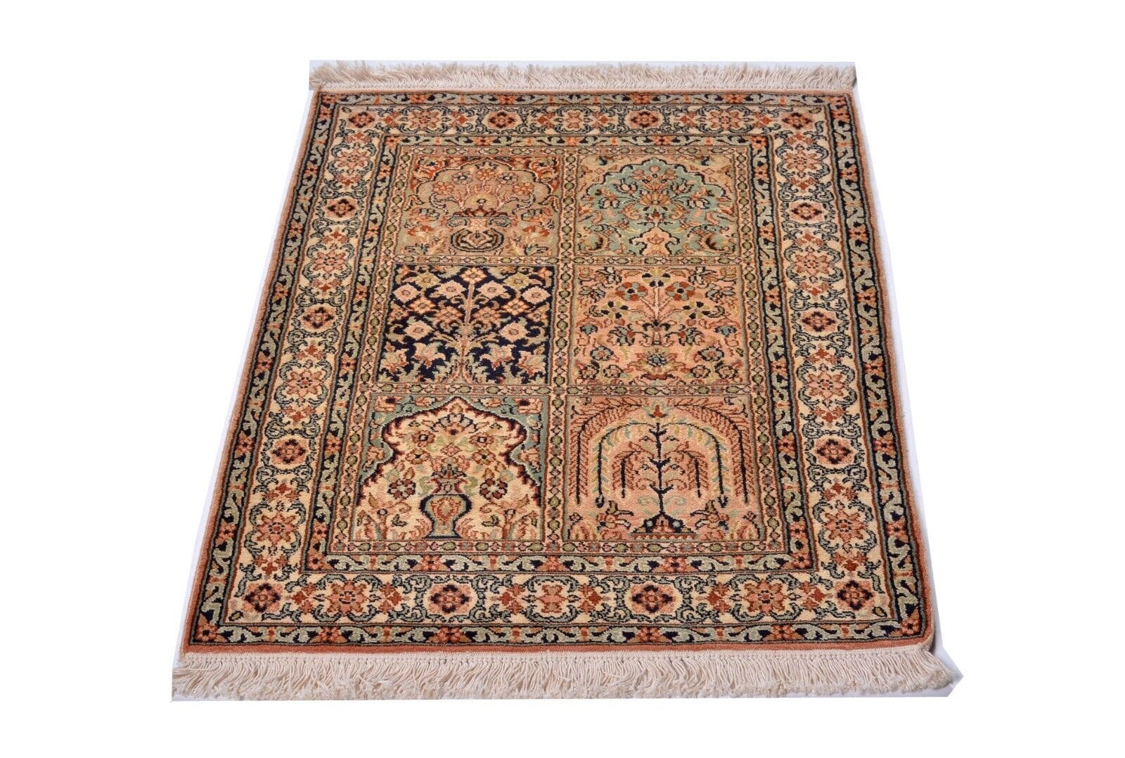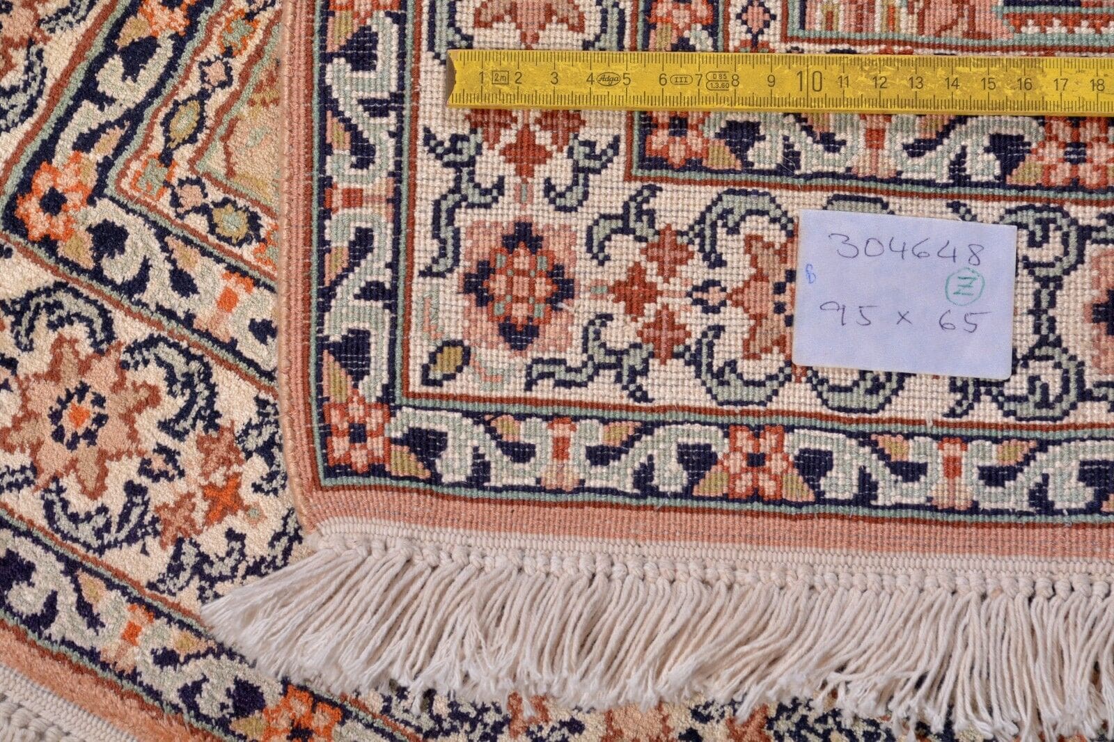 Handgeknüpfter Orientteppich | Größe: 95×65 cm | Knotendichte: 550.000 Knoten/m² | Material: 100% Seide mit 100% Baumwollkette | Zustand: Neu, perfekt | Herkunft: Indien | Muster: Floral | Dicke: ca. 8 mm | Gewicht: ca. 3 kg/m² | Für Fußbodenheizung geeignet | Stil: Traditionell Orientalisch/Persisch