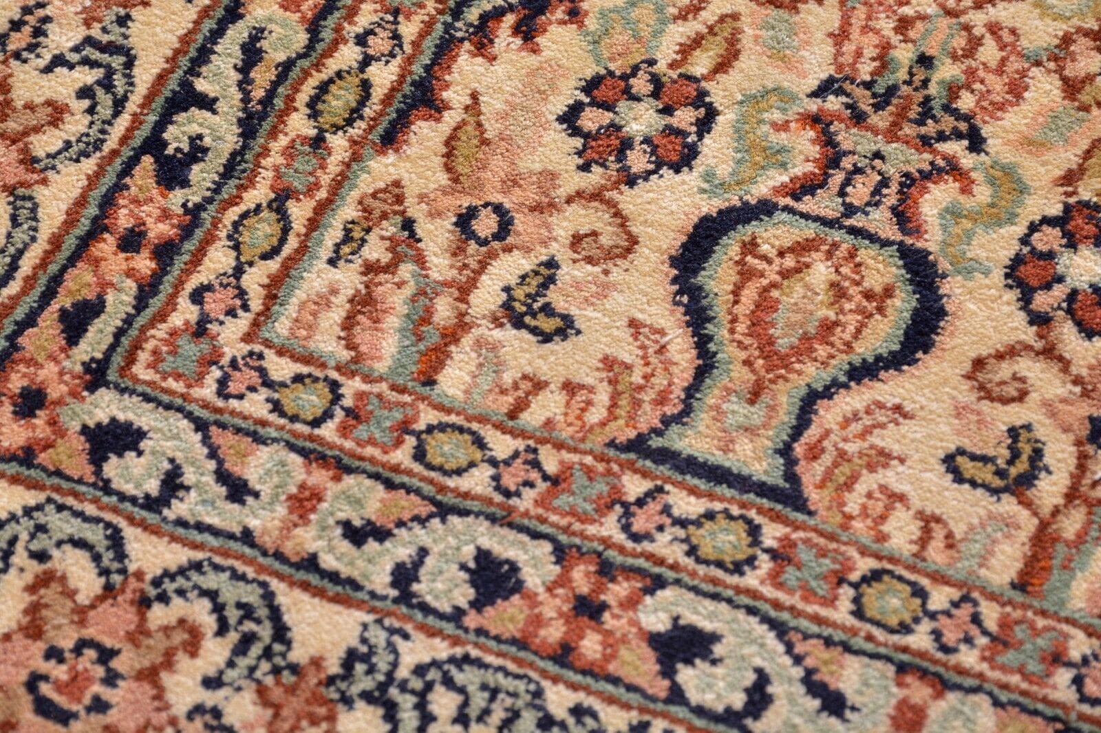 Die Kombination aus der hohen Knotendichte, dem edlen Material und der kunstvollen Verarbeitung macht diesen Teppich zu einem einzigartigen Stück, das sich sowohl in modernen als auch in klassischen Wohnkonzepten harmonisch einfügt. Seine Langlebigkeit und Beständigkeit gegen Abnutzung garantieren, dass er über Generationen hinweg geschätzt werden kann. Außerdem ist dieser Teppich leicht zu pflegen, was seine Attraktivität als Investmentstück erhöht.