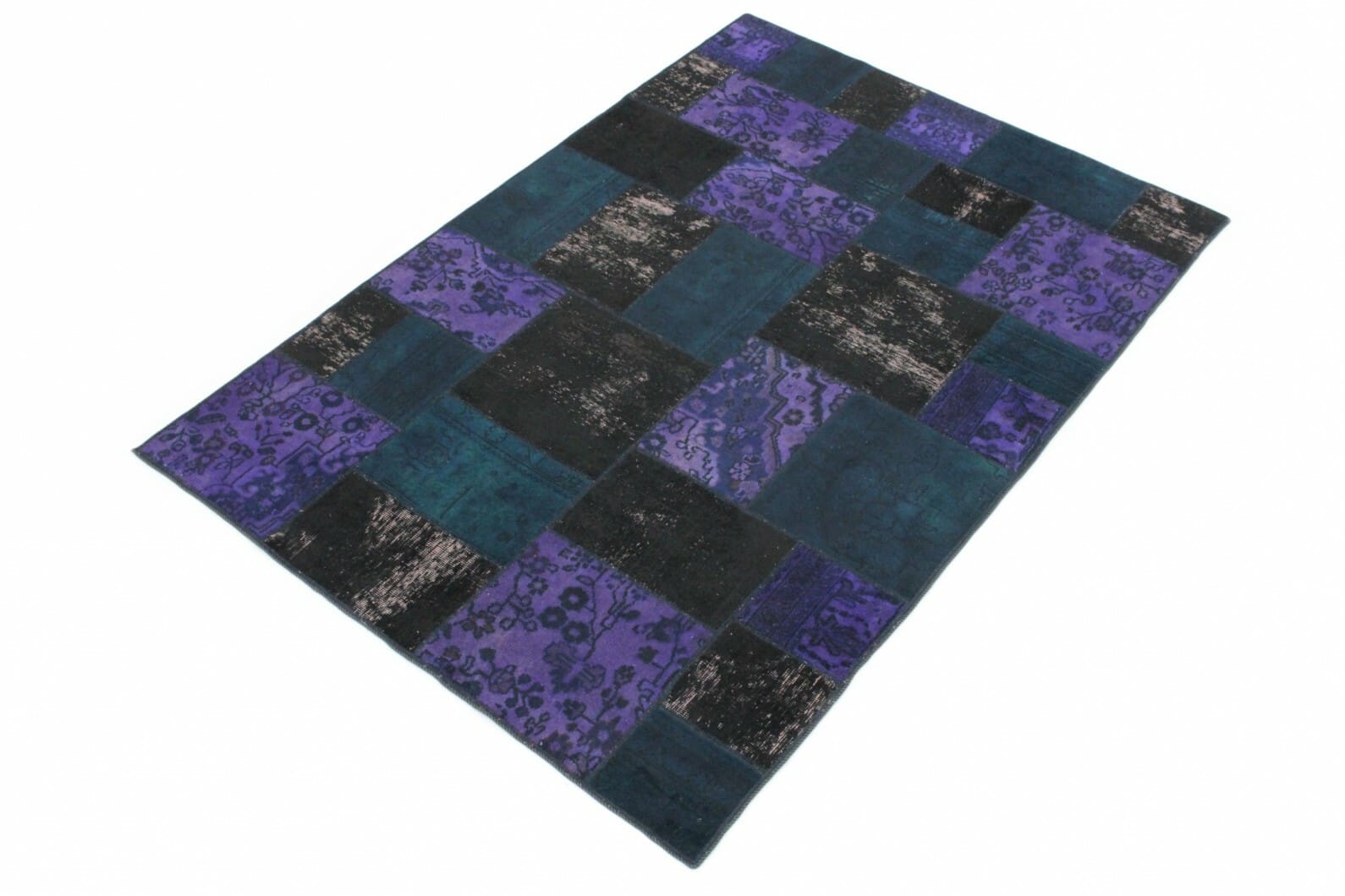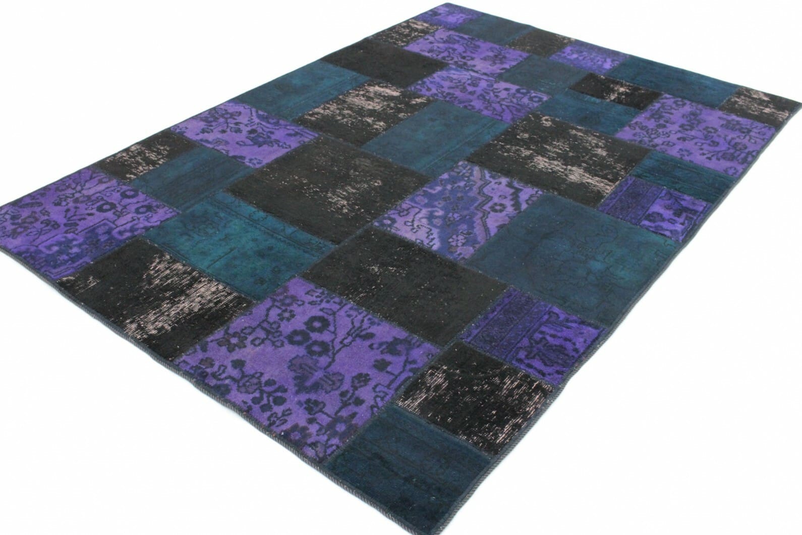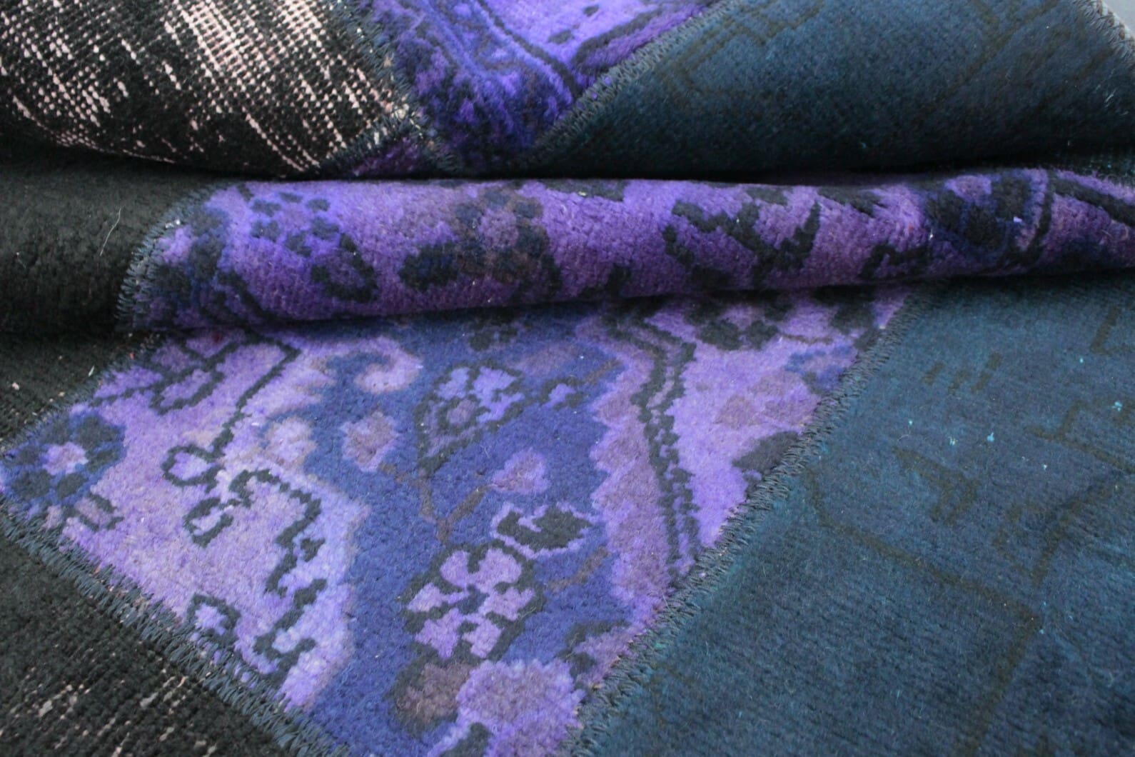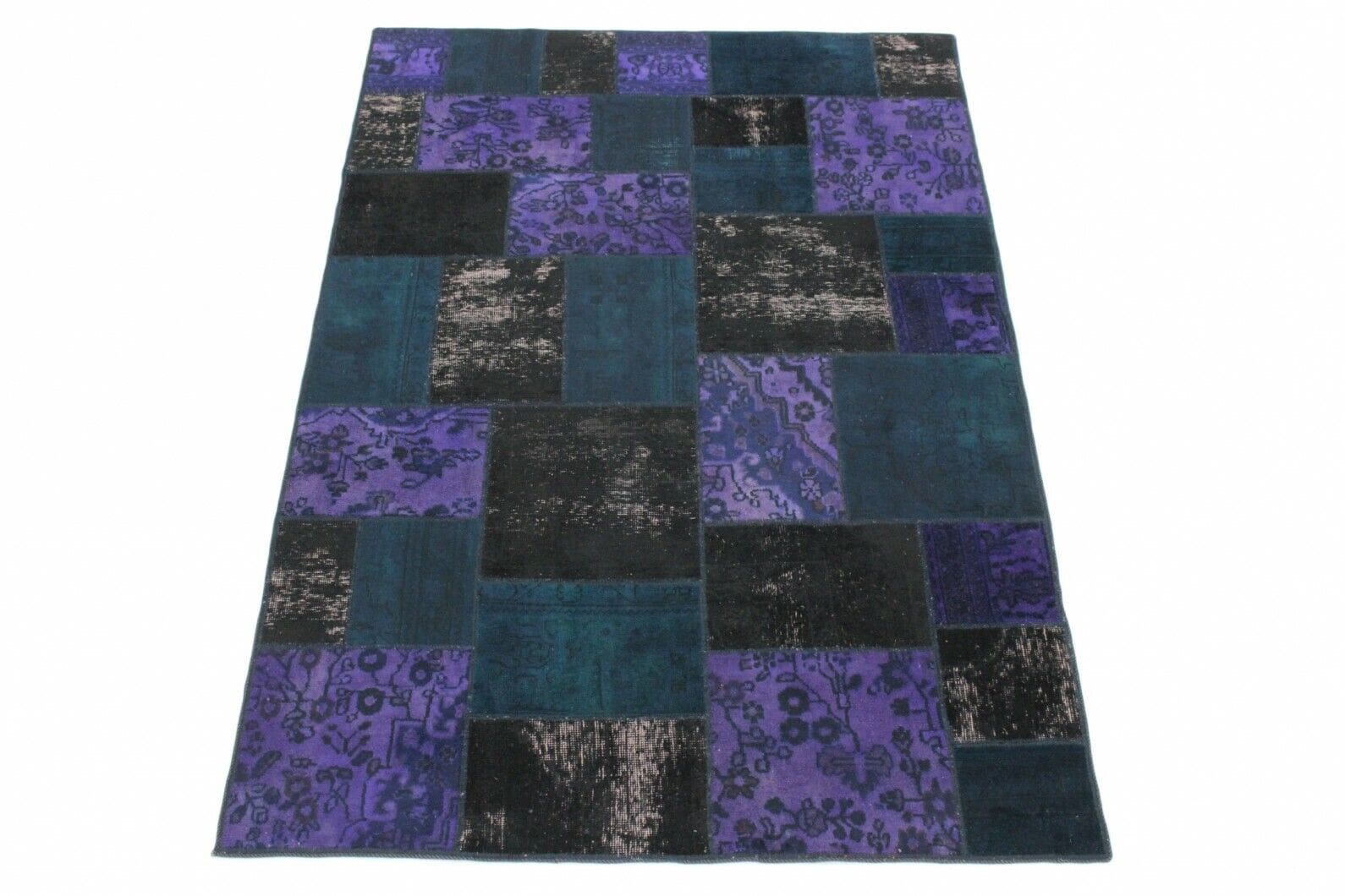 Handgeknüpfter Patchwork Teppich | Farben: Lila, Blau, Schwarz | Material: Handgesponnene Wolle und Baumwolle | Größe: 242×171 cm | Zustand: Neu mit Etikett | Herkunft: Orient | Stil: Modern, Vintage Patchwork | Geeignet für Fußbodenheizung | Ideal für Wohnzimmer, Schlafzimmer und Arbeitszimmer