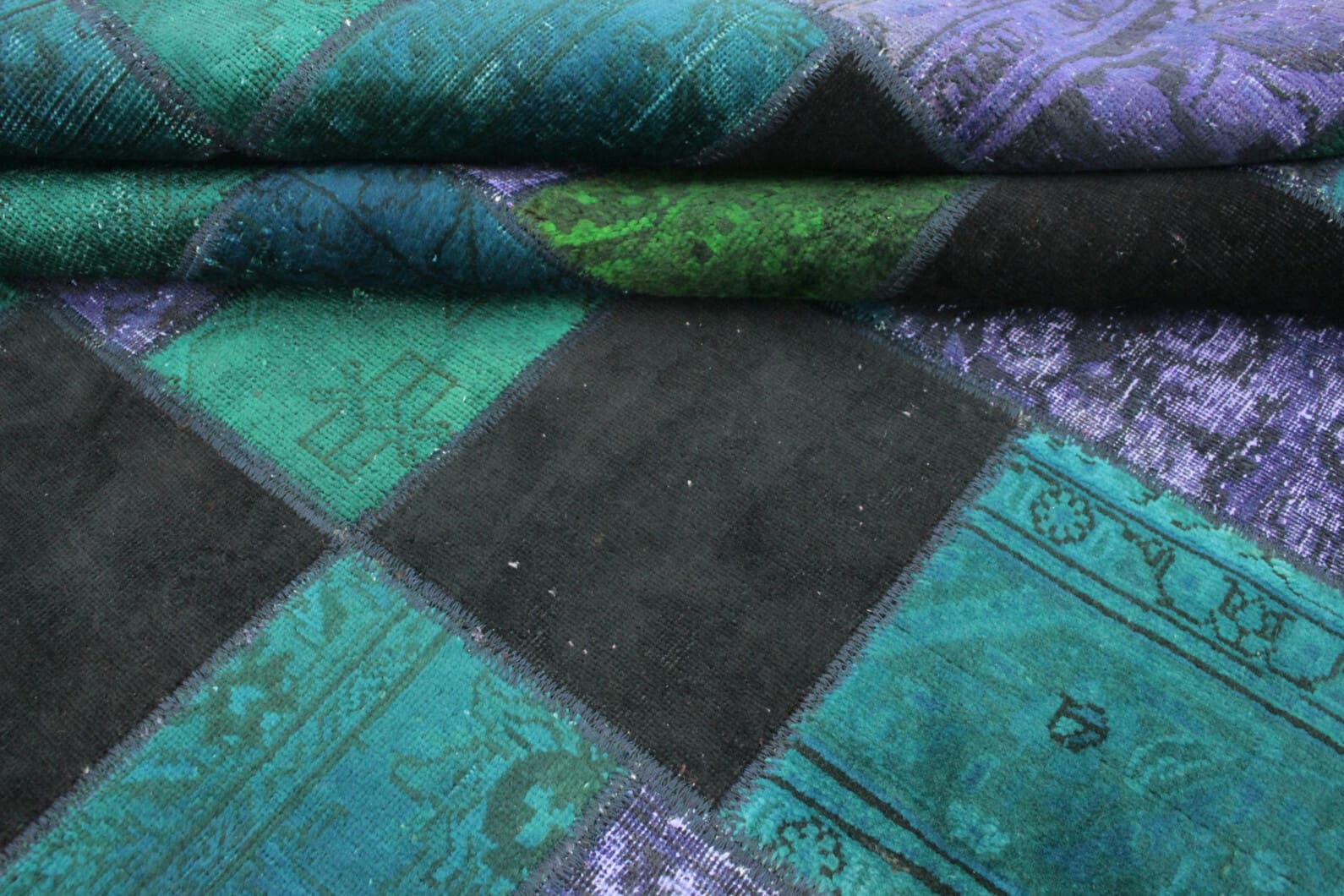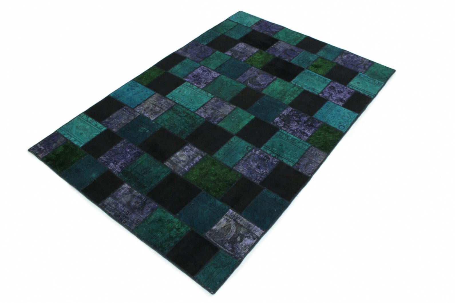 Handgeknüpfter Patchwork Teppich | Größe: 310×201 cm | Material: Handgesponnene Wolle und Baumwolle | Farbe: Türkis und Lila | Zustand: Neu mit Etikett | Herkunft: Orient | Stil: Vintage Patchwork | Für Fußbodenheizung geeignet | Ideal für Wohnzimmer, Schlafzimmer, Esszimmer und Arbeitszimmer