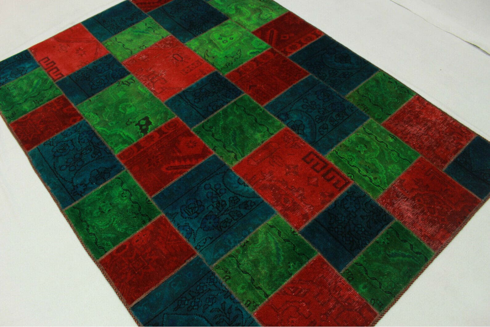 Handgeknüpfter Patchwork Teppich | Größe: 203×151 cm | Muster: Patchwork in Grün, Rot, Blau | Material: Handgesponnene Wolle mit Baumwoll-Kettfaden | Zustand: Neu mit Etikett | Herkunft: Orient | Stil: Modern, Vintage | Geeignet für Fußbodenheizung | Alter: 20 – 50 Jahre