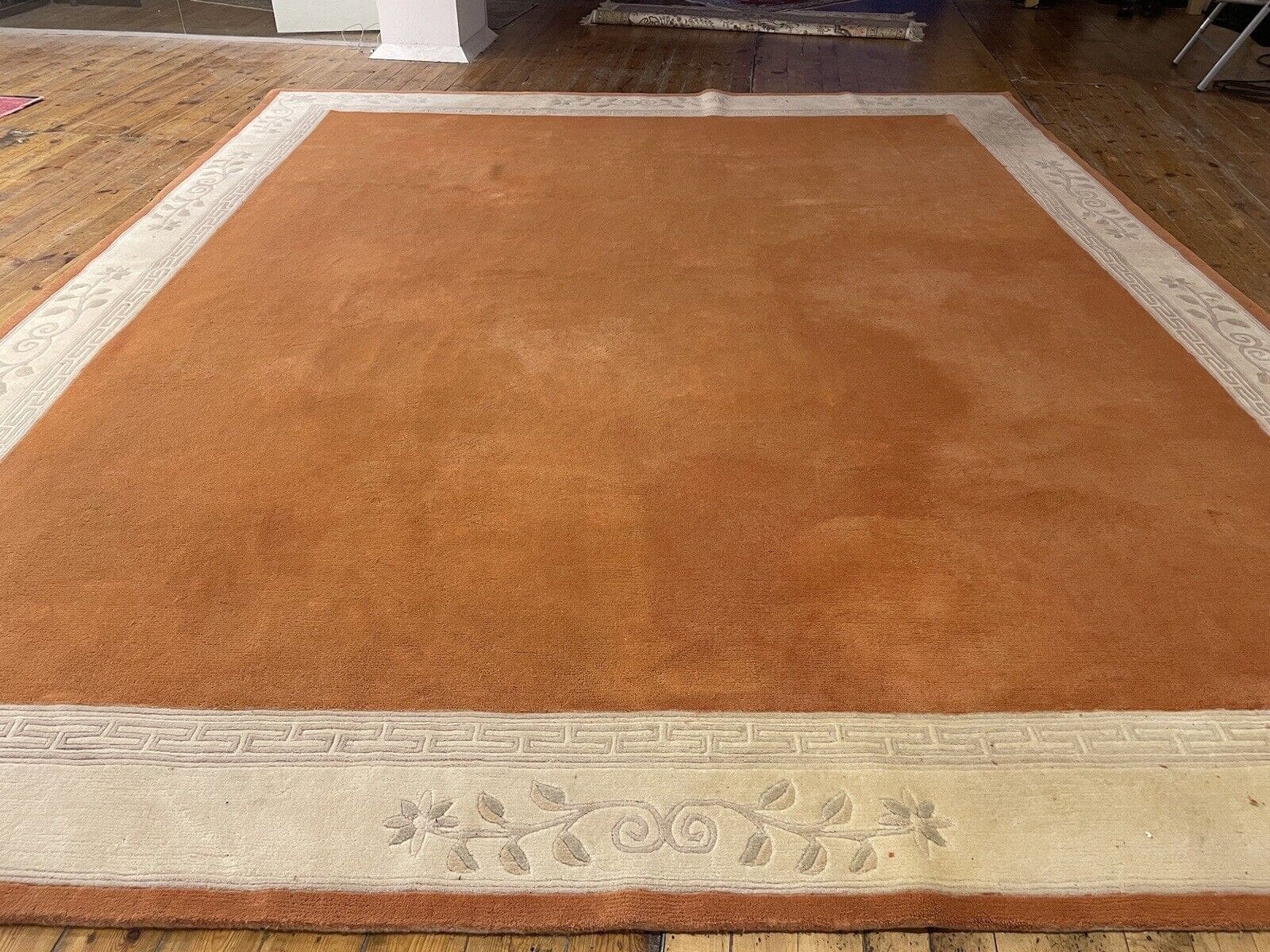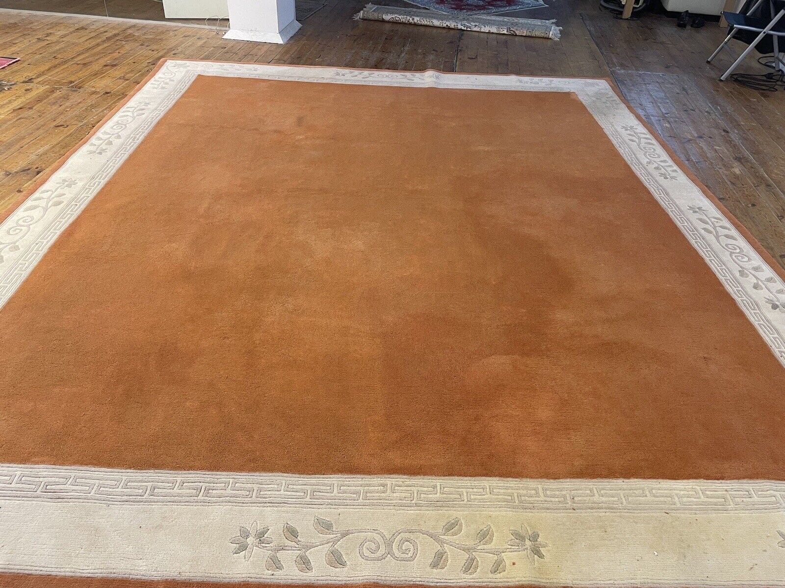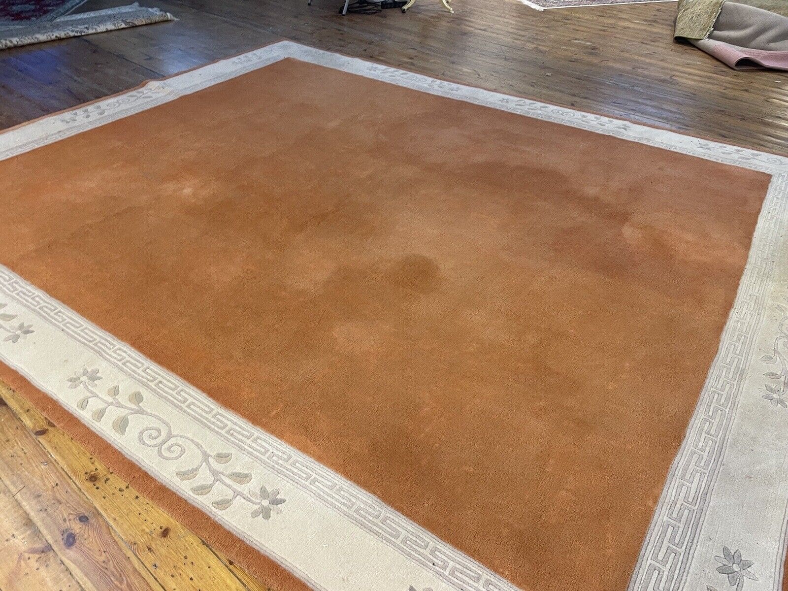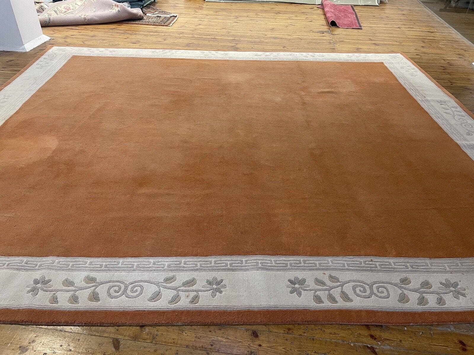 Handgeknüpfter Teppich aus Schurwolle | Größe: 400×350 cm | Florhöhe: 15 mm | Muster: Abstrakt | Farben: Orange und Braun | Für Fußbodenheizung geeignet | Zustand: Neu ohne Etikett | Herstellungsland: Nepal | Stil: Europäisch | Material: Wolle und Baumwolle