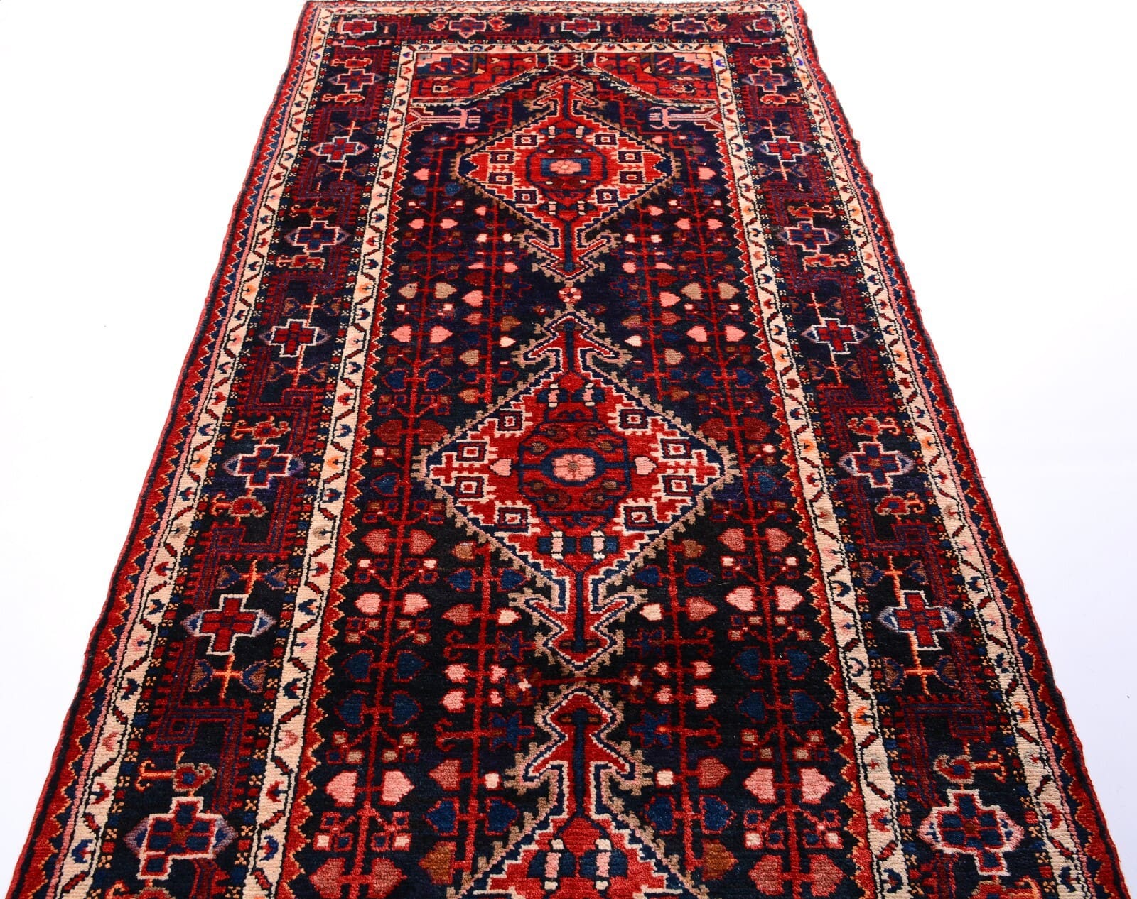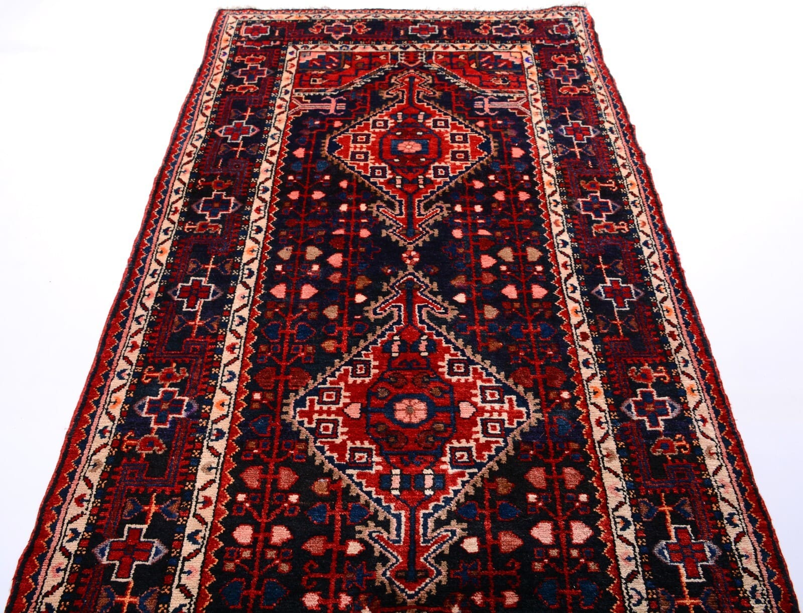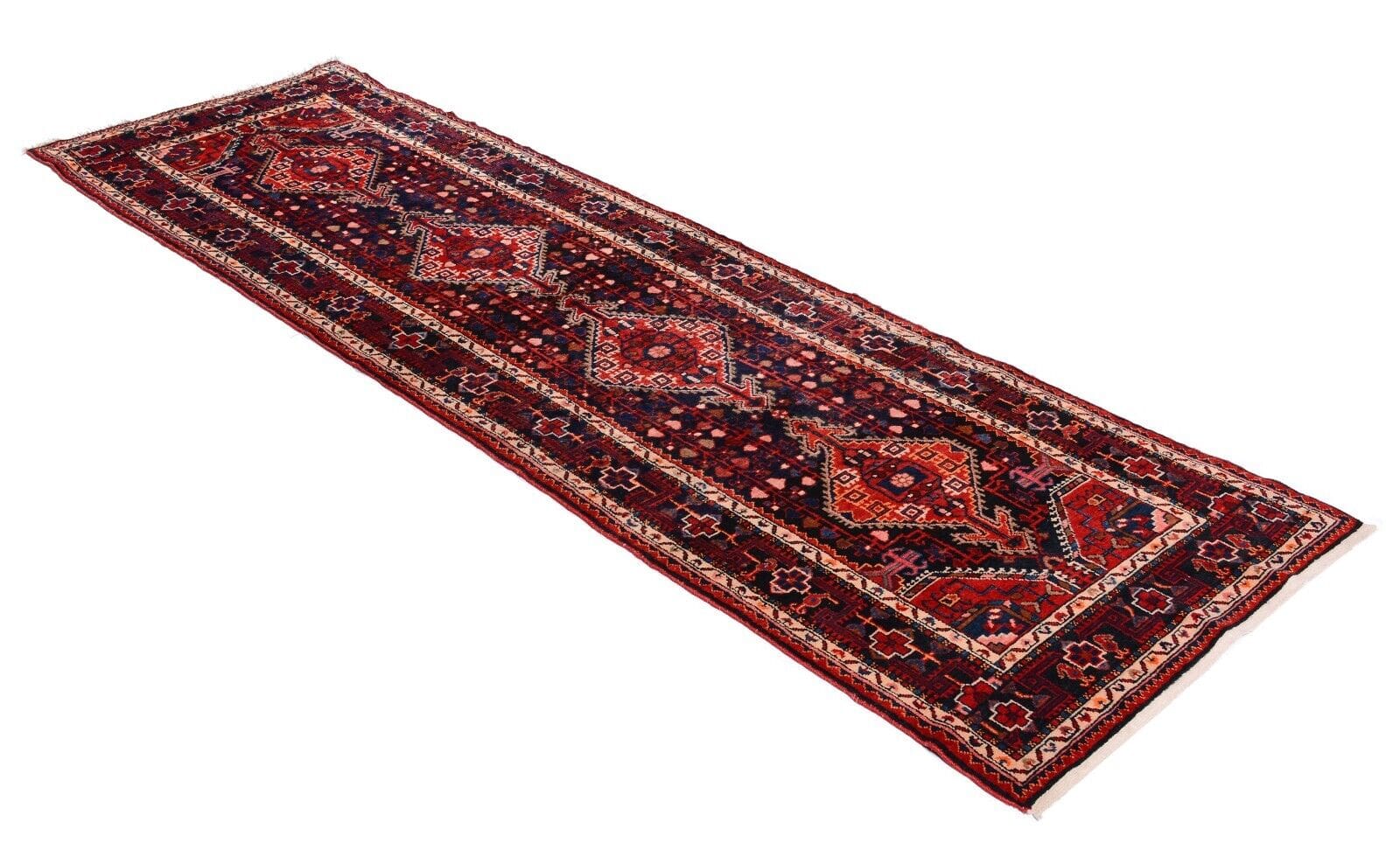 Handgeknüpfter Orientteppich Hamadan | Größe: 390 x 117 cm | Knotendichte: 250.000 Knoten/m² | Material: 100% Schurwolle, Kette: 100% Baumwolle | Zustand: Neu, unbenutzt | Muster: Geometrisch | Herkunft: Persien | Für Fußbodenheizung geeignet | Dicke: ca. 10 mm | Gewicht: 3 kg/m² | Stil: Orientalisch/Asiatisch | Epoche: 2000 bis jetzt