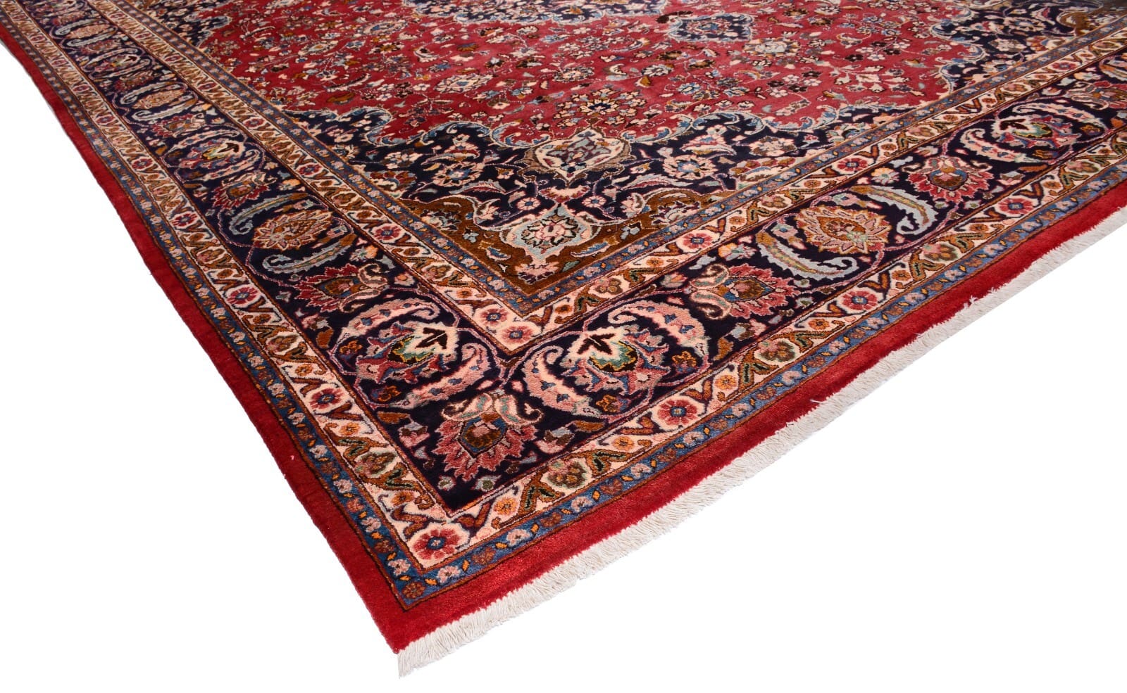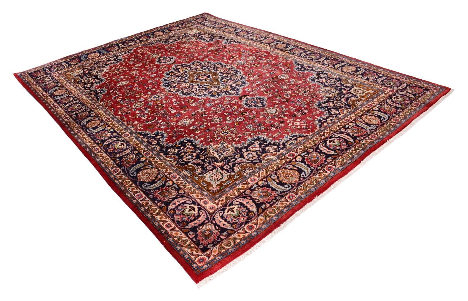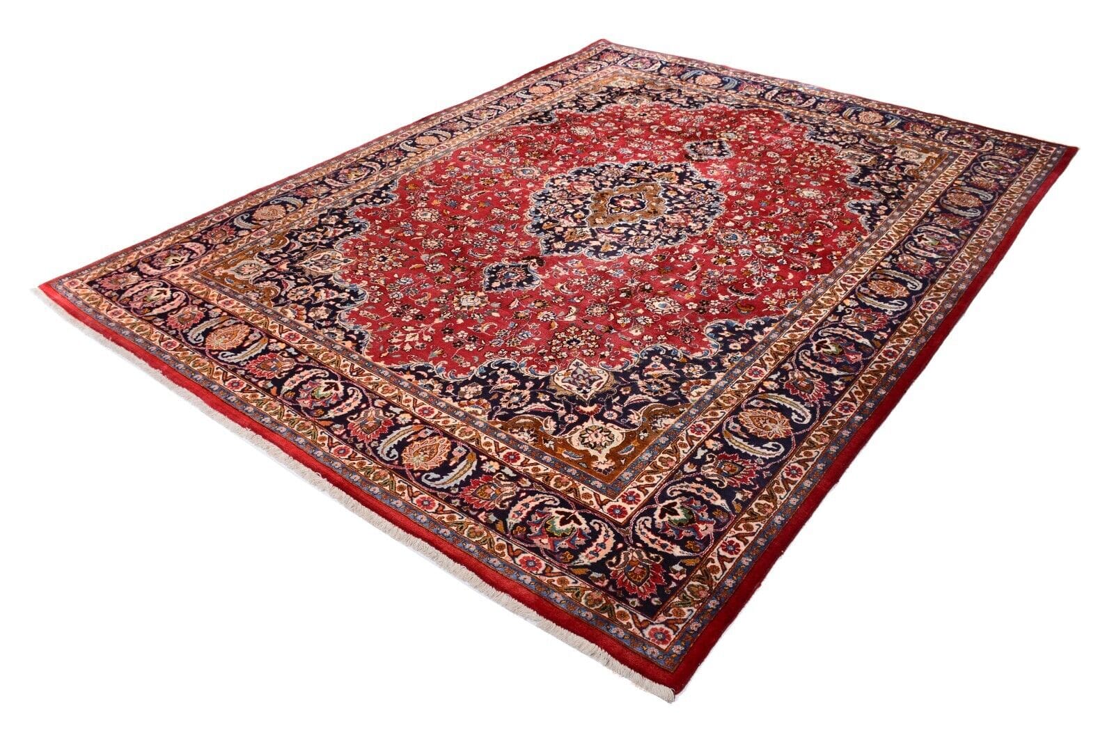 Handgeknüpfter Perser Teppich Mashad | Größe: 386 x 298 cm | Knotendichte: 300.000 Knoten/m² | Material: 100% Schurwolle, Kette aus 100% Baumwolle | Zustand: Sehr gut, unbenutzt, 30 Jahre alt | Muster: Florales Medaillon | Dicke: ca. 14 mm | Gewicht: ca. 4 kg/m² | Herkunft: Persien | Für Fußbodenheizung geeignet | Stil: Traditionell orientalisch/persisch
