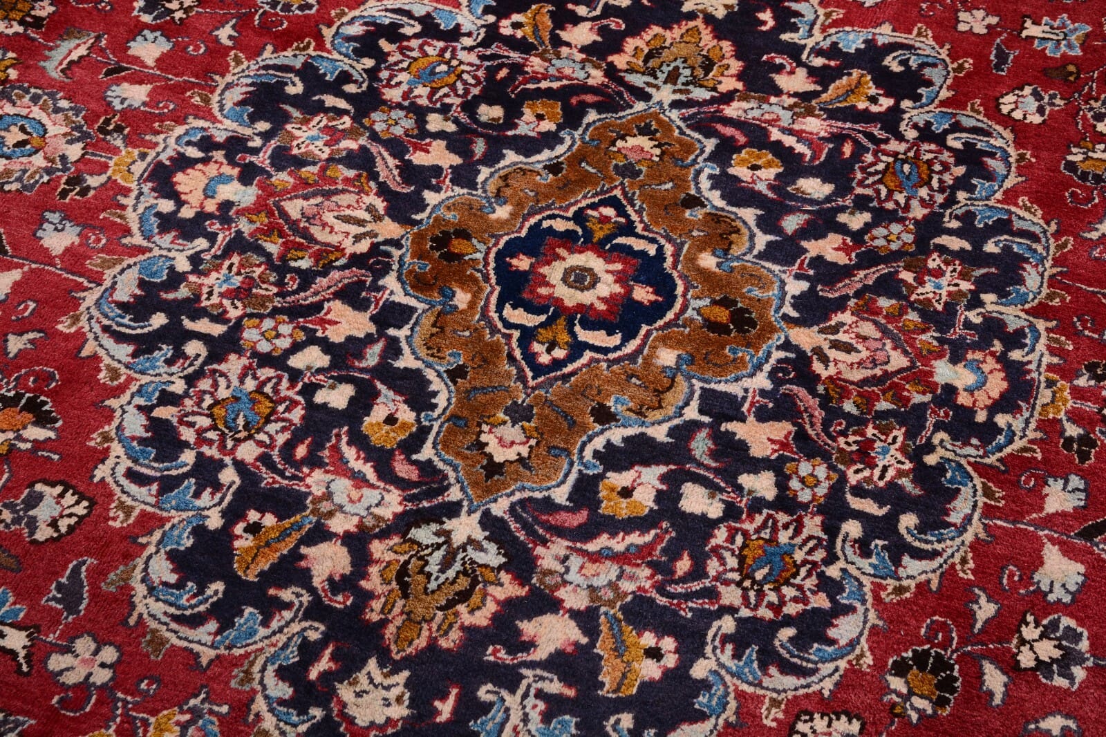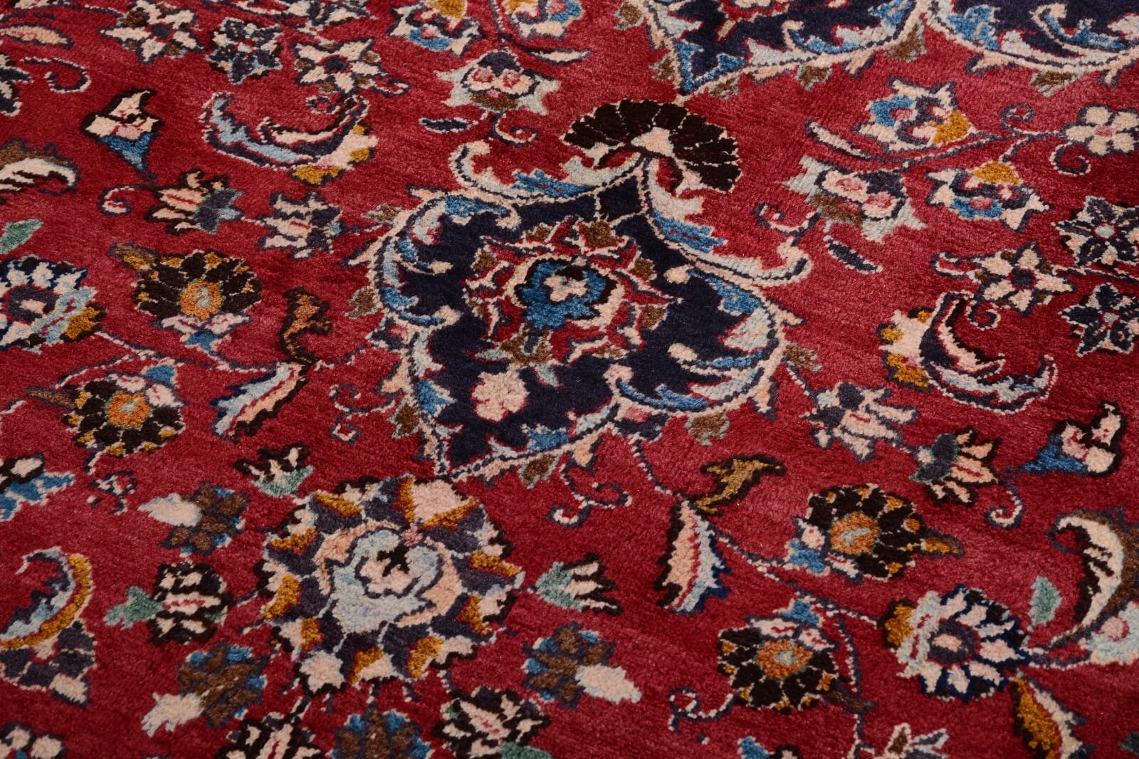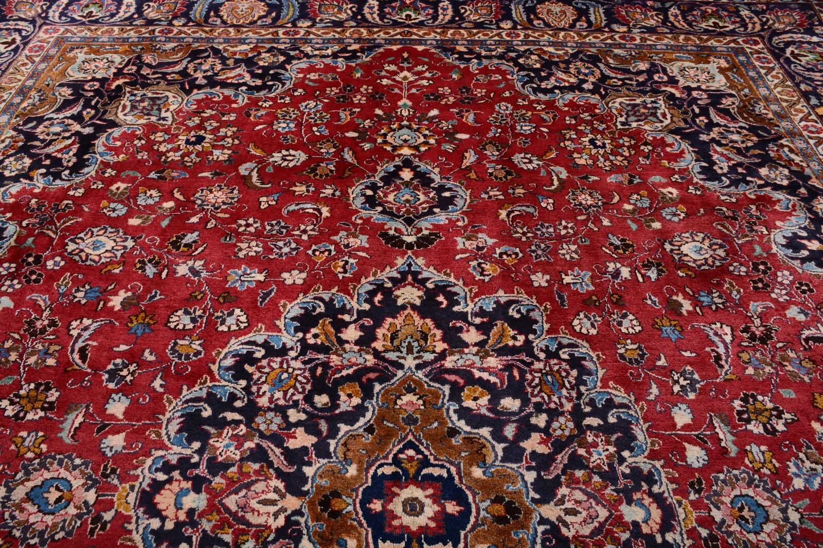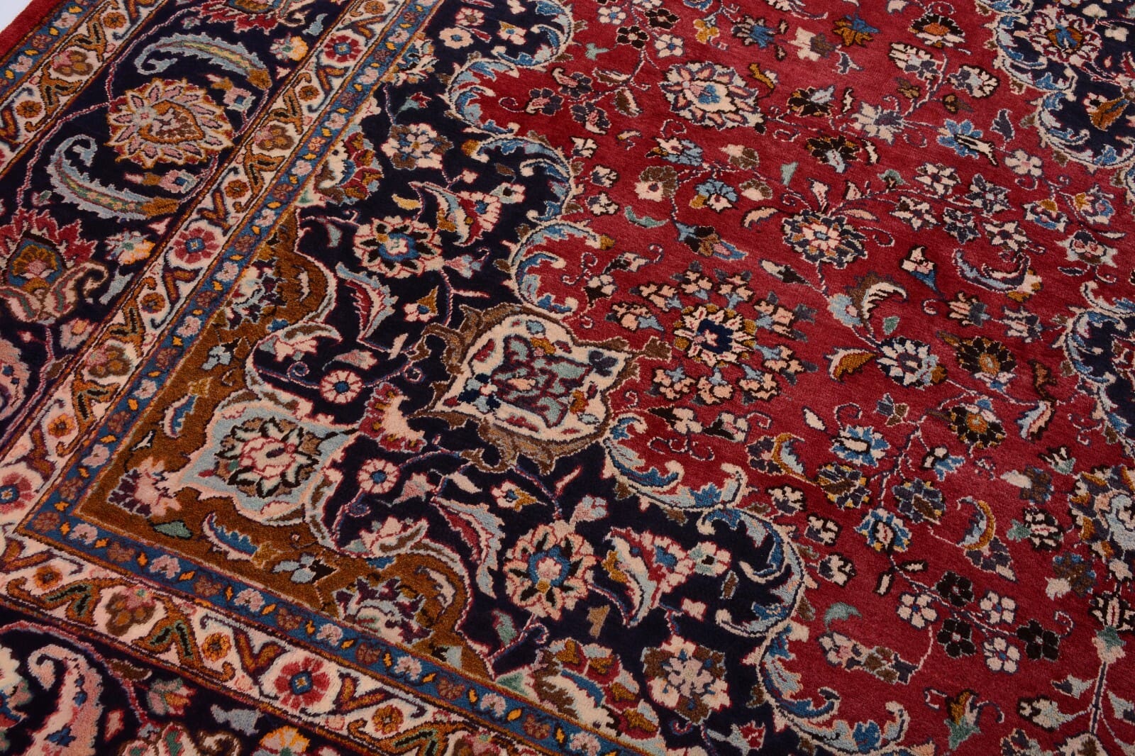 Handgeknüpfter Perser Teppich Mashad | Größe: 386 x 298 cm | Knotendichte: 300.000 Knoten/m² | Material: 100% Schurwolle, Kette aus 100% Baumwolle | Zustand: Sehr gut, unbenutzt, 30 Jahre alt | Muster: Florales Medaillon | Dicke: ca. 14 mm | Gewicht: ca. 4 kg/m² | Herkunft: Persien | Für Fußbodenheizung geeignet | Stil: Traditionell orientalisch/persisch
