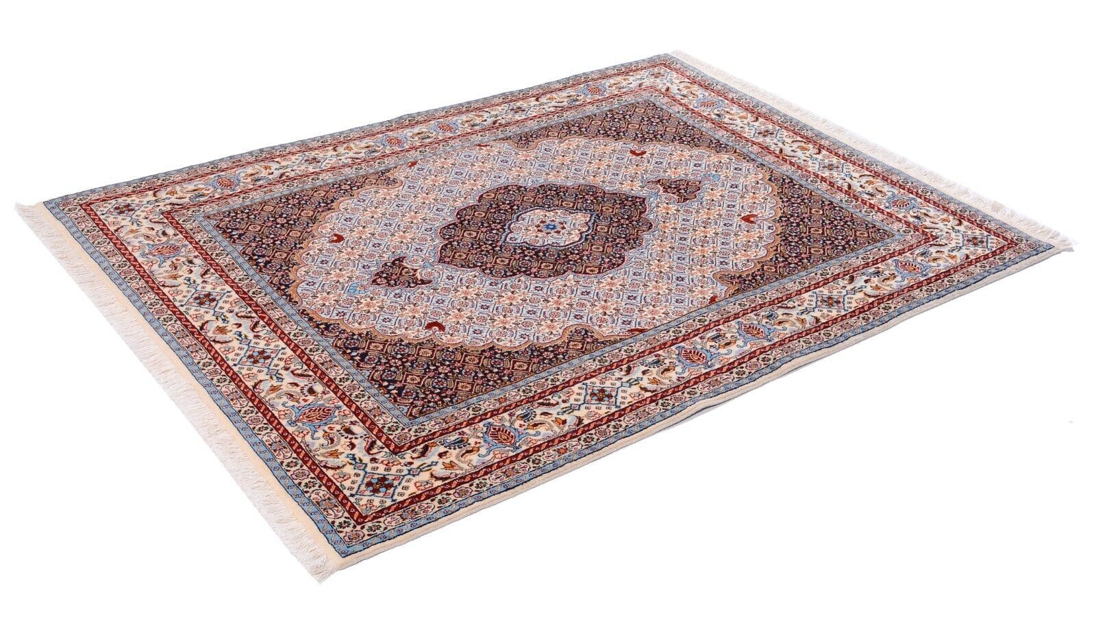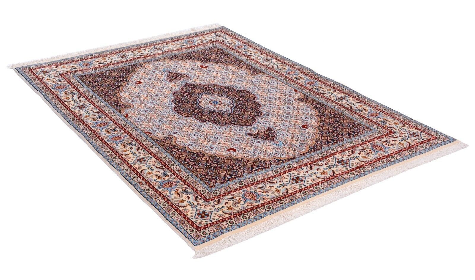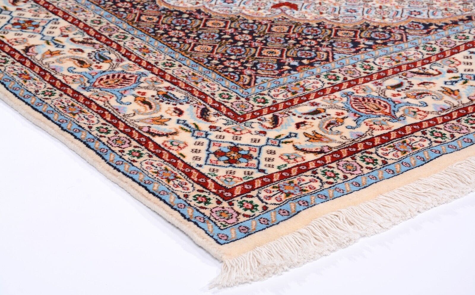 Handgeknüpfter Perserteppich Moud | Größe: 195×146 cm | Knotendichte: 375.000 Knoten/m² | Material: 100% Schurwolle | Kette: 100% Baumwolle | Zustand: Neu | Herkunft: Persien | Muster: Orientalisch mit Medaillon | Dicke: ca. 10 mm | Für Fußbodenheizung geeignet | Gewicht: ca. 3 kg/m²