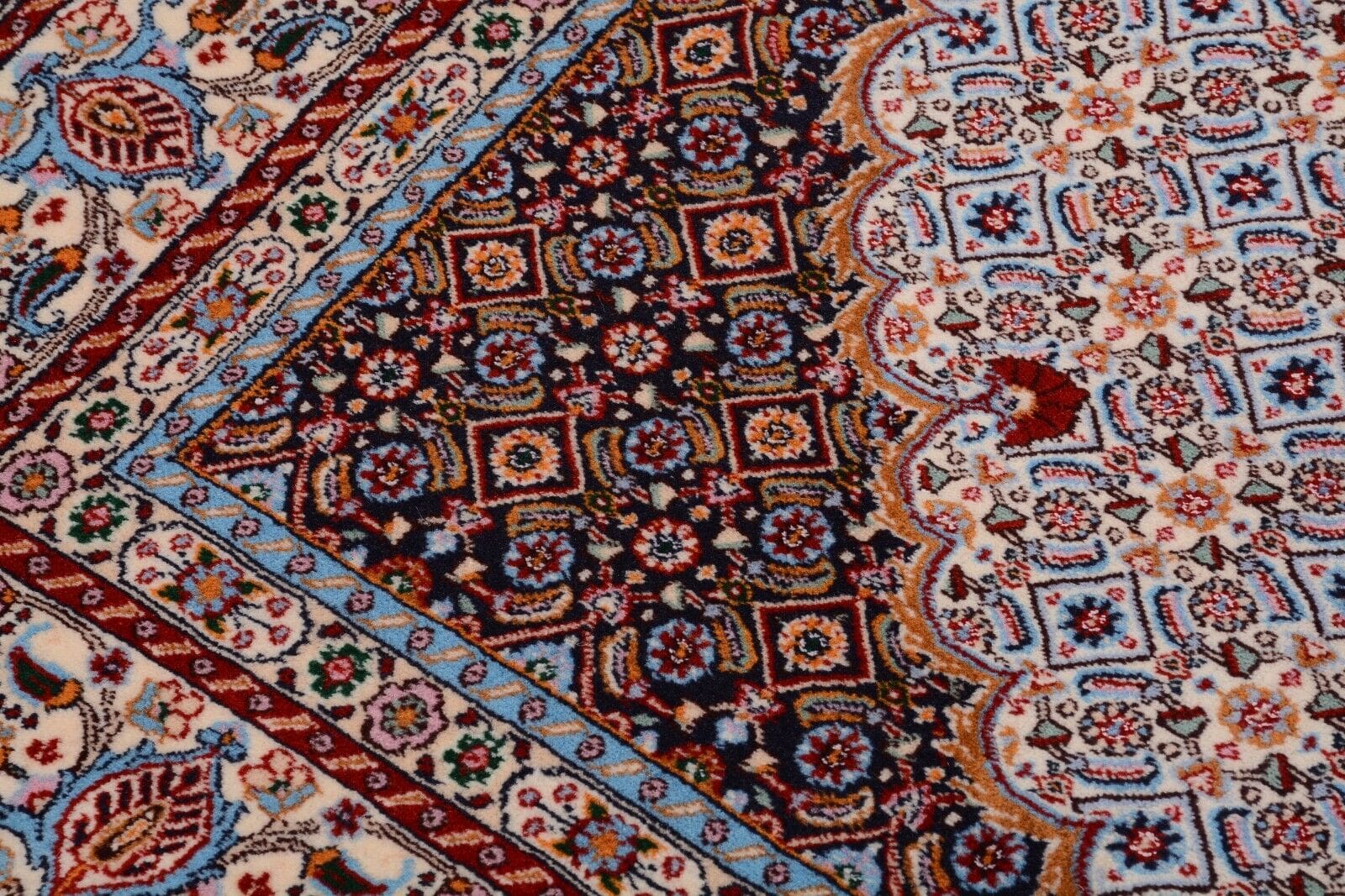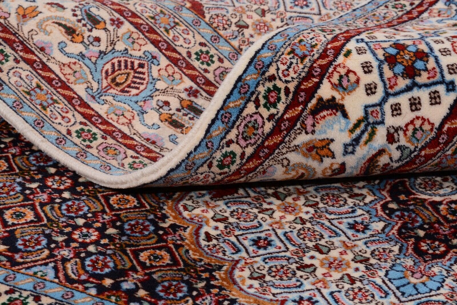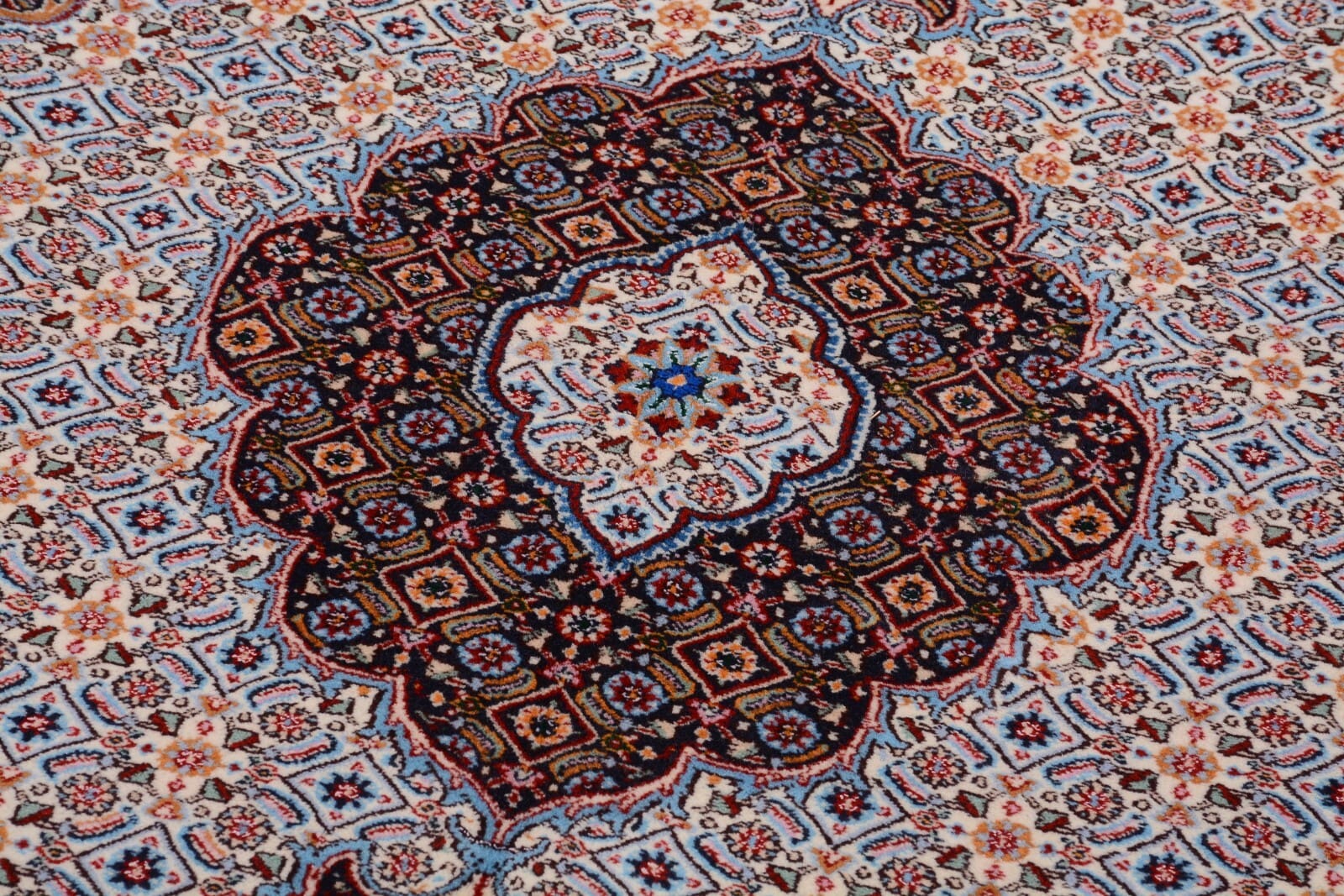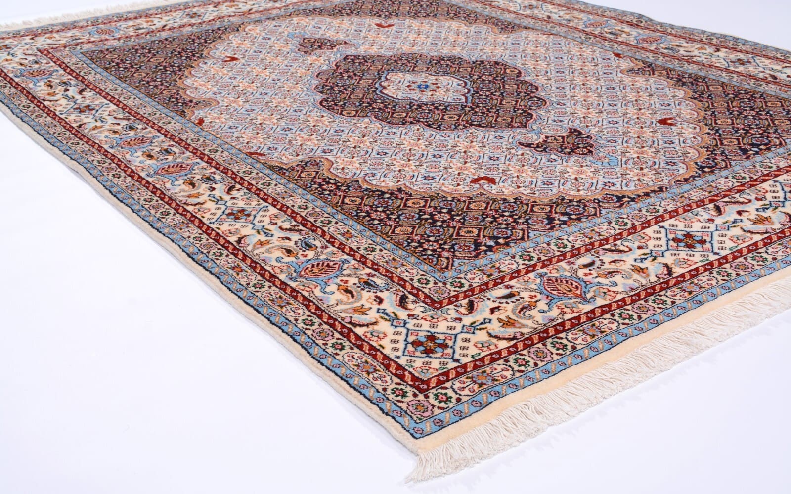 Handgeknüpfter Perserteppich Moud | Größe: 195×146 cm | Knotendichte: 375.000 Knoten/m² | Material: 100% Schurwolle | Kette: 100% Baumwolle | Zustand: Neu | Herkunft: Persien | Muster: Orientalisch mit Medaillon | Dicke: ca. 10 mm | Für Fußbodenheizung geeignet | Gewicht: ca. 3 kg/m²