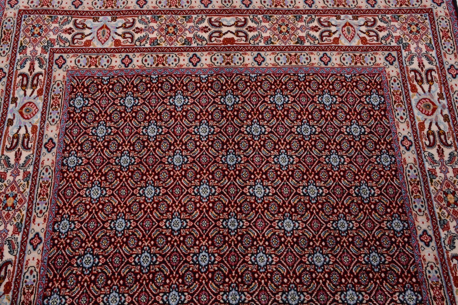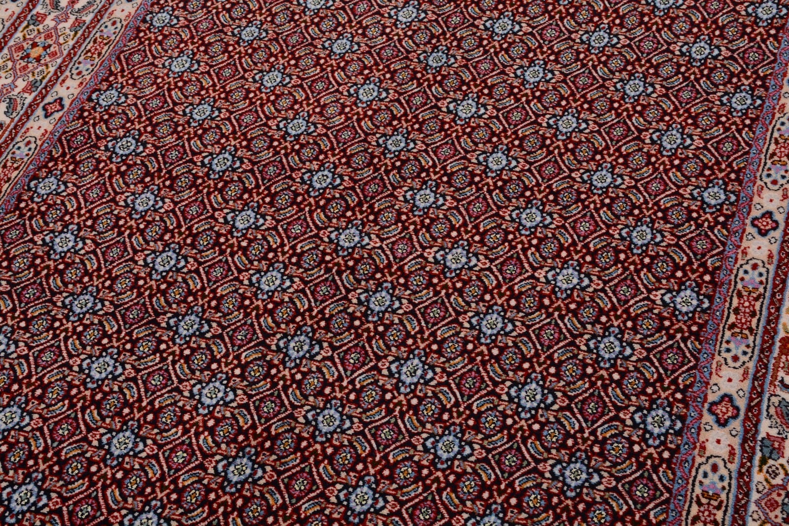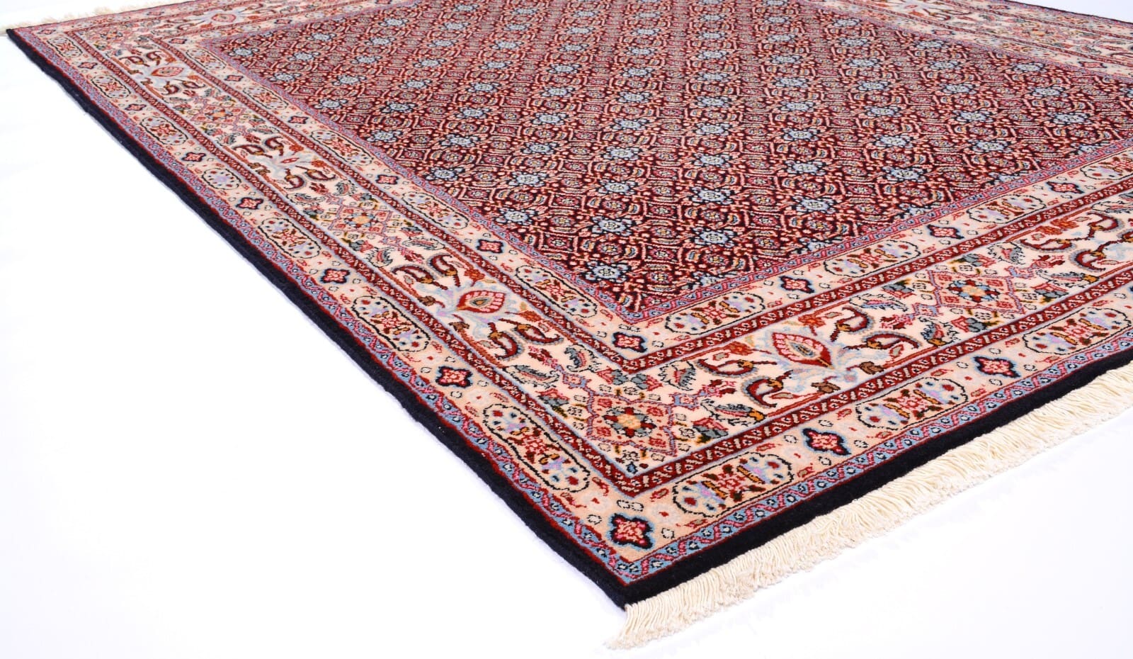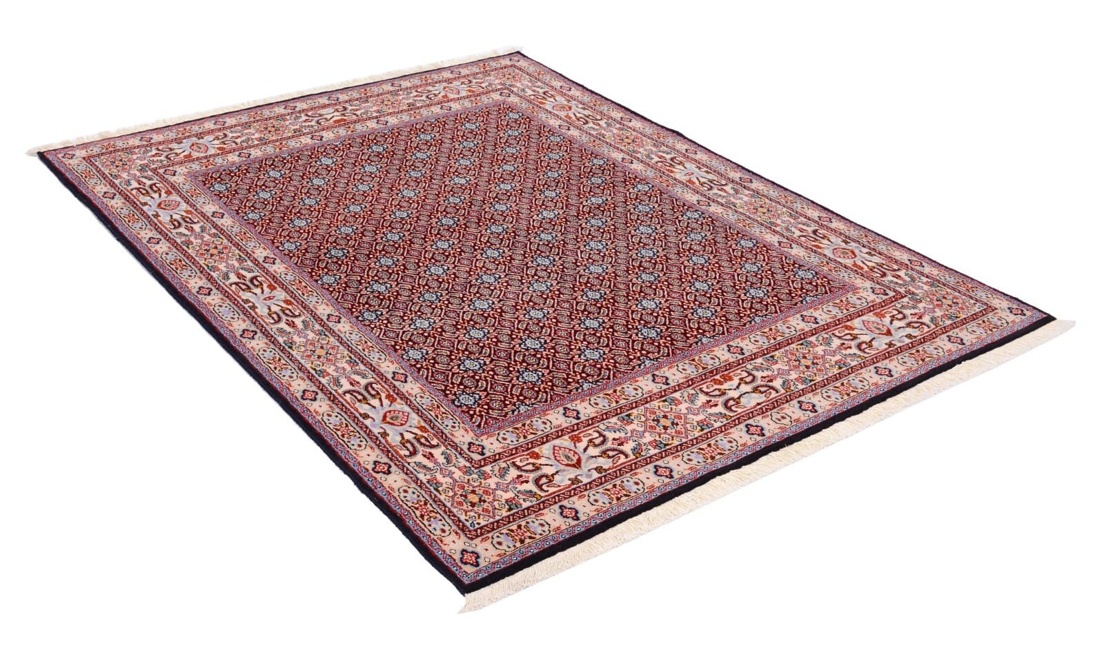 Handgeknüpfter Perserteppich Moud | Größe: 197×146 cm | Knotendichte: 375.000 Knoten/m² | Material: 100% Schurwolle und 100% Baumwolle | Dicke: ca. 10 mm | Zustand: Neu mit Etikett | Herkunft: Nordost-Persien | Farbe: Blau, durchgemustert | Für Fußbodenheizung geeignet | Perfekter Zustand, geschätzter Wert: 1.700,- €